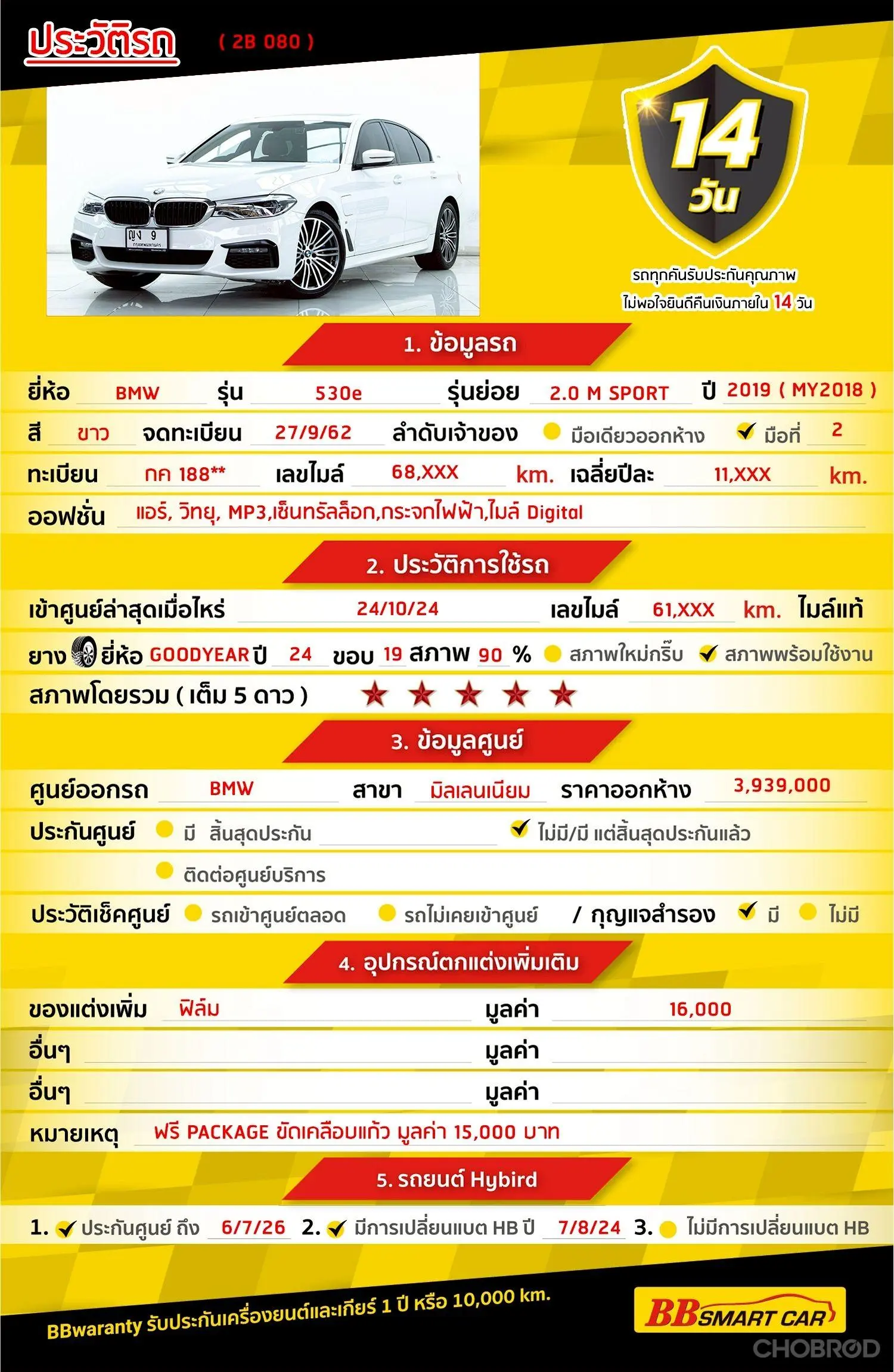 BMW SERIES 5 530e 2.0 M SPORT G30 AT 2019 ออกรถ 0 บาท จัดได้ 1,014,000 บ. Line : @*******แสดงข้อมูล 🔥จอง 199 บาท ส่งบัตรประชาชน รู้ผลอนุมัติภายใน 30 นาที ไม่ผ่านคืนเงินจองทุกกรณี 🔥ซื้อรถกับ BB พร้อมให้คำปรึกษา แก้ทุกปัญหา ให้ทุกเรื่อง บริการ call center 24 ชม. 🔥BB Care Plus รับประกันหลังการขาย สูงสุด 2 ปี หรือ 20,000km. 🔥มีรถให้เลือกมากกว่า 1,800 คัน บีบีสมาร์ทคาร์ 2 สาขาแคราย รหัสรถ 2B080 ราคา 994,000 บาท ผ่อนเพียง 12,853 บาท Brand. : BMW Year. : 2019 Model. : SERIES 5 Grade. : 530e 2.0 M SPORT G30 Engine. : 2000 CC Type. : เบนซิน-ไฟฟ้าแบบเสียบปลั๊ก Gearbox : AT Color. : ขาว Mileage. : 68,700 KM. (ซื้อสด ราคานี้ยังไม่รวมค่าดำเนินการ 10,000 บ.) 🚩 Price. 994,000 บาท ยอดจัด : 1,004,000 บาท เงินดาวน์ : 0 บาท ประกันภัย : ฟรีประกันภัย 1 ปี ค่าดำเนินการ : 10,000 บาท รวมออกรถ : 0 บาท ผ่อน 36 งวด = 29,990 บาท ผ่อน 48 งวด = 22,492 บาท ผ่อน 60 งวด = 17,994 บาท ผ่อน 72 งวด = 14,995 บาท ผ่อน 84 งวด = 12,853 บาท **เงื่อนไขเป็นไปตามที่ไฟแนนซ์กำหนด** โปรโมชั่นพิเศษ สำหรับลูกค้าเครดิตดีลือกรับเรทดอกเบี้ยพิเศษ 📍36 งวด = 1.29 % 📍48 งวด = 1.99 % 📍60 งวด = 2.39 % 📍72 งวด = 3.59 % 🔥 เงื่อนไข โปรโมชั่น ดอกเบี้ยเริ่มต้น 1.29% ตลอดอายุสัญญา - ยอดจัดไฟแนนซ์ 300,000-600,000 บาท - ผ่อนสูงสุด 72 เดือน - เป็นลูกค้าประวัติดี พนักงานประจำเงินเดือน 20,000 ขึ้นไป - ค่าดำเนินการแคมเปญ 20,000 บาท (รวมในยอดจัดได้) 🎗Car Hightlight รถสวยๆ วันนี้ขอแนะนำ BMW SERIES 5 530e 2.0 M SPORT AT 2019 จุดเด่นออฟชั่น 1 : กระจังหน้าทรงไตคู่ที่มีขนาดใหญ่ขึ้น 20% ในรูปทรงแปดเหลี่ยมแบบใหม่ ยาวลงมาบรรจบกับกันชนหน้า ล้อมรอบด้วยกรอบที่เชื่อมต่อกันเป็นชิ้นเดียว 2 : ชุดแต่ง M Aerodynamics และล้ออัลลอย M น้ำหนักเบาลาย Double-spoke ขนาด 18 นิ้ว สำหรับรุ่น 520d M Sport และล้ออัลลอย M น้ำหนักเบาลาย Y-spoke แบบสลับสี 3 : ทำงานร่วมกับมอเตอร์ไฟฟ้าในระบบขับเคลื่อนปลั๊กอินไฮบริด ส่งกำลังรวมสูงสุดถึง 215 กิโลวัตต์ / 292 แรงม้า 🎗ภายใน ทำงานร่วมกับมอเตอร์ไฟฟ้าในระบบขับเคลื่อนปลั๊กอินไฮบริด ส่งกำลังรวมสูงสุดถึง 215 กิโลวัตต์ / 292 แรงม้า และแรงบิดรวมสูงสุด 420 นิวตันเมตร และสามารถเพิ่มกำลังส่งในการเร่งความเร็วได้มากยิ่งขึ้นด้วยระบบ XtraBoost ซึ่งปลดปล่อยพละกำลังเสริมมากถึง 40 แรงม้า ภายในเวลาเพียง 10 วินาทีเมื่อขับขี่ในโหมด SPORT จึงสามารถโลดแล่นจาก 0 ถึง 100 กิโลเมตรได้ภายใน 5.9 วินาที ทำความเร็วสูงสุดที่ 235 กิโลเมตรต่อชั่วโมง 🎗ภายนอก คัวรถสีขาวสวยเรียบหรูมาพร้อมชุดแต่ง M Aerodynamics และล้ออัลลอย M น้ำหนักเบาลาย Double-spoke ขนาด 18 นิ้ว สำหรับรุ่น 520d 🎗ความคุ้มค่า สำหรับคันนี้หากเปรียบเทียบราคากับคุณภาพ คันนี้ถือว่าคุ้มค่ามากค่ะ ผ่อนสบายๆก็มีรถขับได้ รถดีมีคุณภาพแบบนี้รีบตัดสินใจซื้อได้เลราคานี้มาไวไปไวนะคะ ⭐️การรับประกันหลังการขาย BB Care Plus สูงสุด 2 ปี หรือ 20,000 km. ด้วยช่างที่ผ่านการอบรมจากศูนย์ชั้นนำของประเทศ 