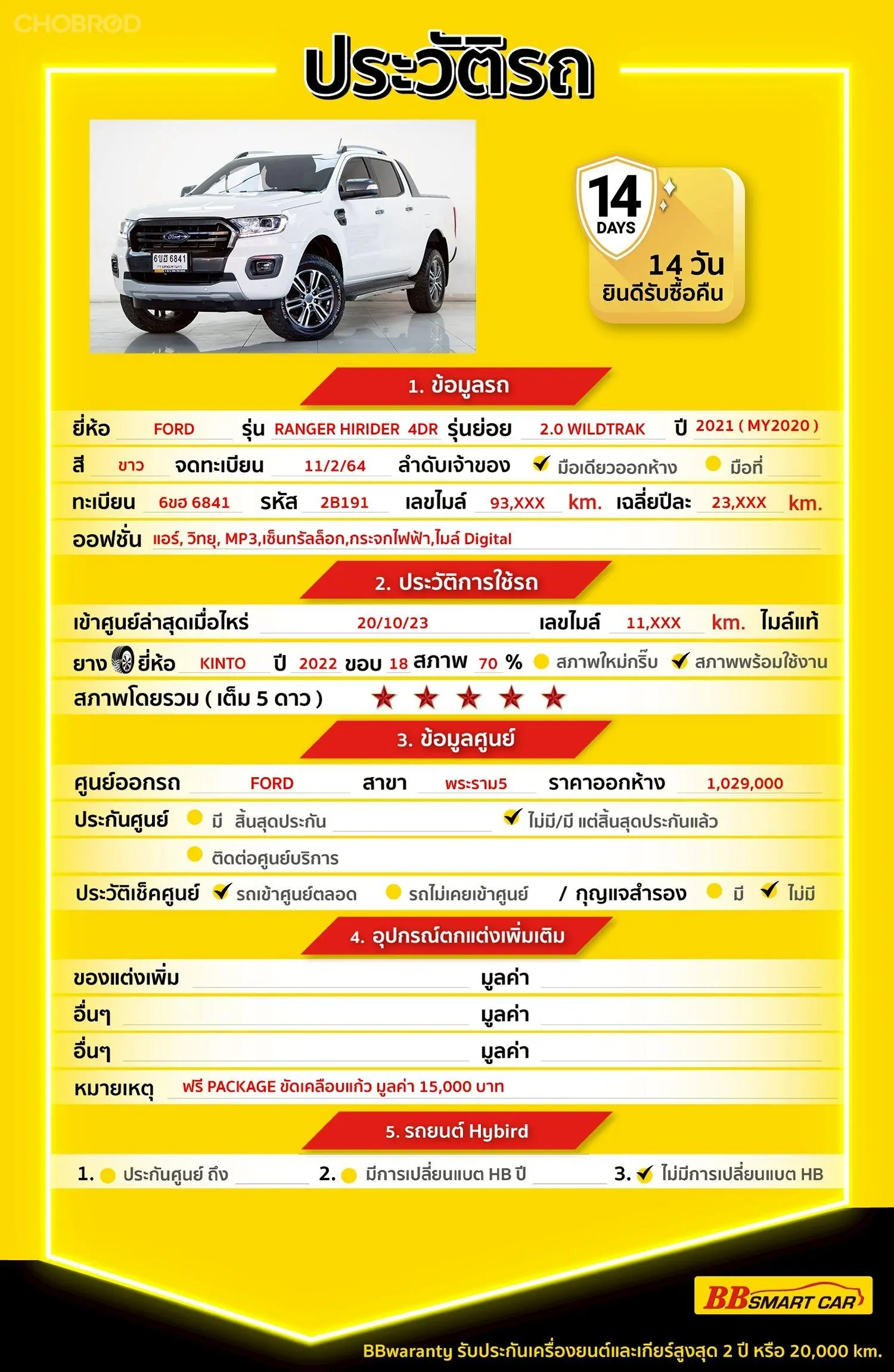 FORD RANGER 2.0 BI-TURBO WILDTRAK HI-RIDER DOUBLE CAB AT 2021 ออกรถ 0 บาท จัดได้ 514,000 บ. Line:@bbcar02 🔥จอง 199 บาท ส่งบัตรประชาชน รู้ผลอนุมัติภายใน 30 นาที ไม่ผ่านคืนเงินจองทุกกรณี 🔥ซื้อรถกับ BB พร้อมให้คำปรึกษา แก้ทุกปัญหา ให้ทุกเรื่อง บริการ call center 24 ชม. 🔥BB Care Plus รับประกันหลังการขาย สูงสุด 2 ปี หรือ 20,000km. 🔥มีรถให้เลือกมากกว่า 1,800 คัน สาขา2 สี่แยกแครายใกล้เดอะมอลล์งามวงศ์วาน รหัสรถ 2B191 ราคา 494,000 บ. ผ่อนเพียง 8,521 บ. Brand. : FORD Year. : 2021 Model. : RANGER Grade. : 2.0 BI-TURBO WILDTRAK HI-RIDER 4DR Engine. : 2000 CC. Type. : ดีเซล Gearbox. : AT Color. : ขาว Mileage. : 93,200 km. (ซื้อสด ราคานี้ยังไม่รวมค่าดำเนินการ 10,000 บ.) 🚩 Price. 494,000 บาท ยอดจัด : 504,000 บาท เงินดาวน์. : ฟรีดาวน์ ประกันภัย : ฟรีประกันภัย 1 ปี ค่าดำเนินการ : 10,000 รวมออกรถ 0 บาท ผ่อน36 = 16,395 บาท ผ่อน48 = 12,613 บาท ผ่อน60 = 10,480 บาท ผ่อน72 = 9,375 บาท ผ่อน84 = 8,521 บาท **เงื่อนไขเป็นไปตามที่ไฟแนนซ์กำหนด** โปรโมชั่นพิเศษ สำหรับลูกค้าเครดิตดี เลือกรับเรทดอกเบี้ยพิเศษ 📍36 งวด = 1.29 % 📍48 งวด = 1.99 % 📍60 งวด = 2.39 % 📍72 งวด = 3.59 % 🔥 เงื่อนไข โปรโมชั่น ดอกเบี้ยเริ่มต้น 1.29% ตลอดอายุสัญญา - ยอดจัดไฟแนนซ์ 300,000-600,000 บาท - ผ่อนสูงสุด 72 เดือน - เป็นลูกค้าประวัติดี พนักงานประจำเงินเดือน 20,000 ขึ้นไป - ค่าดำเนินการแคมเปญ 20,000 บาท (รวมในยอดจัดได้) 🎗Car Hightlight. รถสวยๆ วันนี้ขอแนะนำ FORD RANGER รูปลักษณ์โดดเด่นสะดุดตาบ่งบอกเอกลักษณ์ความเป็นตัวตนของคนใช้งานได้เป็นอย่างดี สำหรับการขนส่งก็บรรทุกหนักได้ดี จอดในที่ลาดเอียงรถก็ยังสามารถรักษาระดับได้โดยเอียงเพียงเล็กน้อยถือว่ามั่นคงพอสมควรอีกทั้งยังมีเทคโนโลยีความปลอดภัยให้มาเสริมความมั่นใจอีกด้วย 🎗ภายใน. สำหรับ FORD RANGER ภายในก็ตกแต่งหรูหราฟังก์ชั่นสารพัดก็มีเพียบพร้อมไม่ต่างอะไรกับรถเก๋งเลย ห้องโดยสารเงียบเก็บเสียงดีมาก มาพร้อม เบาะหนังแท้ วิทยุ - CD แอร์ AUTO กระจกไฟฟ้า Cruise Control พวงมาลัยเพาเวอร์ Airbag แอร์ ไมล์ Digital พวงมาลัย Multifunction กระจกมองข้างปรับไฟฟ้า เบรค ABS เซ็นทรัลล๊อก 🎗ภายนอก. สำหรับรถคันนี้ การขับเดินทางไกลค่อนข้างดี รถสูง ยางหนา เหมาะกับสภาพถนนเมืองไทย ช่วงล่างแน่น เวลาขับเข้าโค้งเกาะถนนดีแม้ขับขี่ขณะฝนตกขับขึ้นลงเขาได้แบบสบาย ทำอัตราเร่งดี ส่วนในเมืองขับเรื่อยๆ ก็เหมือนรถคันใหญ่ทั่วไป ไฟตัดหมอก ล้อแม็ก ไฟเลี้ยวกระจกมองข้าง กระจกมองข้างพับไฟฟ้า 🎗ความคุ้มค่า สำหรับคันนี้หากเปรียบเทียบราคากับคุณภาพ ถือว่าคุ้มค่ามากครับ ผ่อนสบายๆก็มีรถขับได้ รถดีมีคุณภาพแบบนี้รีบตัดสินใจซื้อได้เลย ราคานี้มาไวไปไวนะคะ ⭐️การรับประกันหลังการขาย BB Care Plus สูงสุด 2 ปี หรือ 20,000 km. ด้วยช่างที่ผ่านการอบรมจากศูนย์ชั้นนำของประเทศ 🎉🎉 Special offer เฉพาะ บีบีสมาร์ทคาร์ ที่นี่ที่เดียว ⭐️ดอกเบี้ยเริ่มต้น 1.29% มีไฟแนนซ์รองรับ