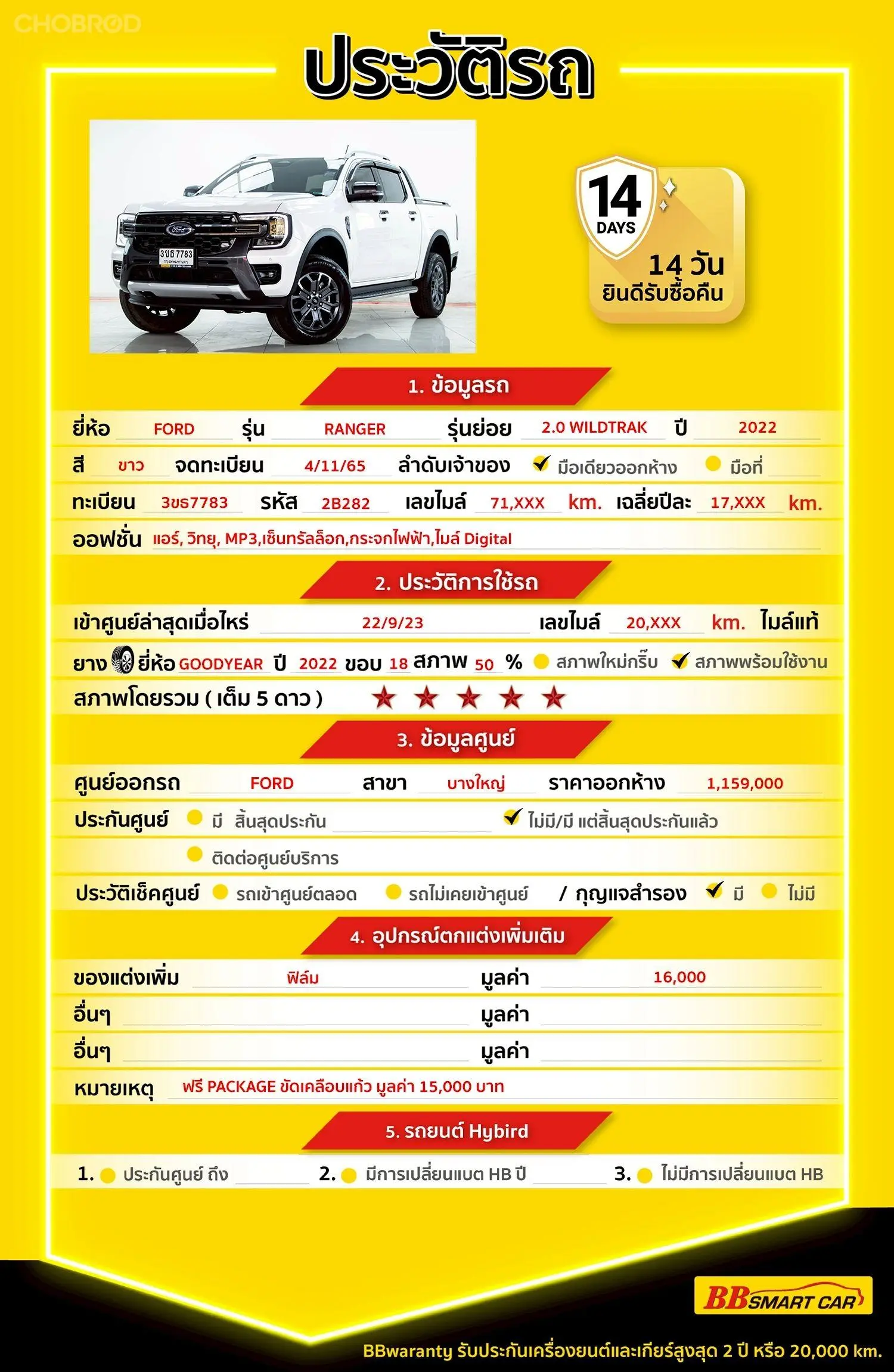 มีการรับประกันจากดีลเลอร์ (6 เดือน) มีบริการช่วยเหลือฉุกเฉินบนท้องถนน 24 ชม. จากดีลเลอร์