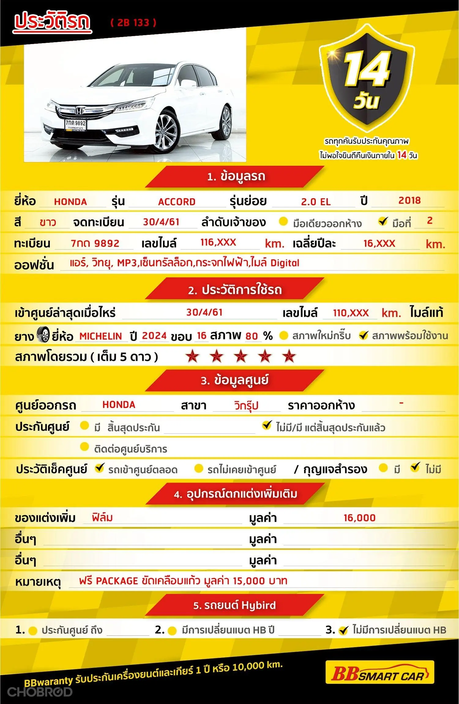 HONDA ACCORD 2.0 EL AT 2018 ออกรถ 0 บาท จัดได้ 529,000 บ. Line: @*******แสดงข้อมูล 🔥จอง 199 บาท ส่งบัตรประชาชน รู้ผลอนุมัติภายใน 30 นาที ไม่ผ่านคืนเงินจองทุกกรณี 🔥ซื้อรถกับ BB พร้อมให้คำปรึกษา แก้ทุกปัญหา ให้ทุกเรื่อง บริการ call center 24 ชม. 🔥BB Care Plus รับประกันหลังการขาย สูงสุด 2 ปี หรือ 20,000km. 🔥มีรถให้เลือกมากกว่า 1,800 คัน บีบีสมาร์ทคาร์ 2 สาขาแคราย รหัสรถ 2B133 ราคา 509,000 บ. ผ่อนเพียง 9,876 บ. Brand. : HONDA Year. : 2018 Model. : ACCORD Grade. : 2.4 EL Engine. : 2000 Type. : เบนซิน Gearbox. : AT Color. : ขาว Mileage. : 116,000 km. (ซื้อสด ราคานี้ยังไม่รวมค่าดำเนินการ 10,000 บ.) 🚩 Price. 509,000 บาท ยอดจัด : 519,000 บาท เงินดาวน์. : 0 บาท ประกันภัย : ฟรีประกันภัย 1 ปี ค่าดำเนินการ : 10,000 บาท รวมออกรถ 0 บาท ผ่อน36 = 17,039 บาท ผ่อน48 = 13,109 บาท ผ่อน60 = 10,892 บาท ผ่อน72 = 9,743 บาท ผ่อน84 = 8,856 บาท **เงื่อนไขเป็นไปตามที่ไฟแนนซ์กำหนด** โปรโมชั่นพิเศษ สำหรับลูกค้าเครดิตดี 🚩เลือกรับเรทดอกเบี้ยพิเศษ 📍36 งวด = 1.29 % 📍48 งวด = 1.99 % 📍60 งวด = 2.39 % 📍72 งวด = 3.59 % 🔥 เงื่อนไข โปรโมชั่น ดอกเบี้ยเริ่มต้น 1.29% ตลอดอายุสัญญา - ยอดจัดไฟแนนซ์ 300,000-600,0000 บาท - ผ่อนสูงสุด 72 เดือน - เป็นลูกค้าประวัติดี พนักงานประจำเงินเดือน 20,000 ขึ้นไป - ค่าดำเนินการแคมเปญ 20,000 บาท (รวมในยอดจัดได้) 🎗Car Hightlight . Honda Accord เวอร์ชั่นปี 2018 ดีไซน์หรูหรา ทันสมัย มาพร้อมความปราดเปลียว ช่วงล่างยังแน่นๆ นั่งสบายสุดๆ 🎗ภายใน. เบรค ABS เซ็นทรัลล๊อก เบาะหนังแท้ กระจกไฟฟ้า แอร์ AUTO ไมล์ Digital กระจกมองข้างปรับไฟฟ้า พวงมาลัย Multifunction Airbag วิทยุ - CD เบาะไฟฟ้าคู่หน้า พวงมาลัยเพาเวอร์ Cruise Control แอร์ 🎗ภายนอก. บอดี้สีขาวสะอาดตา มาพร้อมไฟตัดหมอก ล้อแม็ก กระจกมองข้างพับไฟฟ้า ไฟเลี้ยวกระจกมองข้าง 🎗ความคุ้มค่า. ด้วยรูปลักษณ์ภายนอก ภายใน ที่ดูล้ำสมัย แถมยังมาพร้อมกับเทคโนโลยีใหม่ๆ หลายรายการ มันจึงเป็นรถที่เรียกเสียงฮือฮาในโลกออนไลน์ได้เป็นอย่างมาก ⭐️การรับประกันหลังการขาย BB Care Plus สูงสุด 2 ปี หรือ 20,000 km. ด้วยช่างที่ผ่านการอบรมจากศูนย์ชั้นนำของประเทศ 🎉🎉 Special offer เฉพาะ บีบีสมาร์ทคาร์ ที่นี่ที่เดียว ⭐️ดอกเบี้ยเริ่มต้น 1.29% มีไฟแนนซ์รองรับหลายที่ค่ะ ⭐️ฟรี!! แพคเก็จ ขัดเคลือบแก้ว มูลค่า 15,000 บาท ทุกคัน ⭐️อนุมัติไว 30 นาที นำเอกสารมาให้ครบรับรถกลับบ้านทันทีค่ะ ⭐️BB Care Plus รับประกันหลังการขาย สูงสุด 2 ปี หรือ 20,000 km. ⭐️มี 6 สาขา ในกรุงเทพและปริมณฑลใกล้บ้านท่าน ⭐️รถทุกคันผ่านตรวจสอบ Inspection เรียบแล้วค่ะ ผ่าน 5 ดาวทุกคันค่ะ ⭐️เซลล์ทุกท่านเป็นมืออาชีพพร้อมให้บริการทุกท่านแน่นอนค่ะ เลือกข้อเสนอที่ให้คุณมากกว่าที่อื่น เพราะเราเล็งเห็นแล้ว ที่บีบีสมาร์ทคาร์ ให้คุณได้มากกว่าที่อื่นแน่นอนค่ะ มาที่เดียวจบทุกปัญหา หลากหลายรุ่นให้เลือกกับบริการที่คุณต้องประทับใจแน่นอนค่ะ