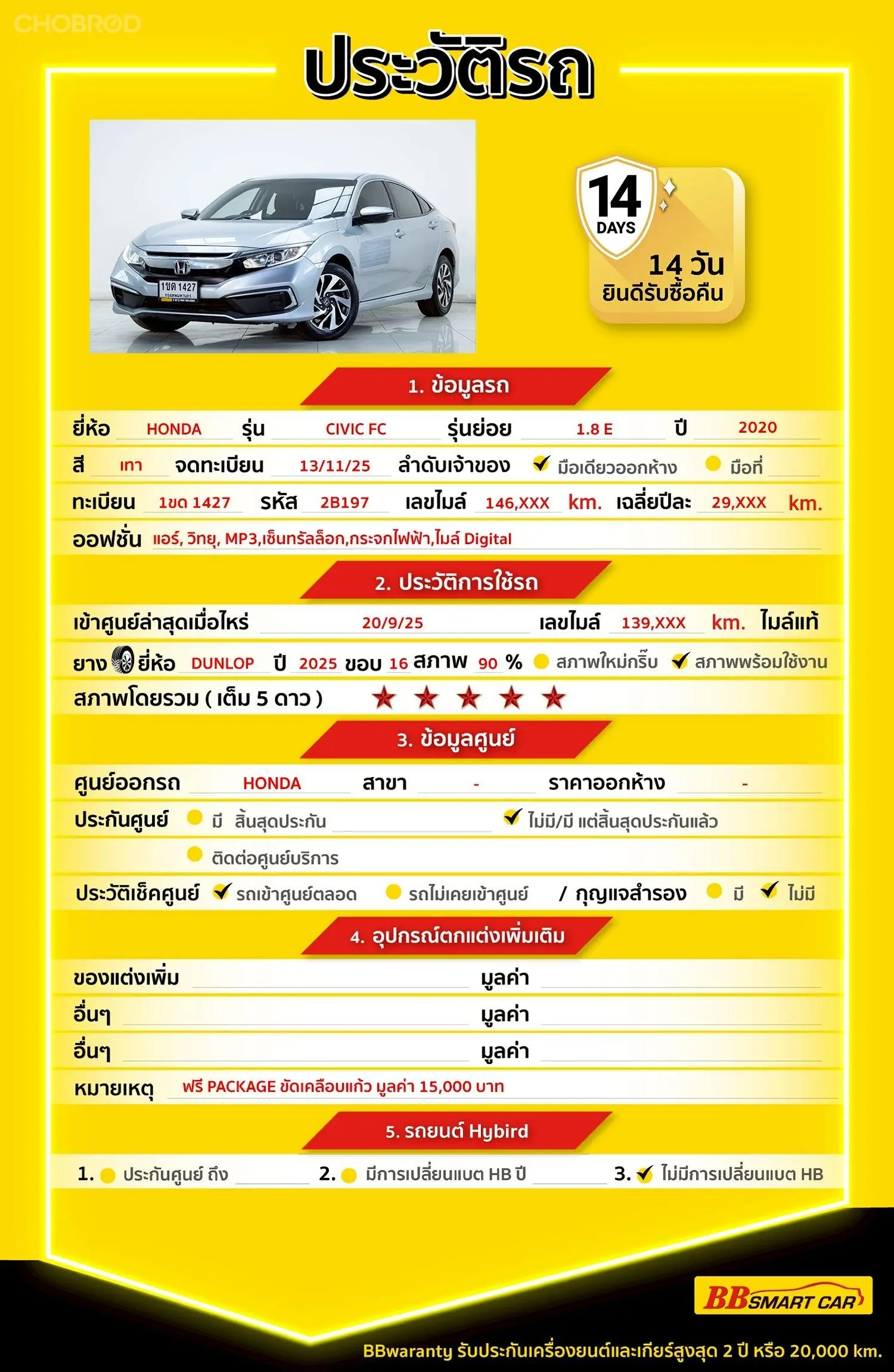 HONDA CIVIC 1.8 E AT 2020 ออกรถ 0 บาท จัดได้ 499,000 บ Line : @bbcar02 🔥จอง 199 บาท ส่งบัตรประชาชน รู้ผลอนุมัติภายใน 30 นาที ไม่ผ่านคืนเงินจองทุกกรณี 🔥ซื้อรถกับ BB พร้อมให้คำปรึกษา แก้ทุกปัญหา ให้ทุกเรื่อง บริการ call center 24 ชม. 🔥BB Care Plus รับประกันหลังการขาย สูงสุด 2 ปี หรือ 20,000km. 🔥มีรถให้เลือกมากกว่า 1,800 คัน สาขา2 สี่แยกแครายใกล้เดอะมอลล์งามวงศ์วาน รหัสรถ 2B197 ราคา 489,000 บ. ผ่อนเพียง 8,355 บ. Brand : HONDA Year : 2020 Model : CIVIC Grade : 1.8 E Engine : 1800 cc. Type : เบนซิน Gearbox : AT Color : เทา Mileage : 146,500 km. (ซื้อสด ราคานี้ยังไม่รวมค่าดำเนินการ 10,000 บ.) 🚩 Price : 489,000 บาท ยอดจัด : 499,000 บาท เงินดาวน์ : ฟรีเงินดาวน์ ประกันภัย : ฟรีประกันภัย 1 ปี ค่าดำเนินการ : 10,000 บาท รวมออกรถ : 0 บาท ผ่อน36 = 17,072 บาท ผ่อน48 = 12,365 บาท ผ่อน60 = 10,274 บาท ผ่อน72 = 9,191 บาท ผ่อน84 = 8,355 บาท **เงื่อนไขเป็นไปตามที่ไฟแนนซ์กำหนด** โปรโมชั่นพิเศษ สำหรับลูกค้าเครดิตดี เลือกรับเรทดอกเบี้ยพิเศษ 📍36 งวด = 1.29 % 📍48 งวด = 1.99 % 📍60 งวด = 2.39 % 📍72 งวด = 3.59 % 🔥 เงื่อนไข โปรโมชั่น ดอกเบี้ยเริ่มต้น 1.29% ตลอดอายุสัญญา - ยอดจัดไฟแนนซ์ 300,000-600,000 บาท - ผ่อนสูงสุด 72 เดือน - เป็นลูกค้าประวัติดี พนักงานประจำเงินเดือน 20,000 ขึ้นไป - ค่าดำเนินการแคมเปญ 20,000 บาท (รวมในยอดจัดได้) 🎗Car Hightlight มาแล้วค่ะ HONDA CIVIC 1.8 E FC ความทันสมัยที่บวกกับความเรียบหรูลงตัว ดูสปอร์ต เบาะหนังสีดำ พร้อมอุปกรณ์อำนวยความสะดวกครบครัน ช่วงล่างที่แน่น ทำให้เกาะถนน และมีการทรงตัวที่ดี ทำให้ขับขี่ได้อย่างมั่นใจและรู้สึกปลอดภัย สภาพป้ายแดงค่ะ ราคาไม่แพง ไมล์แท้ รถดูแลศูนย์ตลอดค่ะ 🎗ภายใน ภายในสะอาดเรียบร้อยกระจกมองข้างปรับไฟฟ้า เบรค ABS กระจกไฟฟ้า เบาะกึ่งหนัง เบรกมือไฟฟ้า พวงมาลัย Multifunction ไมล์ Digital แอร์ Cruise Control Airbag เบาะหนังแท้ อ๊อฟชั่นครบคันเลยค่ะ สภาพใหม่มากค่ะ 🎗ภายนอก ไม่มีชนหนักหรือพลิกคว่ำค่ะ มาพร้อมไฟขาว ไฟตัดหมอก กระจกส่องถอยหลัง กระจกมองข้างพับไฟฟ้า ดูแลรักษาง่าย แถมช่วงล่างยังแน่นๆ ให้ความโดดเด่นเป็นเอกลักษณ์ของ HONDA CIVIC ทดลองขับแล้วช่วงล่างและเครื่องยนต์ยังแน่นค่ะ 🎗ความคุ้มค่า รถสภาพนี้หายากมากค่ะบอกเลย รถมือเดียว ไมล์แท้ อีกด้วย คัดเลือกคันนี้มาแล้วค่ะสภาพดีมากๆ เทียบกับราคานี้ถือว่าคุ้มค่ามากๆค่ะ มาดูรถไม่ผิดหวังแน่นนอนค่ะ ⭐️การรับประกันหลังการขาย BB Care Plus สูงสุด 2 ปี หรือ 20,000 km. ด้วยช่างที่ผ่านการอบรมจากศูนย์ชั้นนำของประเทศ 🎉🎉 Special offer เฉพาะ บีบีสมาร์ทคาร์ ที่นี่ที่เดียว ⭐️ดอกเบี้ยเริ่มต้น 1.29% มีไฟแนนซ์รองรับหลายที่ค่ะ ⭐️ฟรี!! แพคเก็จ ขัดเคลือบแก้ว มูลค่า 15,000 บาท ทุกคัน ⭐️อนุมัติไว 30 นาที นำเอกสารมาให้ครบรับรถกลับบ้านทันทีค่ะ ⭐️BB Care Plus รับประกันหลังการขาย สูงสุด 2 ปี หรือ 20,000 km. ⭐️มี 6 สาขา ในกรุงเทพและปริมณฑลใกล้บ้า
