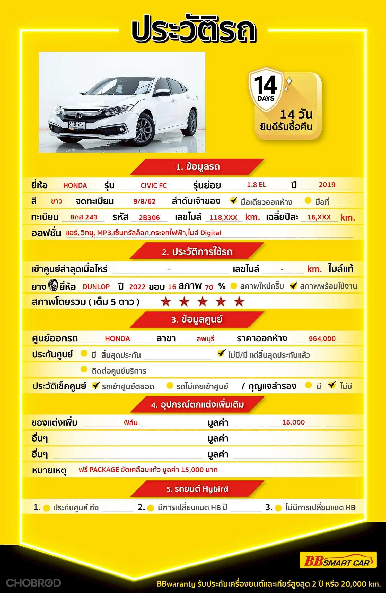 HONDA CIVIC 1.8 EL AT 2019 ออกรถ 0 บาท รหัสรถ 2B306 Line ID : @bbcar02 🔥มีรถให้เลือกมากกว่า 1,800 คัน 🔥รถทุกคันผ่านตรวจสอบ Inspection เรียบแล้วค่ะ ผ่าน 5 ดาวทุกคันค่ะ 🔥ซื้อรถกับ BB พร้อมให้คำปรึกษา แก้ทุกปัญหา ให้ทุกเรื่อง บริการ call center 24 ชม. 🔥BB Care Plus รับประกันหลังการขาย สูงสุด 2 ปี หรือ 20,000 km. 🔥ฟรี!! แพคเก็จ ขัดเคลือบแก้ว มูลค่า 15,000 บาท ทุกคัน 🔥มี 6 สาขา ในกรุงเทพและปริมณฑลใกล้บ้านท่าน บีบีสมาร์ทคาร์ 2 สาขาแคราย รหัสรถ 2B306 ราคา 459,000 บ. ผ่อนเพียง 8,020 บ. Brand. : HONDA Year. : 2019 Model. : CIVIC Grade. : 1.8 EL Engine. : 1800 Type : เบนซิน Gearbox : AT Color. : ขาว Mileage. : 118,400 km. (ซื้อสด ราคานี้ยังไม่รวมค่าดำเนินการ 10,000 บ.) 🚩 Price. 459,000 บาท ยอดจัด : 469,000 บาท เงินดาวน์ : 0 บาท ประกันภัย : ฟรีประกันภัย 1 ปี ค่าดำเนินการ : 10,000 บาท รวมออกรถ : 0 บาท ผ่อน36 = 15,428 บาท ผ่อน48 = 11,870 บาท ผ่อน60 = 9,862 บาท ผ่อน72 = 8,822 บาท ผ่อน84 = 8,020 บาท **เงื่อนไขเป็นไปตามที่บริษัทกำหนด** โปรโมชั่นพิเศษ สำหรับลูกค้าเครดิตดี 🚩เลือกรับเรทดอกเบี้ยพิเศษ 📍36 งวด = 1.29 % 📍48 งวด = 1.99 % 📍60 งวด = 2.39 % 📍72 งวด = 3.59 % 🔥 เงื่อนไข โปรโมชั่น ดอกเบี้ยเริ่มต้น 1.29% ตลอดอายุสัญญา - ยอดจัดไฟแนนซ์ 300,000-600,0000 บาท - ผ่อนสูงสุด 72 เดือน - เป็นลูกค้าประวัติดี พนักงานประจำเงินเดือน 20,000 ขึ้นไป - ค่าดำเนินการแคมเปญ 20,000 บาท (รวมในยอดจัดได้) 🎗Car Hightlight . เครื่องยนต์ 1,800 cc. สวยสะกดทุกสายตาภายใต้รูปลักษณ์ใหม่จากหน้าจรดท้ายที่โดดเด่นเหนือใคร หรูหรา ปราดเปรียว แฝงด้วยความโฉบเฉี่ยว ตามสไตล์ฮอนด้า 🎗ภายใน. ตกแต่งภายในด้วยโทนสีดำ หุ้มเบาะด้วยหนังแท้ มีระบบควบคุมความเร็วอัตโนมัติ ระบบเบรกป้องกันล้อล้อก ABS ระบบกระจายแรงเบรกอิเล็กทรอนิกส์ EBD กระจกไฟฟ้า เบาะหนังแท้ เซ็นทรัลล๊อก เบรค ABS Cruise Control พวงมาลัย Multifunction Airbag พวงมาลัยเพาเวอร์ เบาะไฟฟ้าคนขับ กระจกมองข้างปรับไฟฟ้า วิทยุ - CD ไมล์ Digital แอร์ 🎗ภายนอก. บอดี้รถสีขาว ยอดนิยม ไฟเลี้ยวกระจกมองข้าง ไฟตัดหมอก ล้อแม็ก กระจกมองข้างพับไฟฟ้า 🎗ความคุ้มค่า สำหรับคันนี้หากเปรียบเทียบราคากับคุณภาพ คันนี้ถือว่าคุ้มค่ามากค่ะ ผ่อนสบายๆก็มีรถขับได้ รถดีมีคุณภาพแบบนี้รีบตัดสินใจซื้อได้เลราคานี้มาไวไปไวนะคะ