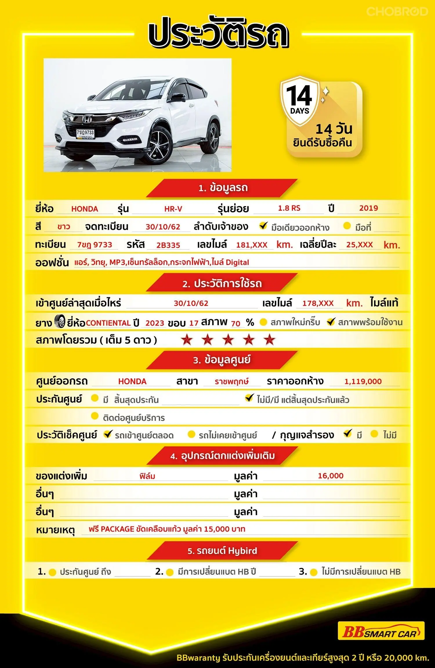 HONDA HR-V 1.8 RS AT 2019 ออกรถ 0 บาท รหัสรถ 2B335 Line : @bbcar02 🔥มีรถให้เลือกมากกว่า 1,800 คัน 🔥รถทุกคันผ่านตรวจสอบ Inspection เรียบแล้วค่ะ ผ่าน 5 ดาวทุกคันค่ะ 🔥ซื้อรถกับ BB พร้อมให้คำปรึกษา แก้ทุกปัญหา ให้ทุกเรื่อง บริการ call center 24 ชม. 🔥BB Care Plus รับประกันหลังการขาย สูงสุด 2 ปี หรือ 20,000 km. 🔥ฟรี!! แพคเก็จ ขัดเคลือบแก้ว มูลค่า 15,000 บาท ทุกคัน 🔥มี 6 สาขา ในกรุงเทพและปริมณฑลใกล้บ้านท่าน สาขา2 สี่แยกแครายใกล้เดอะมอลล์งามวงศ์วาน รหัสรถ 2B335 ราคา 499,000 บ. ผ่อนเพียง 8,521 บ. Brand : HONDA Year : 2019 Model : HR-V Grade : 1.8 RS Engine : 1800 CC. Type : เบนซิน Gearbox : AT Color : ขาว Mileage : 181,800 km. (ซื้อสด ราคานี้ยังไม่รวมค่าดำเนินการ 10,000 บ.) � Price 499,000 บาท ยอดจัด : 509,000 บาท เงินดาวน์ : ฟรีเงินดาวน์ ประกันภัย : ฟรีประกันภัย 1 ปี ค่าดำเนินการ : 10,000 บาท รวมออกรถ : 0 บาท ผ่อน36 = 16,395 บาท ผ่อน48 = 12,613 บาท ผ่อน60 = 10,480 บาท ผ่อน72 = 9,375 บาท ผ่อน84 = 8,521 บาท **เงื่อนไขเป็นไปตามที่ไฟแนนซ์กำหนด** โปรโมชั่นพิเศษ สำหรับลูกค้าเครดิตดี 🚩เลือกรับเรทดอกเบี้ยพิเศษ 📍36 งวด = 1.29 % 📍48 งวด = 1.99 % 📍60 งวด = 2.39 % 📍72 งวด = 3.59 % 🔥 เงื่อนไข โปรโมชั่น ดอกเบี้ยเริ่มต้น 1.29% ตลอดอายุสัญญา - ยอดจัดไฟแนนซ์ 300,000-600,0000 บาท - ผ่อนสูงสุด 72 เดือน - เป็นลูกค้าประวัติดี พนักงานประจำเงินเดือน 20,000 ขึ้นไป - ค่าดำเนินการแคมเปญ 20,000 บาท (รวมในยอดจัดได้) 🎗Car Hightlight Honda HR-V (ฮอนด้า เฮชอาร์-วี) รถอเนกประสงค์ใหม่จากฮอนด้ายังคงเดิมด้วยการผสมผสานระหว่าง รถ SUV จุดเด่นออฟชั่น หลังคาแก้ว Sunroof เปิด-ปิด ไฟฟ้า ชุดแต่ง rs รอบคัน ไฟหน้าแบบ LED กล้องมองรอบคันเฉพาะรุ่น rs 🎗ภายใน เครื่องยนต์เบนซิน 1.8 ลิตร 141 แรงม้า 172 นิวตันเมตร เกียร์อัตโนมัติ CVT ขับเคลื่อนล้อหน้า พวงมาลัยไฟฟ้า EPS เบาะนั่งคนขับ – ผู้โดยสารตอนหน้า ปรับด้วยมือ เบาะนั่งด้านหลังอเนกประสงค์ แยกพับอิสระ 60 : 40 เบาะนั่งด้านหลัง ปรับเอนได้ 1 จังหวะ พนักพิงศีรษะเบาะนั่งด้านหลัง 3 ตำแหน่ง แผงบังแดดคู่หน้า พร้อมกระจกส่องหน้าแบบมีฝาปิด ไฟอ่านแผนที่ด้านหน้า / ไฟส่องสว่างที่เก็บสัมภาระด้านท้าย ช่องชาร์จไฟ 12V หน้าจอเครื่องเสียง ระบบสัมผัส Touchscreen ขนาด 6.8 นิ้ว สวิตซ์ควบคุมเครื่องเสียง รับสาย – โทรออก บนพวงมาลัย ระบบเชื่อมต่อไร้สาย Bluetooth ช่องเชื่อมต่อ USB / HDMI ลำโพง 4 ตำแหน่ง 🎗ภายนอก กระจกมองข้างสีดำตัดกับตัวรถ ไฟตัดหมอก กระจกมองข้างปรับและพับด้วยไฟฟ้า พร้อมไฟเลี้ยวในตัว มือเปิดประตูภายนอก โครเมียม ระบบปัดน้ำฝนด้านหน้า – ด้านหลัง กระจังหน้าโครเมียมรมดำ กันชนหน้า – กันชนหลัง สีดำ ด้านข้างตัวรถ สีดำ คิ้วฝากระโปรงท้ายโครเมียมรมดำ 🎗ความคุ้มค่า เป็นรถที่คุ้มค่าสุดๆ สามารถเหมาะกับการใช้งานยุคปัจจุบัน เราคัดเลือกสภาพรถคันนี้มาแล้ว สภาพดีมากๆ เทียบกับราคานี้ถือว่าคุ้มค่าสุดๆ ไป