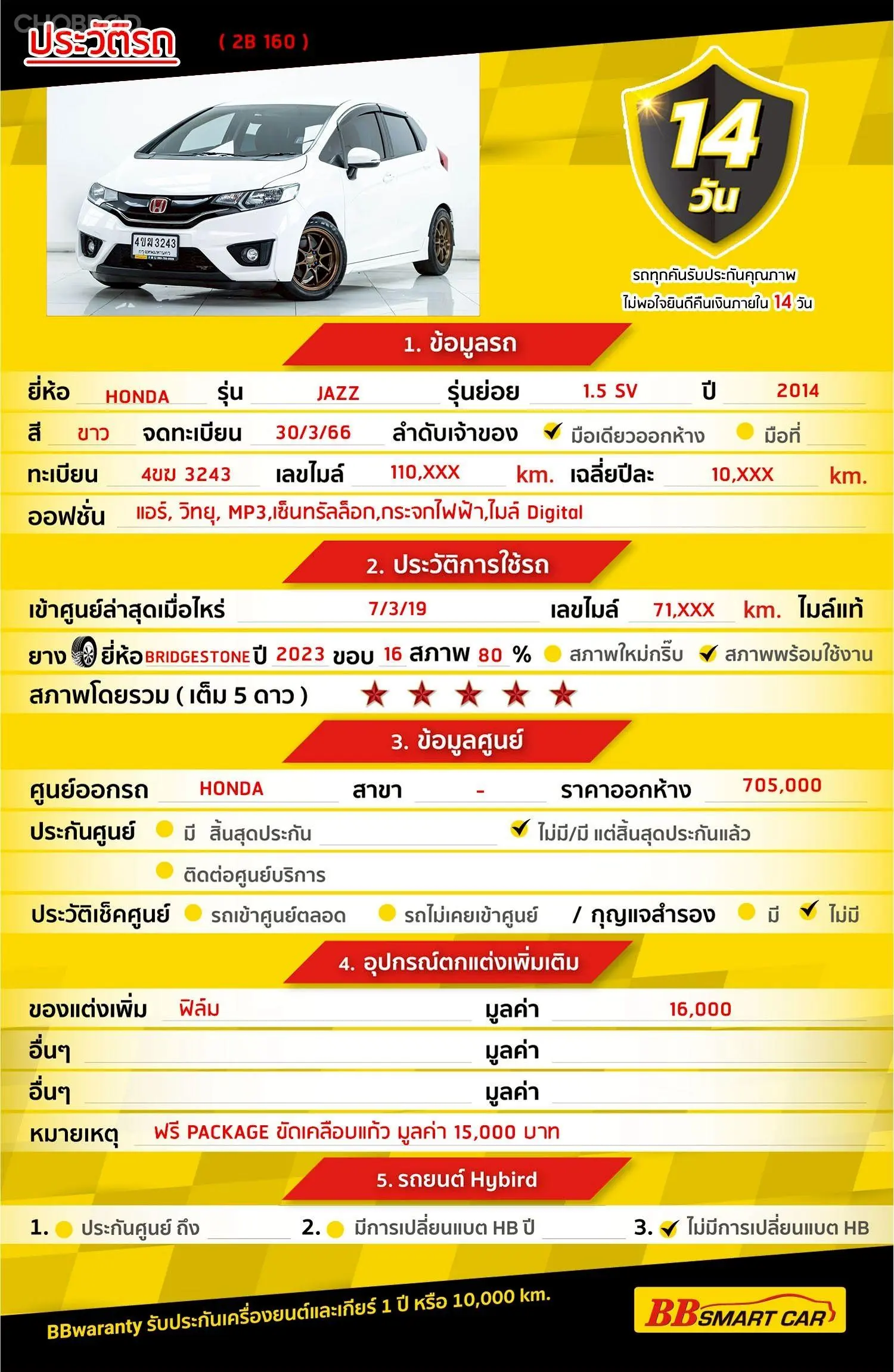 HONDA JAZZ 1.5 SV AT 2014 ออกรถ 0 บาท จัดได้ 369,000 บ Line : @*******แสดงข้อมูล 🔥จอง 199 บาท ส่งบัตรประชาชน รู้ผลอนุมัติภายใน 30 นาที ไม่ผ่านคืนเงินจองทุกกรณี 🔥ซื้อรถกับ BB พร้อมให้คำปรึกษา แก้ทุกปัญหา ให้ทุกเรื่อง บริการ call center 24 ชม. 🔥BB Care Plus รับประกันหลังการขาย สูงสุด 2 ปี หรือ 20,000 km. 🔥มีรถให้เลือกมากกว่า 1,800 คัน สาขา2 สี่แยกแครายใกล้เดอะมอลล์งามวงศ์วาน รหัสรถ 2B160 ราคา 349,000 บาท ผ่อนเพียง 6,814 บาท Brand. : HONDA Year. : 2014 Model. : JAZZ Grade. : 1.5 SV Engine. : 1500 Type. : เบนซิน Gearbox. : AT Color. : ขาว Mileage. : 110,300 KM. (ซื้อสด ราคานี้ยังไม่รวมค่าดำเนินการ 10,000 บ.) 🚩 Price. 349,000 บาท ยอดจัด : 359,000 บาท เงินดาวน์ : 0 บาท ประกันภัย : ฟรีประกันภัย 1 ปี ค่าดำเนินการ : 10,000 บาท รวมออกรถ : 0 บาท ผ่อน 36 งวด = 11,951 บาท ผ่อน 48 งวด = 9,283 บาท ผ่อน 60 งวด = 8,163 บาท ผ่อน 72 งวด = 7,256 บาท ผ่อน 84 งวด = 6,814 บาท **เงื่อนไขเป็นไปตามที่ไฟแนนซ์กำหนด** โปรโมชั่นพิเศษ สำหรับลูกค้าเครดิตดี 🚩เลือกรับเรทดอกเบี้ยพิเศษ 📍36 งวด = 1.29 % 📍48 งวด = 1.99 % 📍60 งวด = 2.39 % 📍72 งวด = 3.59 % 🔥 เงื่อนไข โปรโมชั่น ดอกเบี้ยเริ่มต้น 1.29% ตลอดอายุสัญญา - ยอดจัดไฟแนนซ์ 300,000-600,0000 บาท - ผ่อนสูงสุด 72 เดือน - เป็นลูกค้าประวัติดี พนักงานประจำเงินเดือน 20,000 ขึ้นไป - ค่าดำเนินการแคมเปญ 20,000 บาท (รวมในยอดจัดได้) 🎗Car Hightlight รถสวยๆ วันนี้ขอแนะนำ HONDA NEW JAZZ 1.5 SV AT เบนซิน 1 : พวงมาลัยMuiltifunction 2 : ไมล์สถานะรถDigital 3 : แอร์ Digital 🎗ภายใน – กระจกมองข้างปรับไฟฟ้า พวงมาลัยเพาเวอร์ Cruise Control เบาะหนังแท้ พวงมาลัย Multifunction แอร์ วิทยุ - CD กระจกไฟฟ้า Airbag เบรค ABS ไมล์ Digital เซ็นทรัลล๊อก 🎗ภายนอก บอดี้รถสีขาว กระจกมองข้างสีเดียวกับตัวรถ ไฟเลี้ยวกระจกมองข้าง ไฟตัดหมอก กระจกมองข้างพับไฟฟ้า ล้อแม็ก ⭐️การรับประกันหลังการขาย BB Care Plus สูงสุด 2 ปี หรือ 20,000 km. ด้วยช่างที่ผ่านการอบรมจากศูนย์ชั้นนำของประเทศ 🎉🎉 Special offer เฉพาะ บีบีสมาร์ทคาร์ ที่นี่ที่เดียว ⭐️ดอกเบี้ยเริ่มต้น 1.29% มีไฟแนนซ์รองรับหลายที่ค่ะ ⭐️ฟรี!! แพคเก็จ ขัดเคลือบแก้ว มูลค่า 15,000 บาท ทุกคัน ⭐️อนุมัติไว 30 นาที นำเอกสารมาให้ครบรับรถกลับบ้านทันทีค่ะ ⭐️BB Care Plus รับประกันหลังการขาย สูงสุด 2 ปี หรือ 20,000 km. ⭐️มี 6 สาขา ในกรุงเทพและปริมณฑลใกล้บ้านท่าน ⭐️รถทุกคันผ่านตรวจสอบ Inspection เรียบแล้วค่ะ ผ่าน 5 ดาวทุกคันค่ะ ⭐️เซลล์ทุกท่านเป็นมืออาชีพพร้อมให้บริการทุกท่านแน่นอนค่ะ เลือกข้อเสนอที่ให้คุณมากกว่าที่อื่น เพราะเราเล็งเห็นแล้ว ที่บีบีสมาร์ทคาร์ ให้คุณได้มากกว่าที่อื่นแน่นอนค่ะ มาที่เดียวจบทุกปัญหา หลากหลายรุ่นให้เลือกกับบริการที่คุณต้องประทับใจแน่นอนค่ะ