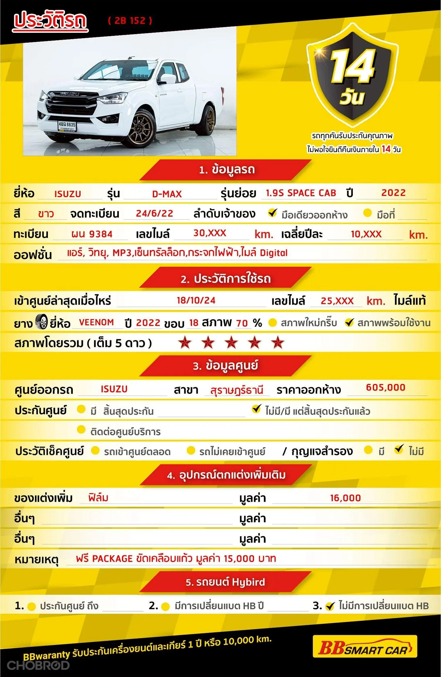 ISUZU D-MAX 1.9 S SPACECAB AT 2022 ออกรถ 0 บาท จัดได้ 449,000 บ Line : @*******แสดงข้อมูล 🔥จอง 199 บาท ส่งบัตรประชาชน รู้ผลอนุมัติภายใน 30 นาที ไม่ผ่านคืนเงินจองทุกกรณี 🔥ซื้อรถกับ BB พร้อมให้คำปรึกษา แก้ทุกปัญหา ให้ทุกเรื่อง บริการ call center 24 ชม. 🔥BB Care Plus รับประกันหลังการขาย สูงสุด 2 ปี หรือ 20,000km. 🔥มีรถให้เลือกมากกว่า 1,800 คัน บีบีสมาร์ทคาร์ 2 สาขาแคราย รหัสรถ 2B152 ราคา 429,000 บ. ผ่อนเพียง 7,350 บ. Brand. : ISUZU Year. : 2022 Model. : D-MAX Grade. :1.9 S SPACECAB Engine. : 1900 Type. : ดีเซล Gearbox. : AT Color. : ขาว Mileage. : 30,400 km. (ซื้อสด ราคานี้ยังไม่รวมค่าดำเนินการ 10,000 บ.) 🚩 Price 429,000 บาท ยอดจัด : 439,000 บาท เงินดาวน์. : 0 บาท ประกันภัย : ฟรีประกันภัย 1 ปี ค่าดำเนินการ : 10,000 บาท รวมออกรถ 0 บาท ผ่อน 36 งวด = 14,140 บาท ผ่อน 48 งวด = 10,879 บาท ผ่อน 60 งวด = 9,038 บาท ผ่อน 72 งวด = 8,086 บาท ผ่อน 84 งวด = 7,350 บาท **เงื่อนไขเป็นไปตามที่ไฟแนนซ์กำหนด** โปรโมชั่นพิเศษ สำหรับลูกค้าเครดิตดี 🚩เลือกรับเรทดอกเบี้ยพิเศษ 📍36 งวด = 2.59% 📍48 งวด = 2.89% 📍60 งวด = 3.29% 📍72 งวด = 4.49% 🔥 เงื่อนไข โปรโมชั่น ดอกเบี้ยเริ่มต้น 2.59% ตลอดอายุสัญญา - ยอดจัดไฟแนนซ์ 300,000-600,0000 บาท - ผ่อนสูงสุด 72 เดือน - เป็นลูกค้าประวัติดี - ค่าดำเนินการแคมเปญ 20,000 บาท (รวมในยอดจัดได้) 🎗Car Hightlight.มาแล้วค่ะ !! ISUZU D-MAX SPACECAB เครื่องยนต์ดีเซล กระบะสายพันธ์แกร่ง สภาพสวยทุกรายละเอียด รถสวยจริงๆค่ะ เอาไปพร้อมขับได้เลยค่ะ 🎗ภายใน. เบาะหน้าเป็นเบาะหนังสีดำ มาพร้อมฟังก์ชั่น เบาะกำมะหยี่ แอร์ กระจกไฟฟ้า ไมล์ Digital Airbag กระจกมองข้างปรับไฟฟ้า เบรค ABS Cabสามารถเปิดได้ 🎗ภายนอก. บอดี้รถสีขาว มาพร้อมกับไฟหน้าMulti reflector กระจกมองข้างพับไฟฟ้า ไฟท้ายแบบมาตรฐาน กระจังหน้าสีเทาดำ กันชนหน้าสีเดียวกับตัวรถ ล้อแม็ก ไฟตัดหมอก 🎗ความคุ้มค่า. เป็นแบรนด์ที่ซื้อง่ายขายคล่อง ดูแลง่ายมากๆค่ะ ศูนย์บริการก็เยอะ มีทั่วประเทศอะไหล่หาง่ายทั้งนอกและในศูนย์ เหมาะกับการนำไปใช้ประกอบอาชีพได้ เทียบกับราคานี้ถือว่าคุ้มค่ามากๆเลยค่ะ ⭐️การรับประกันหลังการขาย BB Care Plus สูงสุด 2 ปี หรือ 20,000 km. ด้วยช่างที่ผ่านการอบรมจากศูนย์ชั้นนำของประเทศ 🎉🎉 Special offer เฉพาะ บีบีสมาร์ทคาร์ ที่นี่ที่เดียว ⭐️ดอกเบี้ยเริ่มต้น 2.59% มีไฟแนนซ์รองรับหลายที่ค่ะ ⭐️ฟรี!! แพคเก็จ ขัดเคลือบแก้ว มูลค่า 15,000 บาท ทุกคัน ⭐️อนุมัติไว 30 นาที นำเอกสารมาให้ครบรับรถกลับบ้านทันทีค่ะ ⭐️BB Care Plus รับประกันหลังการขาย สูงสุด 2 ปี หรือ 20,000 km. ⭐️มี 6 สาขา ในกรุงเทพและปริมณฑลใกล้บ้านท่าน ⭐️รถทุกคันผ่านตรวจสอบ Inspection เรียบแล้วค่ะ ผ่าน 5 ดาวทุกคันค่ะ ⭐️เซลล์ทุกท่านเป็นมืออาชีพพร้อมให้บริการทุกท่านแน่นอนค่ะ