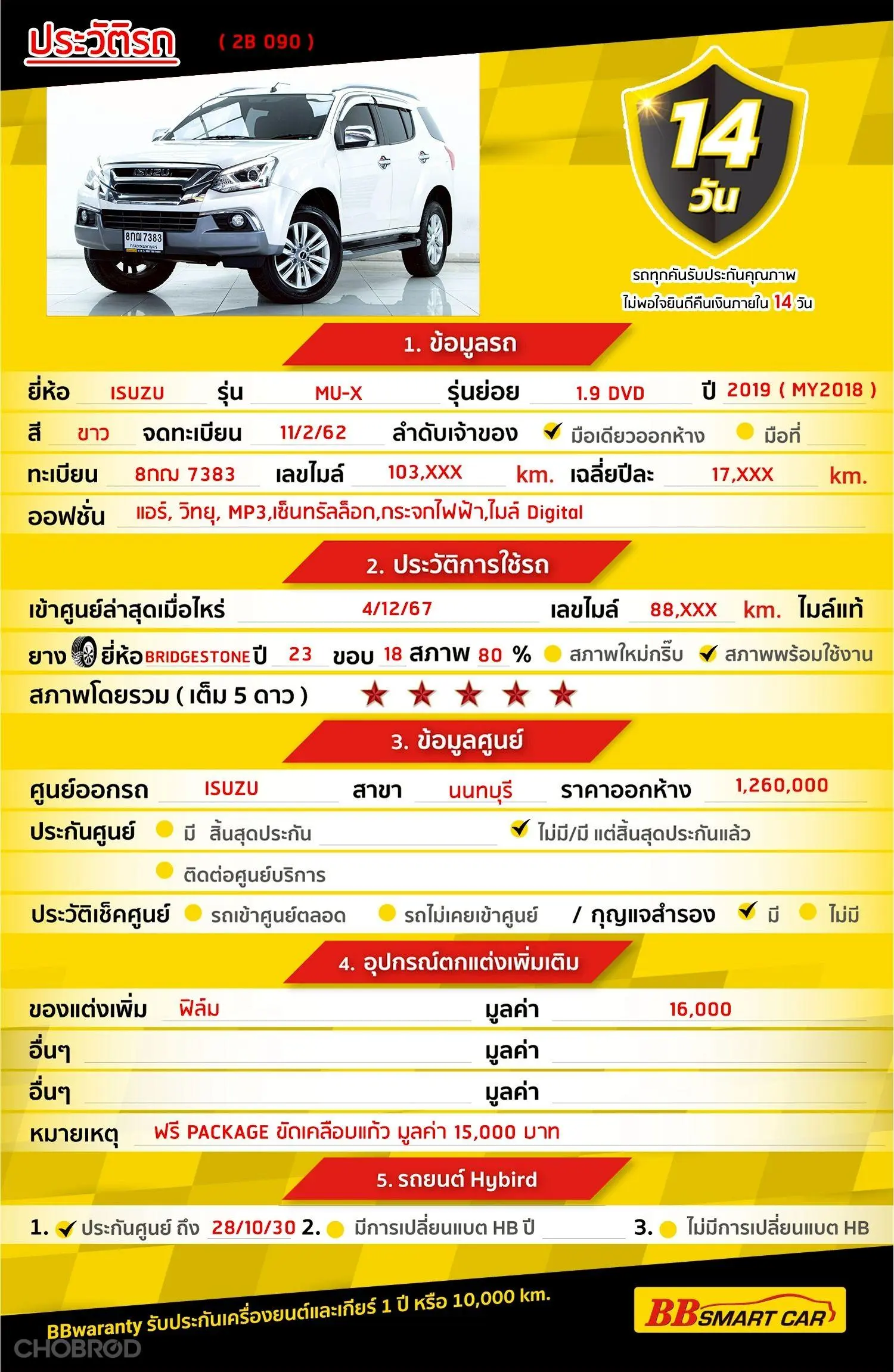 ISUZU MU-X 1.9 DVD AT 2019 ออกรถ 0 บาท จัดได้ 589,000 บ Line : @*******แสดงข้อมูล 🔥เรามีรถรุ่นนี้ให้เลือกชมอีก 4 คัน 🔥รถมือเดียวออกห้าง ไมล์น้อยเช็คศูนย์ตลอด 🔥ราคา 569,000 บาท จัดได้ 589,000 บาท(สามารถจัดเต็มวงเงินได้) 🔥รับประกันคุณภาพ ไม่พอใจยินดีคืนเงินภายใน 14วัน ที่เดียวในประเทศ 🔥พิเศษดอกเบี้ยเริ่มต้น 1.29% 🔥จอง 199 บาท ส่งบัตรประชาชน รู้ผลอนุมัติภายใน 30 นาที ไม่ผ่านคืนเงินจองทุกกรณี 🔥ซื้อรถกับ BB พร้อมให้คำปรึกษา แก้ทุกปัญหา ให้ทุกเรื่อง บริการ call center 24 ชม. 🔥BB Care Plus รับประกันหลังการขาย สูงสุด 2 ปี หรือ 20,000km. 🔥มีรถให้เลือกมากกว่า 1,500 คัน บีบีสมาร์ทคาร์ 2 สาขาแคราย รหัสรถ 2B090 ราคา 564,000 บาท ผ่อนเพียง 9,693 บาท Brand. : ISUZU Year. : 2019 Model. : MU-X Grade. : 1.9 DVD Engine. : 1900 CC Type. : ดีเซล Gearbox : AT Color. : ขาว Mileage. : 103,000 KM. (ซื้อสด ราคานี้ยังไม่รวมค่าดำเนินการ 10,000 บ.) 🚩 Price. 564,000 บาท ยอดจัด : 574,000 บาท เงินดาวน์ : 0 บาท ประกันภัย : ฟรีประกันภัย 1 ปี ค่าดำเนินการ : 10,000 บาท รวมออกรถ : 0 บาท ผ่อน 36 งวด = 18,650 บาท ผ่อน 48 งวด = 14,348 บาท ผ่อน 60 งวด = 11,921 บาท ผ่อน 72 งวด = 10,665 บาท ผ่อน 84 งวด = 9,693 บาท เงื่อนไขเป็นไปตามที่ไฟแนนซ์กำหนด โปรโมชั่นพิเศษ สำหรับลูกค้าเครดิตดี 🚩รับเรทดอกเบี้ยพิเศษ 📍36 งวด = 1.29 % 📍48 งวด = 1.99 % 📍60 งวด = 2.39 % 📍72 งวด = 3.59 % 🔥 เงื่อนไข โปรโมชั่น ดอกเบี้ยเริ่มต้น 1.29% ตลอดอายุสัญญา - ยอดจัดไฟแนนซ์ 300,000-600,0000 บาท - ผ่อนสูงสุด 72 เดือน - เป็นลูกค้าประวัติดี พนักงานประจำเงินเดือน 20,000 ขึ้นไป - ค่าดำเนินการแคมเปญ 20,000 บาท (รวมในยอดจัดได้) 🎗Car Hightlight รถสวยๆ วันนี้ขอแนะนำ ISUZU MU-X 1.9 DVD AT ดีเซล จุดเด่นออฟชั่น 1 : เบาะหนังดำปรับไฟฟ้า 2 : ระบบแอร์ดิจิตอล 3 : กระจังหน้าโครเมี่ยม 🎗ภายใน เบาะหนังสีดำ ตกแต่งภายในโทนสีดำ ปลั๊กไฟ 12 โวลท์ (2 จุด) พวงมาลัยหุ้มหนัง (ตกแต่งด้วยสีเงินแบบทูโทน) พวงมาลัยปรับสูง-ต่ำได้ ขณะขับขี่ที่กระจกมองหลัง DVR (Drive Recorder Mirror) แบบ Built-In) Airbag กระจกไฟฟ้า ไมล์ Digital เซ็นทรัลล๊อก พวงมาลัยเพาเวอร์ แอร์ วิทยุ - CD กระจกมองข้างปรับไฟฟ้า เบรค ABS 🎗ภายนอก อุปกรณ์ชุดแต่ง (บันไดข้าง กันชนหน้า-หลัง ) สปอยเลอร์หลังพร้อมไฟเบรค กระจกมองข้างพร้อมไฟเลี้ยว (แบบ LED) ไฟตัดหมอก ปัดน้ำฝนกระจกหลัง อุปกรณ์ที่มีสีเดียวกับตัวรถ (กันชนหน้า-หลัง) ระบบไล่ฝ้ากระจกหลัง ราวหลังคา (แบบ Roof Rail) 🎗ความคุ้มค่า สำหรับคันนี้หากเปรียบเทียบราคากับคุณภาพ คันนี้ถือว่าคุ้มค่ามากค่ะ ผ่อนสบายๆก็มีรถขับได้ รถดีมีคุณภาพแบบนี้รีบตัดสินใจซื้อได้เลราคานี้มาไวไปไวนะคะ ⭐️การรับประกันหลังการขาย BB Care Plus สูงสุด 2 ปี หรือ 20,000 km. ด้วยช่างที่ผ่านการอบรมจากศูนย์ชั้นนำของประเทศ 🎉🎉 Special offer เฉพาะ บีบีสมาร์ทคาร์ ที่นี่ที่เดียว ⭐️ดอกเบี้ยเริ่มต้น 1.29% มีไฟแนนซ์รองรับหลายที่ค่ะ ⭐️ฟรี!! แพคเก็จ ขัดเคลือบแก้ว มู