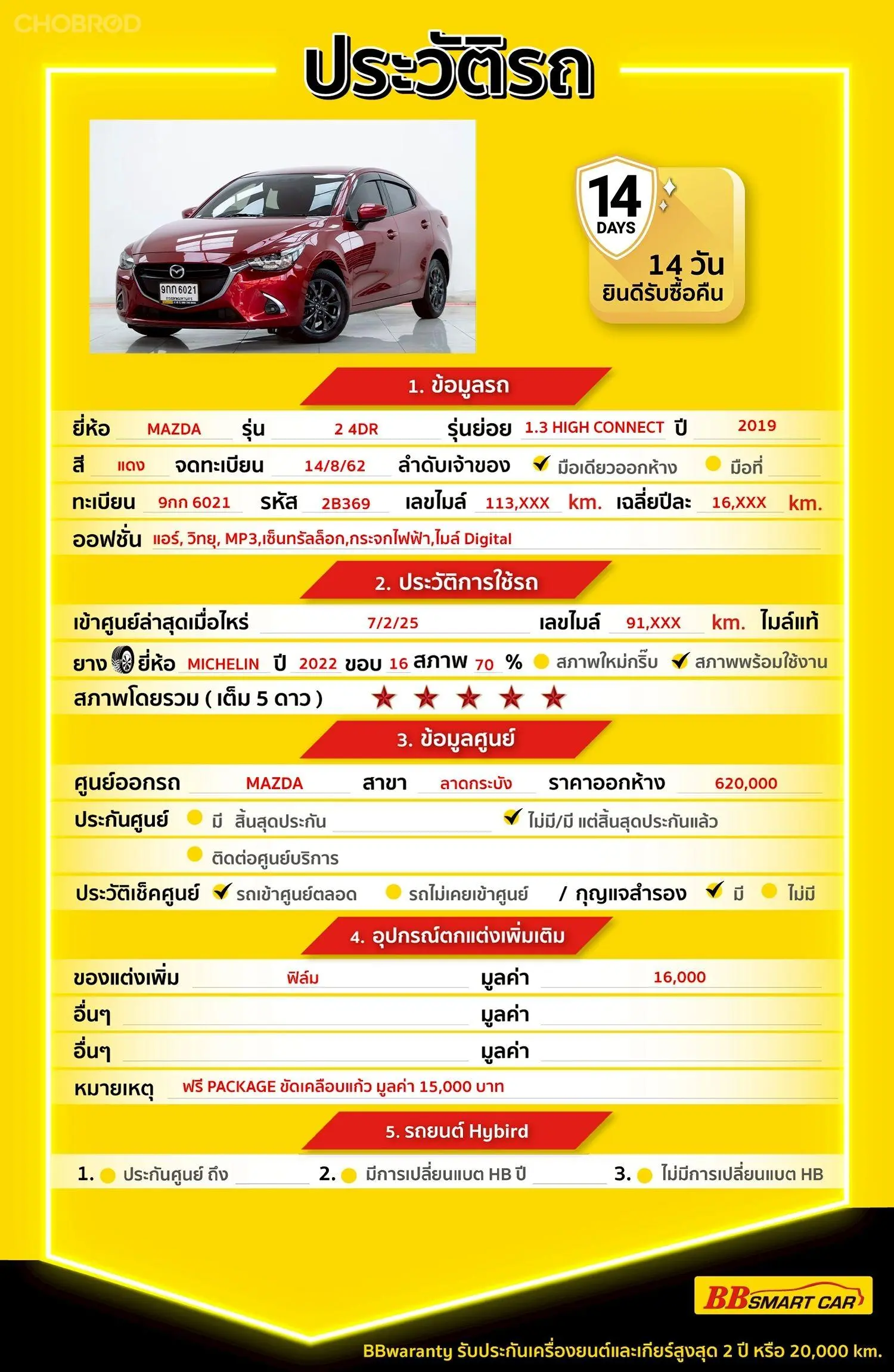 MAZDA 2 1.3 High Connect 4Dr AT 2019 ออกรถ 0 บาท รหัสรถ 2B369 LINE ID : @*******แสดงข้อมูล 🔥มีรถให้เลือกมากกว่า 1,800 คัน 🔥รถทุกคันผ่านตรวจสอบ Inspection เรียบแล้วค่ะ ผ่าน 5 ดาวทุกคันค่ะ 🔥ซื้อรถกับ BB พร้อมให้คำปรึกษา แก้ทุกปัญหา ให้ทุกเรื่อง บริการ call center 24 ชม. 🔥BB Care Plus รับประกันหลังการขาย สูงสุด 2 ปี หรือ 20,000 km. 🔥ฟรี!! แพคเก็จ ขัดเคลือบแก้ว มูลค่า 15,000 บาท ทุกคัน 🔥มี 6 สาขา ในกรุงเทพและปริมณฑลใกล้บ้านท่าน สาขา2 สี่แยกแครายใกล้เดอะมอลล์งามวงศ์วาน รหัสรถ 2B369 ราคา 299,000 บ. ผ่อนเพียง 5,173 บาท Brand. : MAZDA Year. : 2019 Model. : 2 Grade. : 1.3 HIGH CONNECT 4DR Engine. : 1300 CC Type. : เบนซิน Gearbox : AT Color. : แดง Mileage. : 113,000 km (ซื้อสด ราคานี้ยังไม่รวมค่าดำเนินการ 10,000 บ.) 🚩 Price. 299,000 บาท ยอดจัด : 309,000 บาท เงินดาวน์ : 0 บาท ประกันภัย : ฟรีประกันภัย 1 ปี ค่าดำเนินการ : 10,000 บาท รวมออกรถ : 0 บาท ผ่อน36 = 9,953 บาท ผ่อน48 = 7,657 บาท ผ่อน60 = 6,362 บาท ผ่อน72 = 5,691 บาท ผ่อน84 = 5,173 บาท **เงื่อนไขเป็นไปตามที่ไฟแนนซ์กำหนด** โปรโมชั่นพิเศษ สำหรับลูกค้าเครดิตดี 🚩เลือกรับเรทดอกเบี้ยพิเศษ 📍36 งวด = 1.29 % 📍48 งวด = 1.99 % 📍60 งวด = 2.39 % 📍72 งวด = 3.59 % 🔥 เงื่อนไข โปรโมชั่น ดอกเบี้ยเริ่มต้น 1.29% ตลอดอายุสัญญา - ยอดจัดไฟแนนซ์ 300,000-600,0000 บาท - ผ่อนสูงสุด 72 เดือน - เป็นลูกค้าประวัติดี พนักงานประจำเงินเดือน 20,000 ขึ้นไป - ค่าดำเนินการแคมเปญ 20,000 บาท (รวมในยอดจัดได้) 🎗Car Hightlight รถสวยๆ วันนี้ขอแนะนำ MAZDA 2 ปี 2019 จุดเด่นออฟชั่น - ไฟหน้าโปรเจคเตอร์แบบไบ-ซีนอน พร้อมระบบเปิด-ปิดอัตโนมัติ - ล้อแมกซ์อัลลอย - พวงมาลัยมัลติฟังชั่น ปุ่มกดสั่งงานเชื่อมต่อเครื่องเสียง 🎗ภายใน. สำหรับ MAZDA คันนี้อุปกรณ์ข้างในเหมือนได้มือ1 เลยค่ะ Cruise Control แอร์ Airbag เบาะหนังแท้ เบรค ABS พวงมาลัยเพาเวอร์ กระจกไฟฟ้า ไมล์ Digital กระจกมองข้างปรับไฟฟ้า วิทยุ - CD พวงมาลัย Multifunction เซ็นทรัลล๊อก 🎗ภายนอก. สำหรับคันนี้มีรูปลักษณ์ที่ท้าทายทุกสายตาให้จับจ้องมากค่ะ มาพร้อม ไฟตัดหมอก กระจกมองข้างพับไฟฟ้า ไฟเลี้ยวกระจกมองข้าง คิ้วกันสาด ล็อแม็คสีเทาดำสุดเท่ 🎗ความคุ้มค่า สำหรับคันนี้หากเปรียบเทียบราคากับคุณภาพ ถือว่าคุ้มค่ามากค่ะ ผ่อนสบายๆก็มีรถขับได้ รถดีมีคุณภาพแบบนี้รีบตัดสินใจซื้อได้เลยค่ะ