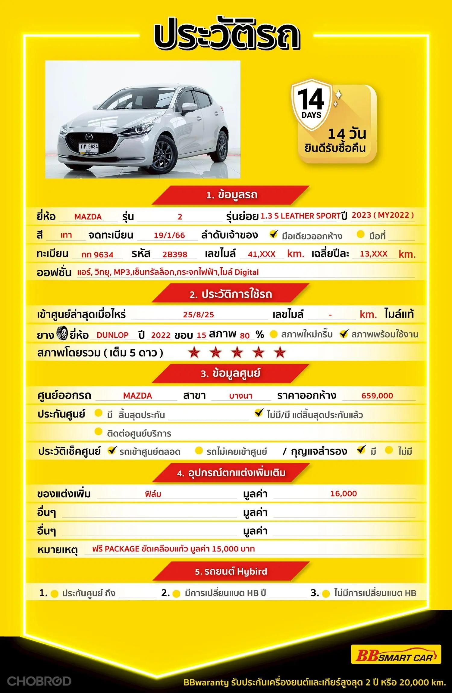 มีการรับประกันจากดีลเลอร์ (6 เดือน) มีบริการช่วยเหลือฉุกเฉินบนท้องถนน 24 ชม. จากดีลเลอร์