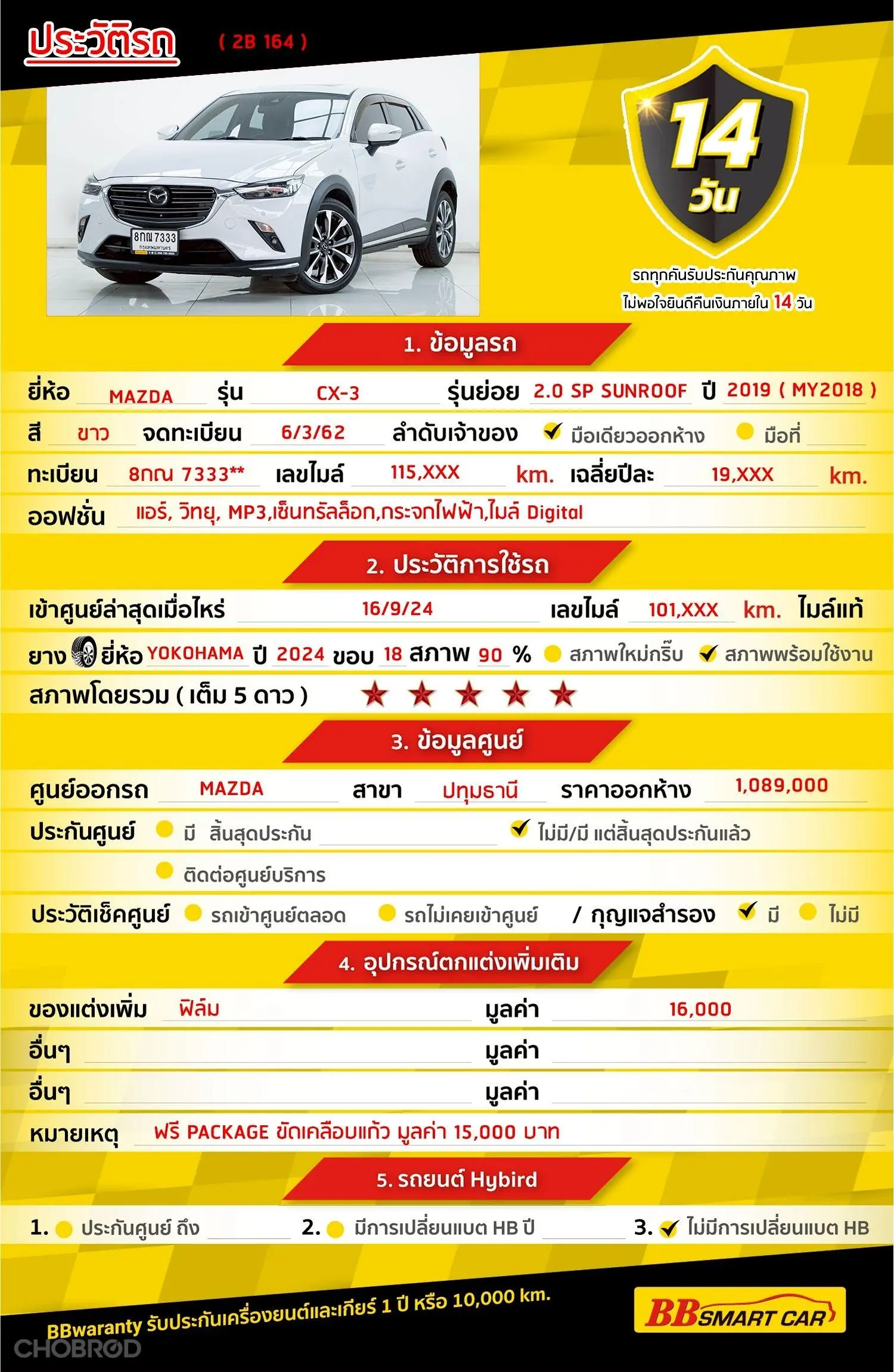 MAZDA CX-3 2.0 SP AT 2019 ออกรถ 0 บาท จัดได้ 449,000 บ Line : @*******แสดงข้อมูล 🔥จอง 199 บาท ส่งบัตรประชาชน รู้ผลอนุมัติภายใน 30 นาที ไม่ผ่านคืนเงินจองทุกกรณี 🔥ซื้อรถกับ BB พร้อมให้คำปรึกษา แก้ทุกปัญหา ให้ทุกเรื่อง บริการ call center 24 ชม. 🔥BB Care Plus รับประกันหลังการขาย สูงสุด 2 ปี หรือ 20,000km. 🔥มีรถให้เลือกมากกว่า 1,800 คัน บีบีสมาร์ทคาร์ 2 สาขาแคราย รหัสรถ 2B164 ราคา 429,000 บาท ผ่อนเพียง 7,350 บาท Brand. : MAZDA Year. : 2019 Model. : CX-3 Grade. : 2.0 SP Engine. : 2000 C Type. : เบนซิน Gearbox : AT Color. : ขาว Mileage. : 115,630 KM. (ซื้อสด ราคานี้ยังไม่รวมค่าดำเนินการ 10,000 บ.) 🚩 Price. 429,000 บาท ยอดจัด : 439,000 บาท เงินดาวน์ : 0 บาท ประกันภัย : ฟรีประกันภัย 1 ปี ค่าดำเนินการ : 10,000 บาท รวมออกรถ : 0 บาท ผ่อน36 = 14,140 บาท ผ่อน48 = 10,879 บาท ผ่อน60 = 9,038 บาท ผ่อน72 = 8,086 บาท ผ่อน84 = 7,350 บาท ***เงื่อนไขเป็นไปตามที่ไฟแนนซ์กำหนด*** โปรโมชั่นพิเศษ สำหรับลูกค้าเครดิตดีลือกรับเรทดอกเบี้ยพิเศษ 📍36 งวด = 1.29 % 📍48 งวด = 1.99 % 📍60 งวด = 2.39 % 📍72 งวด = 3.59 % 🔥 เงื่อนไข โปรโมชั่น ดอกเบี้ยเริ่มต้น 1.29% ตลอดอายุสัญญา - ยอดจัดไฟแนนซ์ 300,000-600,000 บาท - ผ่อนสูงสุด 72 เดือน - เป็นลูกค้าประวัติดี พนักงานประจำเงินเดือน 20,000 ขึ้นไป - ค่าดำเนินการแคมเปญ 20,000 บาท (รวมในยอดจัดได้) 🎗Car Hightlight รถสวยๆ วันนี้ขอแนะนำ MAZDA CX-3 2.0 SP AT 2019 เครื่องยนต์สกายแอคทีฟเบนซิน 2.0 ลิตร SKYACTIV-G 4 สูบ กำลังสูงสุด: 156 แรงม้า แรงบิดสูงสุด: 204 นิวตันเมตร เกียร์อัตโนมัติ 6 สปีด, ระบบเบรกมือไฟฟ้าพร้อม Auto Hold 🎗ภายใน พวงมาลัย Multifunction แอร์ Cruise Control Airbag ซันรูฟ กระจกไฟฟ้า เบาะหนังแท้ พวงมาลัยเพาเวอร์ ไมล์ Digital กระจกมองข้างปรับไฟฟ้า เซ็นทรัลล๊อก เบรค ABS วิทยุ - CD 🎗ภายนอก ล้ออัลลอยขนาด 18 นิ้ว ไฟหน้าAdaptive LED Headlamps (ALH) ไฟท้ายLED กระจกมองข้างปรับและพับไฟฟ้า พร้อมไฟเลี้ยวในตัว 🎗ความคุ้มค่า สำหรับคันนี้หากเปรียบเทียบราคากับคุณภาพ คันนี้ถือว่าคุ้มค่ามากค่ะ ผ่อนสบายๆก็มีรถขับได้ รถดีมีคุณภาพแบบนี้รีบตัดสินใจซื้อได้เลราคานี้มาไวไปไวนะคะ ⭐️การรับประกันหลังการขาย BB Care Plus สูงสุด 2 ปี หรือ 20,000 km. ด้วยช่างที่ผ่านการอบรมจากศูนย์ชั้นนำของประเทศ 🎉🎉 Special offer เฉพาะ บีบีสมาร์ทคาร์ ที่นี่ที่เดียว ⭐️ดอกเบี้ยเริ่มต้น 1.29% มีไฟแนนซ์รองรับหลายที่ค่ะ ⭐️ฟรี!! แพคเก็จ ขัดเคลือบแก้ว มูลค่า 15,000 บาท ทุกคัน ⭐️อนุมัติไว 30 นาที นำเอกสารมาให้ครบรับรถกลับบ้านทันทีค่ะ ⭐️BB Care Plus รับประกันหลังการขาย สูงสุด 2 ปี หรือ 20,000 km. ⭐️มี 6 สาขา ในกรุงเทพและปริมณฑลใกล้บ้านท่าน ⭐️รถทุกคันผ่านตรวจสอบ Inspection เรียบแล้วค่ะ ผ่าน 5 ดาวทุกคันค่ะ ⭐️เซลล์ทุกท่านเป็นมืออาชีพพร้อมให้บริการทุกท่านแน่นอนค่ะ เลือกข้อเสนอที่ให้คุณมากกว่าที่อื่น เพราะเราเล็งเห็นแล้ว ที่บีบีสมาร์ทคาร์ ให้คุณได้มากกว่าที่อื่นแน่นอนค่ะ มาที่เดียวจบทุกปัญหา หลา