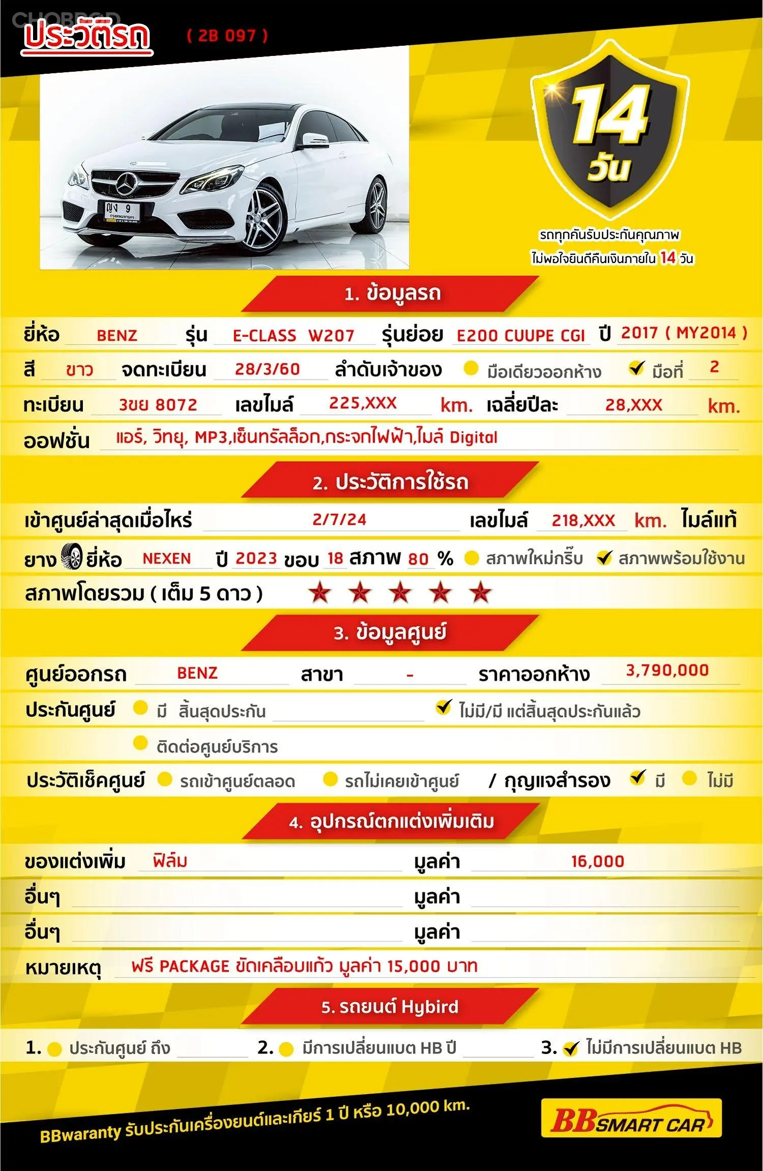 MERCEDES-BENZ E200 2.0 Coupe W207 AT 2017 ออกรถ 0 บาท จัดได้ 749,000 บ. Line : @*******แสดงข้อมูล 🔥จอง 199 บาท ส่งบัตรประชาชน รู้ผลอนุมัติภายใน 30 นาที ไม่ผ่านคืนเงินจองทุกกรณี 🔥ซื้อรถกับ BB พร้อมให้คำปรึกษา แก้ทุกปัญหา ให้ทุกเรื่อง บริการ call center 24 ชม. 🔥BB Care Plus รับประกันหลังการขาย สูงสุด 2 ปี หรือ 20,000km. 🔥มีรถให้เลือกมากกว่า 1,800 คัน สาขา2 สี่แยกแครายใกล้เดอะมอลล์งามวงศ์วาน รหัสรถ 2B097 ราคา 729,000 บาท ผ่อนเพียง 11,870 บาท Brand. : MERCEDES-BENZ Year. : 2017 Model. : E-CLASS Grade. : E200 Coupe CGI Engine. : 2000 CC Type. : เบนซิน Gearbox : AT Color. : ขาว Mileage. : 225,900 KM. (ซื้อสด ราคานี้ยังไม่รวมค่าดำเนินการ 10,000 บ.) 🚩 Price. 729,000 บาท ยอดจัด : 739,000 บาท เงินดาวน์ : 0 บาท ประกันภัย : ฟรีประกันภัย 1 ปี ค่าดำเนินการ : 10,000 บาท รวมออกรถ : 0 บาท ผ่อน 36 งวด = 22,837 บาท ผ่อน 48 งวด = 17,568 บาท ผ่อน 60 งวด = 14,597 บาท ผ่อน 72 งวด = 13,059 บาท ผ่อน 84 งวด = 11,870 บาท **เงื่อนไขเป็นไปตามที่ไฟแนนซ์กำหนด** โปรโมชั่นพิเศษ สำหรับลูกค้าเครดิตดีลือกรับเรทดอกเบี้ยพิเศษ 📍36 งวด = 1.29 % 📍48 งวด = 1.99 % 📍60 งวด = 2.39 % 📍72 งวด = 3.59 % 🔥 เงื่อนไข โปรโมชั่น ดอกเบี้ยเริ่มต้น 1.29% ตลอดอายุสัญญา - ยอดจัดไฟแนนซ์ 300,000-600,000 บาท - ผ่อนสูงสุด 72 เดือน - เป็นลูกค้าประวัติดี พนักงานประจำเงินเดือน 20,000 ขึ้นไป - ค่าดำเนินการแคมเปญ 20,000 บาท (รวมในยอดจัดได้) 🎗Car Hightlight . MERCEDES-BENZ E 200 Coupe W207 เป็นรุ่น Coupe ที่ใช้เครื่องยนต์เบนซิน 2.0 ลิตร เทอร์โบ ให้กำลัง 184 แรงม้า พร้อมเกียร์ 7 จังหวะ 🎗ภายใน. ภายในห้องโดยสารกว้างขวาง เบาะนั่งคนขับ และเบาะผู้โดยสารด้านหน้า ปรับเอน เลื่อนขึ้นหน้า – ถอยหลัง มาพร้อมออฟชั่นมากมาย Airbag เบาะไฟฟ้าคู่หน้า พวงมาลัย Multifunction พวงมาลัยเพาเวอร์ ไมล์ Digital เซ็นทรัลล๊อก เบรค ABS กระจกมองข้างปรับไฟฟ้า กระจกไฟฟ้า แอร์ราว วิทยุ - CD เบาะหนังแท้ Cruise Control แอร์ 🎗ภายนอก. ดีไซน์สุดหรูหรา โลโก้เบนซ์ฝังกระจังหน้าโครเมี่ยม พร้อม ล้อแม็ก กระจกมองข้างพับไฟฟ้า ไฟตัดหมอก ไฟเลี้ยวกระจกมองข้าง 🎗ความคุ้มค่า. ด้วยรูปลักษณ์ภายนอก ภายใน ที่ดูคลาสสิค ฟังก์ชั่นการใช่้งาน มาแบบครบครัน คุ้มค่าแบบสุดๆ ราคานี้รีบเลยค่ะ ⭐️การรับประกันหลังการขาย BB Care Plus สูงสุด 2 ปี หรือ 20,000 km. ด้วยช่างที่ผ่านการอบรมจากศูนย์ชั้นนำของประเทศ 🎉Special offer เฉพาะ บีบีสมาร์ทคาร์ ที่นี่ที่เดียว ⭐ดอกเบี้ยเริ่มต้น 1.29% มีไฟแนนซ์รองรับหลายที่ค่ะ ⭐ฟรี!! แพคเก็จ ขัดเคลือบแก้ว มูลค่า 15,000 บาท ทุกคัน ⭐อนุมัติไว 30 นาที นำเอกสารมาให้ครบรับรถกลับบ้านทันทีค่ะ ⭐BB Care Plus รับประกันหลังการขาย สูงสุด 2 ปี หรือ 20,000 km. ⭐มี 6 สาขา ในกรุงเทพและปริมณฑลใกล้บ้านท่าน ⭐รถทุกคันผ่านตรวจสอบ Inspection เรียบร้อยแล้วค่ะ ผ่าน 5 ดาวทุกคันค่ะ ⭐เซลล์ทุกท่านเป็นมืออาชีพพร้อมให้บริการทุกท่านแน่นอนค่ะ เลือกข้อเสนอที่ให้คุณมากกว่าที่อื่น เพราะเรา