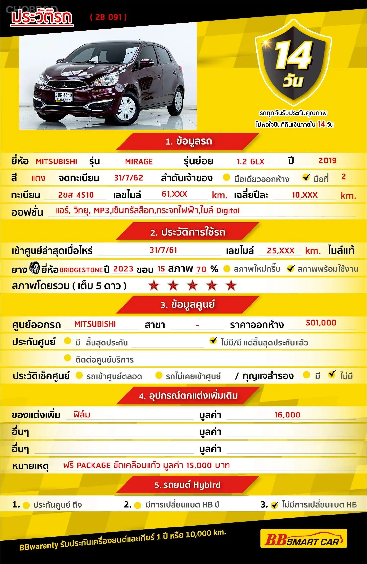 MITSUBISHI MIRAGE 1.2 GLX AT 2019 ออกรถ 0 บาท จัดได้ 229,000 บ. Line : @*******แสดงข้อมูล 🔥จอง 199 บาท ส่งบัตรประชาชน รู้ผลอนุมัติภายใน 30 นาที ไม่ผ่านคืนเงินจองทุกกรณี 🔥ซื้อรถกับ BB พร้อมให้คำปรึกษา แก้ทุกปัญหา ให้ทุกเรื่อง บริการ call center 24 ชม. 🔥BB Care Plus รับประกันหลังการขาย สูงสุด 2 ปี หรือ 20,000km. 🔥มีรถให้เลือกมากกว่า 1,600 คัน บีบีสมาร์ทคาร์ 2 สาขาแคราย รหัสรถ 2B091 ราคา 209,000 บ. ผ่อนเพียง 3,667 บ. Brand. : MITSUBISHI Year : 2019 Model. : MIRAGE Grade : 1.2 GLX Engine. : 1200 cc. Type : เบนซิน Gearbox : AT Color. : แดง Mileage. : 61,000 km. (ซื้อสด ราคานี้ยังไม่รวมค่าดำเนินการ 10,000 บ.) 🚩 Price. : 209,000 บาท ยอดจัด : 219,000 บาท เงินดาวน์. : ฟรีดาวน์ ประกันภัย : ฟรีประกันภัย 1 ปี ค่าดำเนินการ : 10,000 รวมออกรถ 0 บาท ผ่อน 36 งวด = 7,055 บาท ผ่อน 48 งวด = 5,427 บาท ผ่อน 60 งวด = 4,509 บาท ผ่อน 72 งวด = 4,034 บาท ผ่อน 84 งวด = 3,667 บาท **เงื่อนไขเป็นไปตามที่ไฟแนนซ์กำหนด** โปรโมชั่นพิเศษ สำหรับลูกค้าเครดิตดี 🚩รับเรทดอกเบี้ยพิเศษ 📍36 งวด = 1.29 % 📍48 งวด = 1.99 % 📍60 งวด = 2.39 % 📍72 งวด = 3.59 % 🔥 เงื่อนไข โปรโมชั่น ดอกเบี้ยเริ่มต้น 1.29% ตลอดอายุสัญญา - ยอดจัดไฟแนนซ์ 300,000-600,0000 บาท - ผ่อนสูงสุด 72 เดือน - เป็นลูกค้าประวัติดี พนักงานประจำเงินเดือน 20,000 ขึ้นไป - ค่าดำเนินการแคมเปญ 20,000 บาท (รวมในยอดจัดได้) 🎗Car Hightlight มาอีกแล้วคะ MITSUBISHI MIRAGE รถอีโคคาร์อีกหนึ่งคัน เหมาะกับผู้ใช้รถในเมือง ประหยัดน้ำมันอย่างมาก การออกแบบภายในห้องโดยสารที่โอ่โถงกว้างสบาย ความสะดวกสบายและความทันสมัยในรถยนต์ขนาดเล็ก 🎗ภายใน กระจกไฟฟ้า Airbag ไมล์ Digital เบรค ABS พวงมาลัย Multifunction เซ็นทรัลล๊อก แอร์ กระจกมองข้างปรับไฟฟ้า เบาะกำมะหยี่ พวงมาลัยเพาเวอร์ วิทยุ - CD 🎗ภายนอก ตัวรถสีแดง ไม่เหมือนใคร สวยมากๆค่ะ มาพร้อมล้อแม็กซ์ รถสวยสภาพร้อมใช้งาน ไม่มีชนหนักแน่นอนค่ะ 🎗 ความคุ้มค่า ราคาผ่อนสบายกระเป๋า เป็นรถที่ประหยัด และเหมาะกับการใช้งานปัจจุบันสุดๆ เราคัดเลือกสภาพรถคันนี้มาแล้ว สภาพดีมากๆ เทียบกับราคานี้ถือว่าคุ้มค่าสุดๆ ไปเลยจ้า ⭐️การรับประกันหลังการขาย BB Care Plus สูงสุด 2 ปี หรือ 20,000 km. ด้วยช่างที่ผ่านการอบรมจากศูนย์ชั้นนำของประเทศ 🎉🎉 Special offer เฉพาะ บีบีสมาร์ทคาร์ ที่นี่ที่เดียว ⭐️ดอกเบี้ยเริ่มต้น 1.29% มีไฟแนนซ์รองรับหลายที่ค่ะ ⭐️ฟรี!! แพคเก็จ ขัดเคลือบแก้ว มูลค่า 15,000 บาท ทุกคัน ⭐️อนุมัติไว 30 นาที นำเอกสารมาให้ครบรับรถกลับบ้านทันทีค่ะ ⭐️BB Care Plus รับประกันหลังการขาย สูงสุด 2 ปี หรือ 20,000 km. ⭐️มี 6 สาขา ในกรุงเทพและปริมณฑลใกล้บ้านท่าน ⭐️รถทุกคันผ่านตรวจสอบ Inspection เรียบแล้วค่ะ ผ่าน 5 ดาวทุกคันค่ะ ⭐️เซลล์ทุกท่านเป็นมืออาชีพพร้อมให้บริการทุกท่านแน่นอนค่ะ