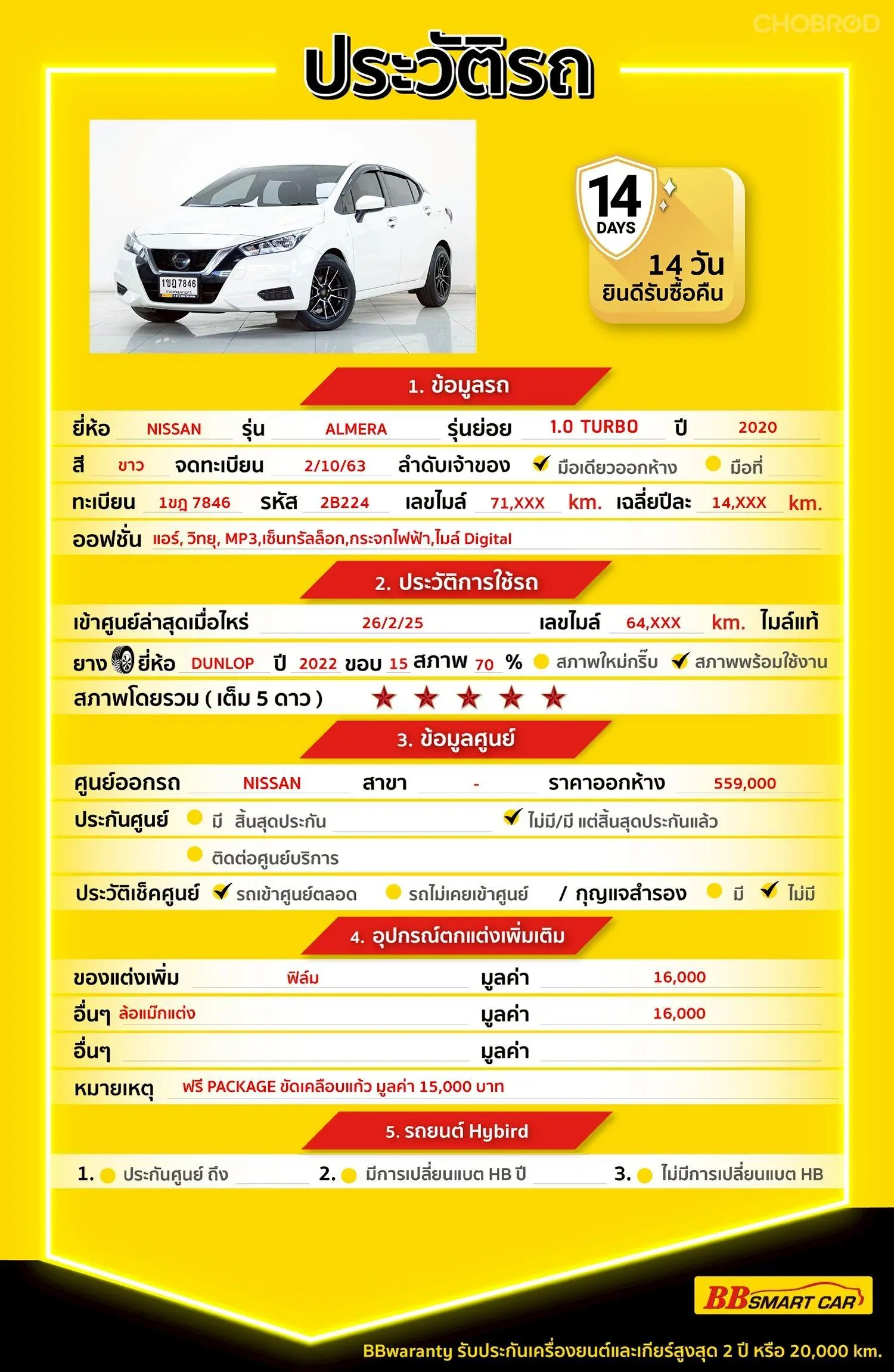 มีการรับประกันจากดีลเลอร์ (6 เดือน) มีบริการช่วยเหลือฉุกเฉินบนท้องถนน 24 ชม. จากดีลเลอร์