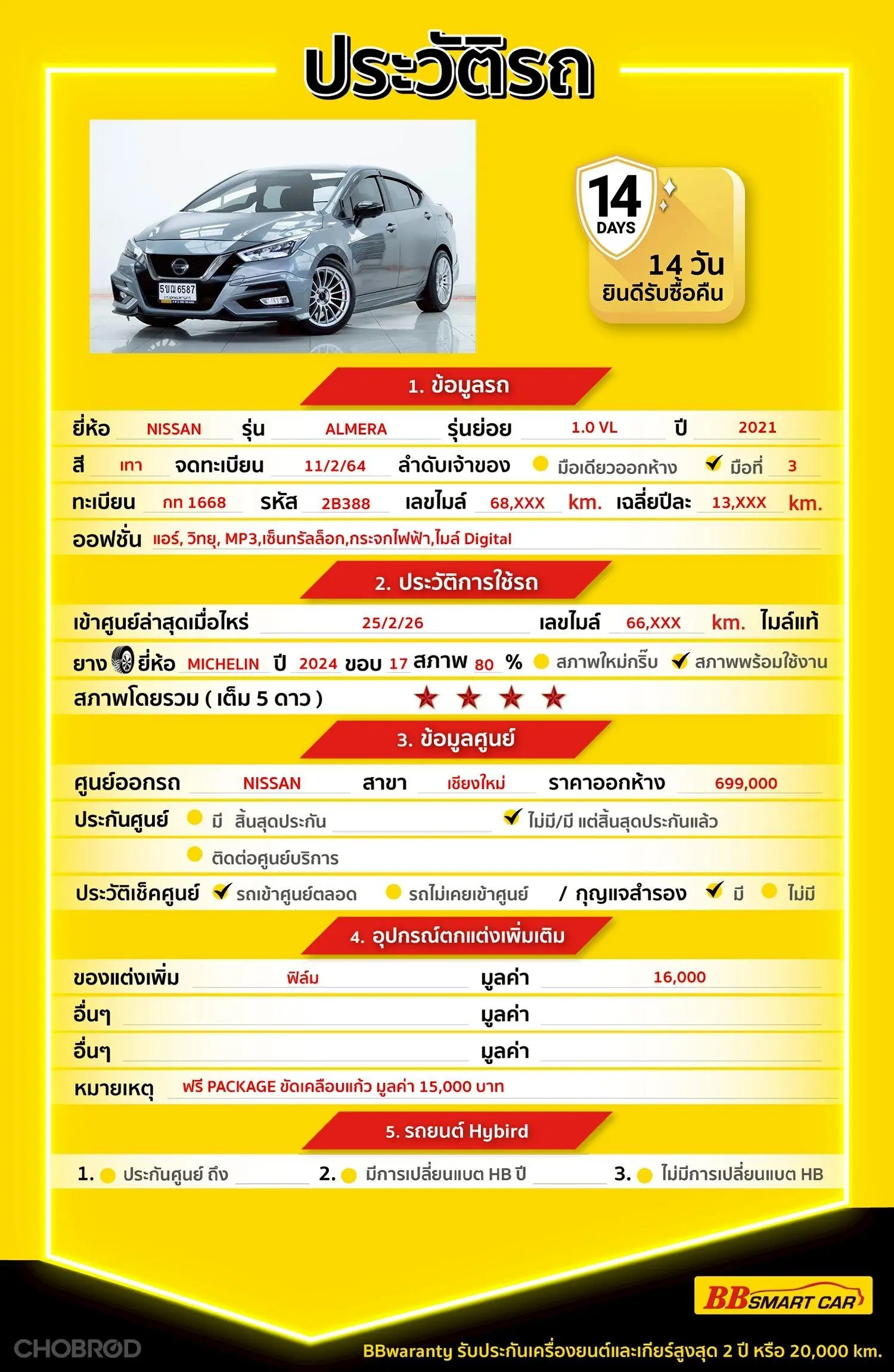 NISSAN ALMERA 1.0 VL TURBO AT 2021 ออกรถ 0 บาท รหัสรถ 2B388 Line : @bbcar02 🔥มีรถให้เลือกมากกว่า 1,800 คัน 🔥รถทุกคันผ่านตรวจสอบ Inspection เรียบแล้วค่ะ ผ่าน 5 ดาวทุกคันค่ะ 🔥ซื้อรถกับ BB พร้อมให้คำปรึกษา แก้ทุกปัญหา ให้ทุกเรื่อง บริการ call center 24 ชม. 🔥BB Care Plus รับประกันหลังการขาย สูงสุด 2 ปี หรือ 20,000 km. 🔥ฟรี!! แพคเก็จ ขัดเคลือบแก้ว มูลค่า 15,000 บาท ทุกคัน 🔥มี 6 สาขา ในกรุงเทพและปริมณฑลใกล้บ้านท่าน สาขา2 สี่แยกแครายใกล้เดอะมอลล์งามวงศ์วาน รหัสรถ 2B388 ราคา 369,000 บาท ผ่อนเพียง 6,345 บาท Brand. : NISSAN Year. : 2021 Model. : ALMERA Grade. : 1.0 VL TURBO Engine. : 1000 CC Type. : เบนซิน Gearbox : AT Color. : เทา Mileage. : 68,500 KM. (ซื้อสด ราคานี้ยังไม่รวมค่าดำเนินการ 10,000 บ.) 🚩 Price. 369,000 บาท ยอดจัด : 379,000 บาท เงินดาวน์ : 0 บาท ประกันภัย : ฟรีประกันภัย 1 ปี ค่าดำเนินการ : 10,000 บาท รวมออกรถ : 0 บาท ผ่อน36 = 12,208 บาท ผ่อน48 = 9,391 บาท ผ่อน60 = 7,804 บาท ผ่อน72 = 6,981 บาท ผ่อน84 = 6,345 บาท **เงื่อนไขเป็นไปตามที่บริษัทกำหนด** โปรโมชั่นพิเศษ สำหรับลูกค้าเครดิตดี 🚩เลือกรับเรทดอกเบี้ยพิเศษ 📍36 งวด = 1.29 % 📍48 งวด = 1.99 % 📍60 งวด = 2.39 % 📍72 งวด = 3.59 % 🔥 เงื่อนไข โปรโมชั่น ดอกเบี้ยเริ่มต้น 1.29% ตลอดอายุสัญญา - ยอดจัดไฟแนนซ์ 300,000-600,0000 บาท - ผ่อนสูงสุด 72 เดือน - เป็นลูกค้าประวัติดี พนักงานประจำเงินเดือน 20,000 ขึ้นไป - ค่าดำเนินการแคมเปญ 20,000 บาท (รวมในยอดจัดได้) 🎗Car Hightlight Nissan Almera (นิสสัน อัลเมร่า ใหม่) รถอินเทลลิเจนท์ เออเบิน ซีดาน ที่ครองใจครอบครัวคนรุ่นใหม่ และกลุ่ม มิลเลนเนียล โดยราเมช นาราสิมัน ประธาน นิสสัน มอเตอร์ ประเทศไทย กล่าว อัลเมร่า ใหม่ ยกระดับความปลอดภัยด้วยนวัตกรรมขั้นสูง มีพื้นที่ภายในห้องโดยสารที่กว้างขวาง ใช้งานได้อย่างสะดวกสบาย และสามารถตอบสนองความต้องการของลูกค้า โดยเฉพาะผู้ที่กำลังจะซื้อรถยนต์คันใหม่ 🎗ภายใน. ได้รับการออกแบบใหม่ทั้งหมด เพื่อรองรับแผงหน้าปัดแบบใหม่ หน้าจออินโฟเทนเมนต์ พวงมาลัยและที่นั่งผู้โดยสาร และภายในห้องโดยสารถูกออกแบบอย่างมีสไตล์ ใช้วัสดุคุณภาพสูงที่เน้นความประณีตในการประกอบ พร้อมด้วยพื้นที่ว่างเหนือศีรษะ และพื้นที่วางขาที่กว้างขวาง คงไว้ซึ่งความเป็นผู้นำในด้านความกว้างขวางที่ดีที่สุดในรถยนต์ระดับเดียวกันนอกจากนี้ นิสสัน อัลเมร่า ใหม่ ยังโดดเด่นด้วยเทคโนโลยี นิสสัน อินเทลลิเจนต์ โมบิลิตี (Nissan Intelligent Mobility) ที่ช่วยตรวจสอบความปลอดภัยและป้องกันผู้ขับขี่และผู้โดยสายบริเวณด้านหน้า ด้านข้างและด้านหลังของรถ 🎗ภายนอก. ภายใต้การออกแบบใหม่ ดีไซน์ให้มิติภายนอกปราดเปรียวขึ้น กว้าง และยาวขึ้น ภายใต้ปรัชญาในการสร้างสรรค์รถยนต์ของนิสสัน แบบ “รูปทรงเรขาคณิตที่สื่อถึงอารมณ์ หรือ Emotional Geometry” นิสสัน อัลเมร่า ใหม่ มีองค์ประกอบที่โดดเด่น และเป็นเอกล