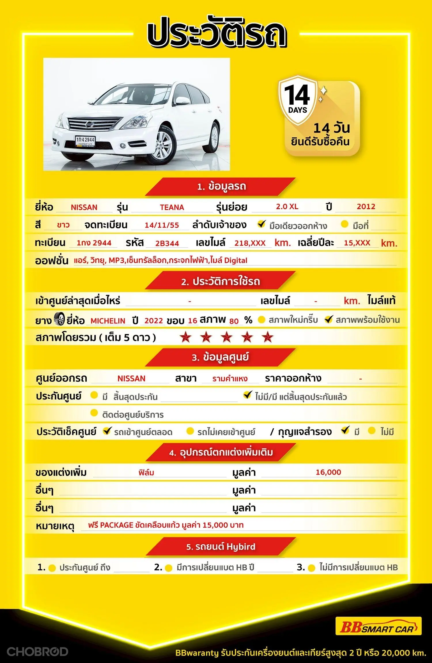 NISSAN TEANA 200 XL AT 2012 ออกรถ 0 บาท รหัสรถ 2B344 Line ID : @bbcar02 🔥ซื้อรถกับ BB พร้อมให้คำปรึกษา แก้ทุกปัญหา ให้ทุกเรื่อง บริการ call center 24 ชม. 🔥BB Care Plus รับประกันหลังการขาย สูงสุด 2 ปี หรือ 20,000 km. 🔥ฟรี!! แพคเก็จ ขัดเคลือบแก้ว มูลค่า 15,000 บาท ทุกคัน 🔥มี 6 สาขา ในกรุงเทพและปริมณฑลใกล้บ้านท่าน บีบีสมาร์ทคาร์ 2 สาขาแคราย รหัสรถ 2B344 ราคา 219,000 บ. ผ่อนเพียง 3,499 บ. Brand : NISSAN Year : 2012 Model : TEANA Grade : 200 XL Engine : 2000 CC. Type : เบนซิน Gearbox : AT Color : ขาว Mileage : 218,000 km. (ซื้อสด ราคานี้ยังไม่รวมค่าดำเนินการ 10,000 บ.) 🚩 Price 219,000 บาท ยอดจัด : 229,000 บาท เงินดาวน์ : ฟรีเงินดาวน์ ประกันภัย : ฟรีประกันภัย 1 ปี ค่าดำเนินการ : 10,000 บาท รวมออกรถ : 0 บาท ผ่อน 36 งวด = 6,731 บาท ผ่อน 48 งวด = 5,179 บาท ผ่อน 60 งวด = 4,304 บาท ผ่อน 72 งวด = 3,850 บาท ผ่อน 84 งวด = 3,499 บาท **เงื่อนไขเป็นไปตามที่ไฟแนนซ์กำหนด** โปรโมชั่นพิเศษ สำหรับลูกค้าเครดิตดี 🚩รับเรทดอกเบี้ยพิเศษ 📍36 งวด = 1.29 % 📍48 งวด = 1.99 % 📍60 งวด = 2.39 % 📍72 งวด = 3.59 % 🔥 เงื่อนไข โปรโมชั่น ดอกเบี้ยเริ่มต้น 1.29% ตลอดอายุสัญญา - ยอดจัดไฟแนนซ์ 300,000-600,0000 บาท - ผ่อนสูงสุด 72 เดือน - เป็นลูกค้าประวัติดี พนักงานประจำเงินเดือน 20,000 ขึ้นไป - ค่าดำเนินการแคมเปญ 20,000 บาท (รวมในยอดจัดได้) 🎗Car Hightlight มาอีกแล้วคะ NISSAN TEANA เครื่องยนต์เบนซิน 2000 cc. สภาพพร้อมใช้งาน เป็นรถ SEDAN ที่น่าใช้งาน อีก 1 คัน 🎗ภายใน พวงมาลัยมัลติฟังก์ชั่น ปุ่มกดสตาร์ท เบาะหนัง ด้วยการตกแต่งโครเมียมจากกระจังหน้าจรดฝากระโปรงท้ายไฟหน้าแบบโปรเจคเตอร์เลนส์ซีนอน พร้อมไฟเลี้ยวและไฟท้ายแบบ LED เพิ่มดีกรีความเท่ด้วยกระจกมองข้างดีไซน์ใหม่ ขับเคลื่อนคล่องตัวด้วยตัวถังที่ลู่ลมช่วยลดแรงต้านของอากาศและลดเสียงลมปะทะไม่ให้เข้าสู่ห้องโดยสารเหนือกว่าด้วยความเงียบสบายไร้เสียงรบกวนกับโครงสร้างตัวถังที่แข็งแกร่งยิ่งขึ้นพร้อมบุวัสดุซับเสียง ลดเสียงและแรงสั่นสะเทือนทั่วทั้งคัน 🎗ภายนอก ตัวรถขาว ได้รับการออกแบบภายใต้แนวคิด Suggestive Aura ด้วยดีไซน์ปราดเปรียวสง่างามด้วยเส้นสายที่พลิ้วไหวจากภายนอก สู่ห้องโดยสารที่กว้างขวางสไตล์สปอร์ตสุดหรู 🎗ความคุ้มค่า รถสภาพนี้หายากมากค่ะบอกเลย คัดเลือกคันนี้มาแล้วค่ะสภาพดีมากๆ เทียบกับราคานี้ถือว่าคุ้มค่ามากๆค่ะ