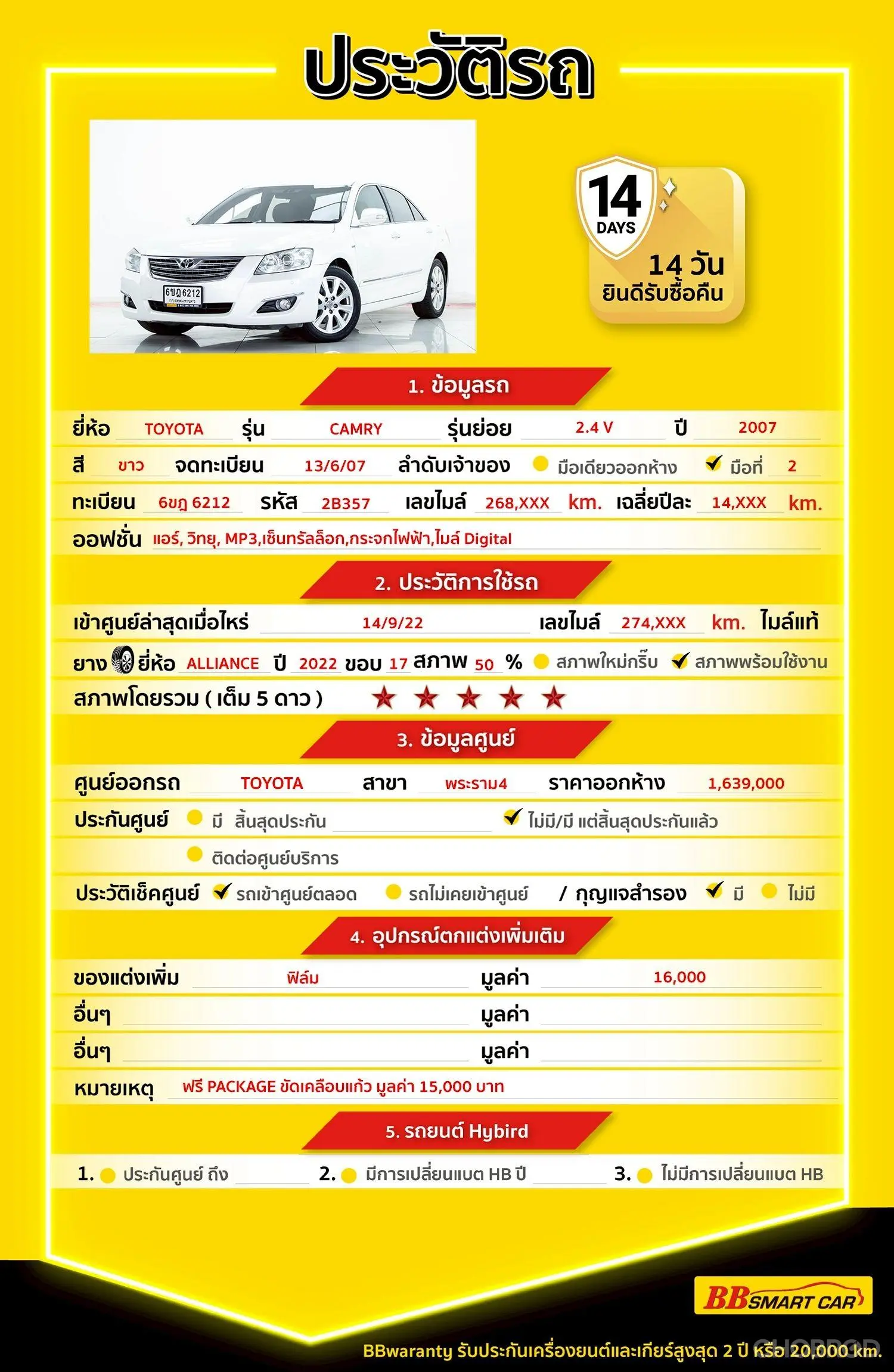 มีการรับประกันจากดีลเลอร์ (6 เดือน) มีบริการช่วยเหลือฉุกเฉินบนท้องถนน 24 ชม. จากดีลเลอร์
