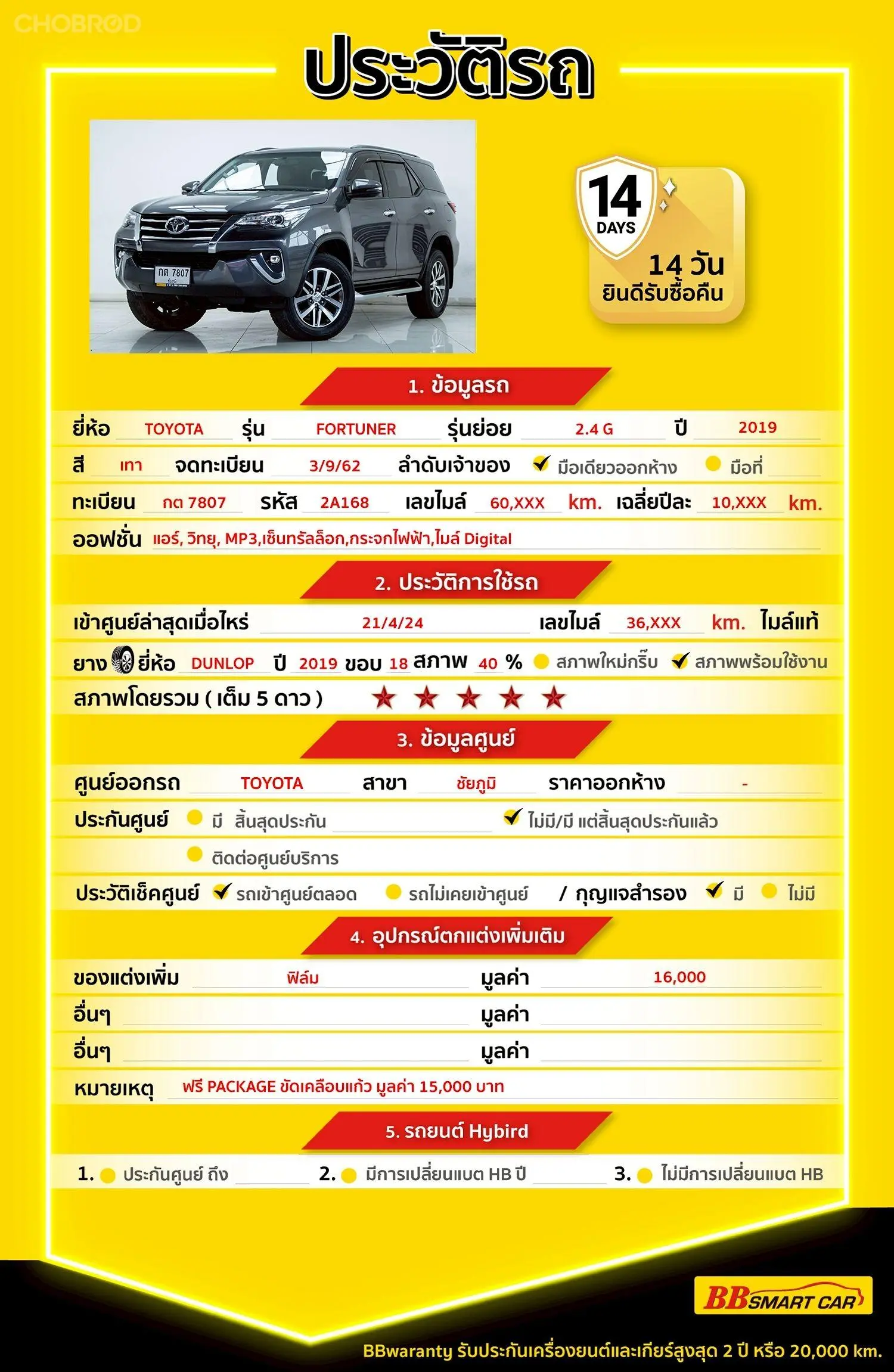 TOYOTA FORTUNER 2.4 G AT 2019 ออกรถ 0 บาท จัดได้ 779,000 บ Line:@*******แสดงข้อมูล 🔥จอง 199 บาท ส่งบัตรประชาชน รู้ผลอนุมัติภายใน 30 นาที ไม่ผ่านคืนเงินจองทุกกรณี 🔥ซื้อรถกับ BB พร้อมให้คำปรึกษา แก้ทุกปัญหา ให้ทุกเรื่อง บริการ call center 24 ชม. 🔥BB Care Plus รับประกันหลังการขาย สูงสุด 2 ปี หรือ 20,000km. 🔥มีรถให้เลือกมากกว่า 1,800 คัน สาขา2 สี่แยกแครายใกล้เดอะมอลล์งามวงศ์วาน รหัสรถ 2B168 ราคา 759,000 บาท ผ่อนเพียง 12,874 บาท Brand. : TOYOTA Year. : 2019 Model. : FORTUNER Grade. : 2.4 G Engine. : 2400 CC Type. : ดีเซล Gearbox : AT Color. : เทา Mileage. : 61,000 KM. (ซื้อสด ราคานี้ยังไม่รวมค่าดำเนินการ 10,000 บ.) 🚩 Price. 759,000 บาท ยอดจัด : 769,000 บาท เงินดาวน์ : 0 บาท ประกันภัย : ฟรีประกันภัย 1 ปี ค่าดำเนินการ : 10,000 บาท รวมออกรถ : 0 บาท ผ่อน 36 งวด = 24,769 บาท ผ่อน 48 งวด = 19,056 บาท ผ่อน 60 งวด = 15,833 บาท ผ่อน 72 งวด = 14,164 บาท ผ่อน 84 งวด = 12,874 บาท **เงื่อนไขเป็นไปตามที่ไฟแนนซ์กำหนด** โปรโมชั่นพิเศษ สำหรับลูกค้าเครดิตดี เลือกรับเรทดอกเบี้ยพิเศษ 📍36 งวด = 1.29 % 📍48 งวด = 1.99 % 📍60 งวด = 2.39 % 📍72 งวด = 3.59 % 🔥 เงื่อนไข โปรโมชั่น ดอกเบี้ยเริ่มต้น 1.29% ตลอดอายุสัญญา - ยอดจัดไฟแนนซ์ 300,000-600,000 บาท - ผ่อนสูงสุด 72 เดือน - เป็นลูกค้าประวัติดี พนักงานประจำเงินเดือน 20,000 ขึ้นไป - ค่าดำเนินการแคมเปญ 20,000 บาท (รวมในยอดจัดได้) 🎗Car Hightlight รถสวยๆ วันนี้ขอแนะนำ TOYOTA FORTUNER 2.4 G AT 2019 จุดเด่นออฟชั่น 1 : เกียร์ออโต้ 2 : เครื่องเสียงแบบหน้าจอสัมผัส Touchscreen ขนาด 7 นิ้ว 3 : กล้องมองภาพขณะถอยจอด 🎗ภายใน เบาะหนังแท้ เบรค ABS แอร์ AUTO ไมล์ Digital Cruise Control เกียร์ Paddle Shift กระจกมองข้างปรับไฟฟ้า เบาะไฟฟ้าคนขับ Airbag กระจกไฟฟ้า พวงมาลัย Multifunction แอร์ เซ็นทรัลล๊อก วิทยุ - CD 🎗ภายนอก ไฟหน้าโปรเจคเตอร์ แบบ LED Bi-Beam ระบบปรับไฟหน้าสูง-ต่ำอัตโนมัติ ไฟส่องสว่างข้างตัวรถใต้กระจกมองข้าง Welcome Light ฝาท้ายเปิด-ปิดด้วยระบบไฟฟ้า ป้องกันการหนีบ กระจกมองข้างพับไฟฟ้า ล้อแม็ก ไฟเลี้ยวกระจกมองข้าง ไฟตัดหมอก 🎗ความคุ้มค่า สำหรับคันนี้หากเปรียบเทียบราคากับคุณภาพ คันนี้ถือว่าคุ้มค่ามากค่ะ ผ่อนสบายๆก็มีรถขับได้ รถดีมีคุณภาพแบบนี้รีบตัดสินใจซื้อได้เลราคานี้มาไวไปไวนะคะ ⭐️การรับประกันหลังการขาย BB Care Plus สูงสุด 2 ปี หรือ 20,000 km. ด้วยช่างที่ผ่านการอบรมจากศูนย์ชั้นนำของประเทศ 🎉🎉 Special offer เฉพาะ บีบีสมาร์ทคาร์ ที่นี่ที่เดียว ⭐️ดอกเบี้ยเริ่มต้น 1.29% มีไฟแนนซ์รองรับหลายที่ค่ะ ⭐️ฟรี!! แพคเก็จ ขัดเคลือบแก้ว มูลค่า 15,000 บาท ทุกคัน ⭐️อนุมัติไว 30 นาที นำเอกสารมาให้ครบรับรถกลับบ้านทันทีค่ะ ⭐️BB Care Plus รับประกันหลังการขาย สูงสุด 2 ปี หรือ 20,000 km. ⭐️มี 6 สาขา ในกรุงเทพและปริมณฑลใกล้บ้านท่าน ⭐️รถทุกคันผ่านตรวจสอบ Inspection เรียบแล้วค่ะ ผ่าน 5 ดาวทุกคันค่ะ ⭐️เซลล์ทุกท่านเป็นมืออาชีพพร้อมให้บริการทุกท่านแน่นอนค่ะ เลือกข้อเสนอที่ให