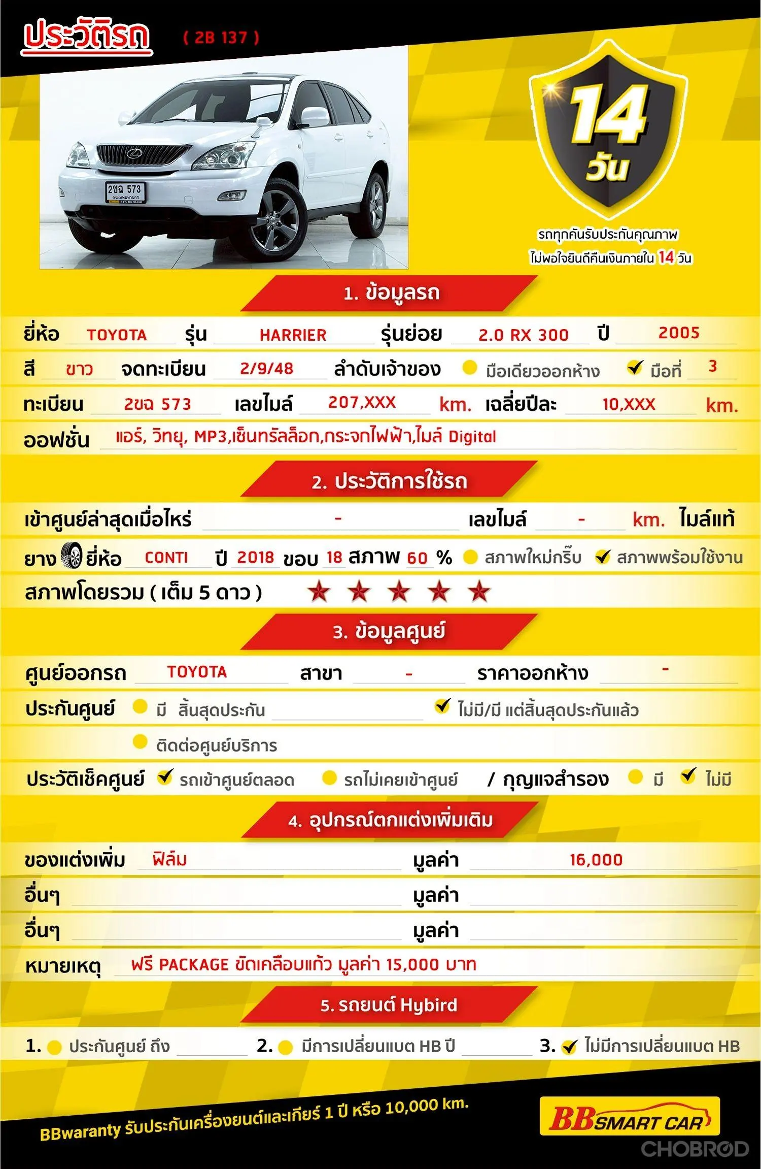 TOYOTA HARRIER 3.0 RX300 AT 2005 ราคา 209,000 (ขายสดเท่านั้น) Line: @*******แสดงข้อมูล 🔥 จอง 199 บาท ส่งบัตรประชาชน รู้ผลอนุมัติภายใน 30 นาที ไม่ผ่านคืนเงินจองทุกกรณี 🔥 ซื้อรถกับ BB พร้อมให้คำปรึกษา แก้ทุกปัญหา ให้ทุกเรื่อง บริการ call center 24 ชม. 🔥 BB Care Plus รับประกันหลังการขาย สูงสุด 2 ปี หรือ 20,000 km. 🔥 มีรถให้เลือกมากกว่า 1,800 คัน บีบีสมาร์ทคาร์ 2 สาขาแคราย รหัสรถ 2B137 ราคา 209,000 บาท (ขายสดเท่านั้น) Brand : TOYOTA Year : 2005 Model : HARRIER Grade : 3.0 RX300 Engine : 3000 cc. Type : เบนซิน Gearbox : A/T Color : ขาว Mileage : 207,400 km. (ซื้อสด ราคานี้ยังไม่รวมค่าดำเนินการ 10,000 บ.) 🚩 Price. 209,000 บาท ค่าดำเนินการ : 10,000 **เงื่อนไขเป็นไปตามที่ไฟแนนซ์กำหนด** 🚩รับเรทดอกเบี้ยพิเศษ 📍36 งวด = 1.29 % 📍48 งวด = 1.99 % 📍60 งวด = 2.39 % 📍72 งวด = 3.59 % 🔥 เงื่อนไข โปรโมชั่น ดอกเบี้ยเริ่มต้น 1.29% ตลอดอายุสัญญา - ยอดจัดไฟแนนซ์ 300,000-600,0000 บาท - ผ่อนสูงสุด 72 เดือน - เป็นลูกค้าประวัติดี พนักงานประจำเงินเดือน 20,000 ขึ้นไป - ค่าดำเนินการแคมเปญ 20,000 บาท (รวมในยอดจัดได้) 🎗Car Hightlight . โตโยต้า แฮริเออร์ ออกแบบให้เป็น SUV ที่เน้นความสปอร์ต หรูหรา มิติด้านหน้ายาวขึ้นกว่ารุ่นก่อนหน้า ด้านหน้าดีไซน์ปราดเปรียว มาดเข้ม กับโคมไฟหน้าสรูปทรงโฉบเฉี่ยว กระจังหน้าหรูหรา เพิ่มความดุดันด้วยการขยายช่องดักอากาศด้านล่าง ด้านหลังมีมิติที่สั้นลง เน้นความเบาเพื่อให้สามารถบรรทุกสัมภาระได้มากขึ้น 🎗ภายใน. ภายในห้องโดยสาร ยังคงเน้นความหรูหรา สะดวกสบาย ซันรูฟ พวงมาลัย Multifunction แอร์ กระจกมองข้างปรับไฟฟ้า Airbag พวงมาลัยเพาเวอร์ เบาะหนังแท้ แอร์ AUTO เบาะไฟฟ้าคนขับ กระจกไฟฟ้า ไมล์ Digital เซ็นทรัลล๊อก เบรค ABS 🎗ภายนอก. รถคันนี้เป็นสีขาว ให้ความรู้สึกหรู สะอาด ขนาดตัวรถ เหมาะทั้งขับใช้งานในเมือง และออกนอกเมือง แบบสบาย มาพร้อม ไฟตัดหมอก ล้อแม็ก กระจกมองข้างพับไฟฟ้าตัวเครื่องเดิม ไม่มีชนหนัก ไม่มีน้ำท่วม แน่นอนค่ะ 🎗ความคุ้มค่า รถสภาพนี้หายากมากค่ะบอกเลย รถวิ่งน้อยอีกด้วย คัดเลือกคันนี้มาแล้วค่ะสภาพดีมากๆ เทียบกับราคานี้ถือว่าคุ้มค่ามากๆค่ะ มาดูรถไม่ผิดหวังแน่นนอนค่ะ ⭐การรับประกันหลังการขาย BB Care Plus สูงสุด 2 ปี หรือ 20,000 km. ด้วยช่างที่ผ่านการอบรมจากศูนย์ชั้นนำของประเทศ 🎉🎉 Special offer เฉพาะ บีบีสมาร์ทคาร์ ที่นี่ที่เดียว ⭐️ดอกเบี้ยเริ่มต้น 1.29% มีไฟแนนซ์รองรับหลายที่ค่ะ ⭐️ฟรี!! แพคเก็จ ขัดเคลือบแก้ว มูลค่า 15,000 บาท ทุกคัน ⭐️อนุมัติไว 30 นาที นำเอกสารมาให้ครบรับรถกลับบ้านทันทีค่ะ ⭐️BB Care Plus รับประกันหลังการขาย สูงสุด 2 ปี หรือ 20,000 km. ⭐️มี 6 สาขา ในกรุงเทพและปริมณฑลใกล้บ้านท่าน ⭐️รถทุกคันผ่านตรวจสอบ Inspection เรียบแล้วค่ะ ผ่าน 5 ดาวทุกคันค่ะ ⭐️เซลล์ทุกท่านเป็นมืออาชีพพร้อมให้บริการทุกท่านแน่นอนค่ะ เลือกข้อเสนอ