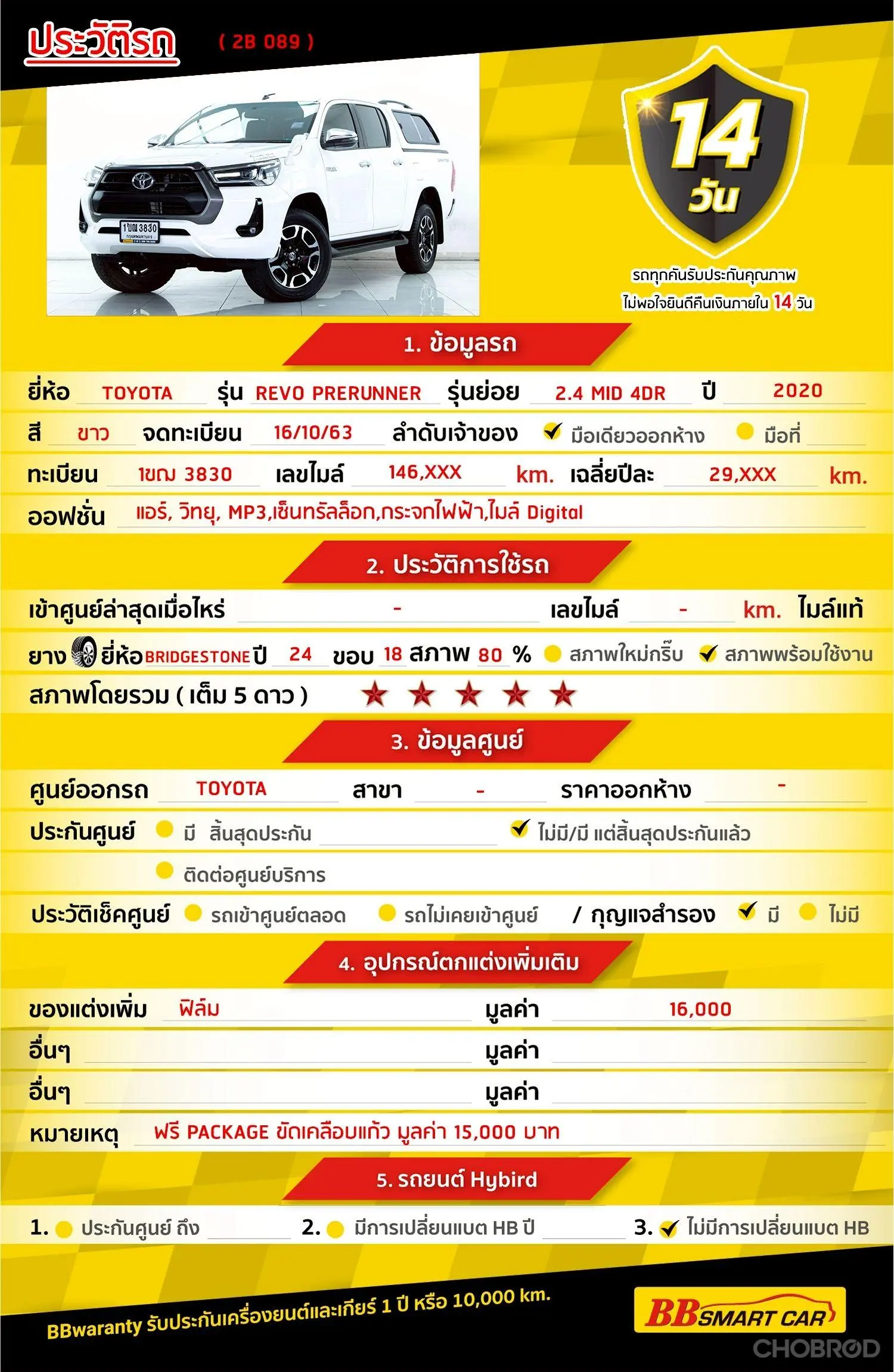 TOYOTA REVO 2.4 PRERUNNER 4Dr AT 2020 ออกรถ 0 บาท จัดได้ 629,000 บ. Line : @*******แสดงข้อมูล 🔥จอง 199 บาท ส่งบัตรประชาชน รู้ผลอนุมัติภายใน 30 นาที ไม่ผ่านคืนเงินจองทุกกรณี 🔥ซื้อรถกับ BB พร้อมให้คำปรึกษา แก้ทุกปัญหา ให้ทุกเรื่อง บริการ call center 24 ชม. 🔥BB Care Plus รับประกันหลังการขาย สูงสุด 2 ปี หรือ 20,000km. 🔥มีรถให้เลือกมากกว่า 1,800 คัน บีบีสมาร์ทคาร์ 2 สาขาแคราย รหัสรถ 2B089 ราคา 609,000 บาท ผ่อนเพียง 10,363 บาท Brand. : TOYOTA Year. : 2020 Model. : REVO Grade. : 2.4 PRERUNNER DBL CAB Engine. : 2400 CC Type. : ดีเซล Gearbox : AT Color. : ขาว Mileage. : 146,900 KM. (ซื้อสด ราคานี้ยังไม่รวมค่าดำเนินการ 10,000 บ.) 🚩 Price. 609,000 บาท ยอดจัด : 619,000 บาท เงินดาวน์ : 0 บาท ประกันภัย : ฟรีประกันภัย 1 ปี ค่าดำเนินการ : 10,000 บาท รวมออกรถ : 0 บาท ผ่อน 36 งวด = 19,938 บาท ผ่อน 48 งวด = 15,338 บาท ผ่อน 60 งวด = 12,745 บาท ผ่อน 72 งวด = 11,401 บาท ผ่อน 84 งวด = 10,363 บาท ***เงื่อนไขเป็นไปตามที่ไฟแนนซ์กำหนด*** โปรโมชั่นพิเศษ สำหรับลูกค้าเครดิตดีเลือกรับเรทดอกเบี้ยพิเศษ 📍36 งวด = 1.29 % 📍48 งวด = 1.99 % 📍60 งวด = 2.39 % 📍72 งวด = 3.59 % เงื่อนไข โปรโมชั่น ดอกเบี้ยเริ่มต้น 1.29% ตลอดอายุสัญญา - ยอดจัดไฟแนนซ์ 300,000-600,000 บาท - ผ่อนสูงสุด 72 เดือน - เป็นลูกค้าประวัติดี พนักงานประจำเงินเดือน 20,000 ขึ้นไป - ค่าดำเนินการแคมเปญ 20,000 บาท (รวมในยอดจัดได้) 🎗Car Hightlight รถสวยๆ วันนี้ขอแนะนำ TOYOTA REVO 2.4 PRERUNNER DOUBLE CAB 1 :ระบบนำทาง Navigation System 2 : เบาะนั่งคนขับ ปรับด้วยมือ 6 ทิศทาง 3 : ไฟหน้า Projector Lens แบบ LED 🎗ภายใน. - ภายในห้องโดยสารโทนสีดำ - เบาะนั่งหุ้มด้วยหนังสีดำ - เบาะนั่งคนขับ ปรับด้วยไฟฟ้า 6 ทิศทาง - เบาะนั่งผู้โดยสารตอนหน้า ปรับด้วยมือ 4 ทิศทาง - พวงมาลัยปรับได้ 4 ทิศทาง (ขึ้น-ลง-เข้า-ออก) - สวิตซ์ควบคุมเครื่องเสียง – หน้าจอ MID บนพวงมาลัย - ระบบเซ็นทรัลล็อค พร้อมระบบล็อคอัตโนมัติ Speed Auto Lock - สวิตซ์เลือกโหมดการขับขี่ Eco / Power - ระบบปรับอากาศแบบอัตโนมัติ พร้อมจอแสดงผลแบบดิจิตอล - ช่องเก็บของแบบรักษาความเย็น Cool Box - เครื่องเสียงวิทยุ AM/FM CD MP3 และ DVD - หน้าจอระบบสัมผัส Touchscreen รองรับระบบ T-Connect - ระบบนำทาง Navigation System - ระบบเบรก ABS / EBD - ถุงลมนิรภัย 3 ตำแหน่ง (คู่หน้า-หัวเข่าคนขับ) 🎗ภายนอก. บอดี้รถสีขาว สวยมากค่ะ กระจังหน้าสีดำสุดเท่ - ไฟหน้า Projector Lens แบบ LED - ระบบปรับระดับไฟหน้า สูง-ต่ำอัตโนมัติ - ระบบไฟหน้า Follow Me Home - ไฟ Daytime Running Lights แบบ LED - ไฟตัดหมอกคู่หน้า แบบ LED - ไฟเบรกดวงที่ 3 แบบ LED 🎗ความคุ้มค่า สำหรับคันนี้หากเปรียบเทียบราคากับคุณภาพ คันนี้ถือว่าคุ้มค่ามากค่ะ ผ่อนสบายๆก็มีรถขับได้ รถดีมีคุณภาพแบบนี้รีบตัดสินใจซื้อได้เลราคานี้มาไวไปไวนะคะ ⭐️การรับประกันหลังการขาย BB Care Plus สูงสุด 2 ปี หรือ 20,000 km. ด้วยช่างที่ผ่านการอบรมจากศูนย์ชั้นนำของประเทศ 🎉🎉 Special offer เฉพาะ บีบีสมาร์ทคาร์ ที่นี่ที่เดียว ⭐️ดอกเบี้ยเริ่มต้น 1.29% มีไฟแนนซ์รองรับหลายที่ค่ะ ⭐️ฟรี