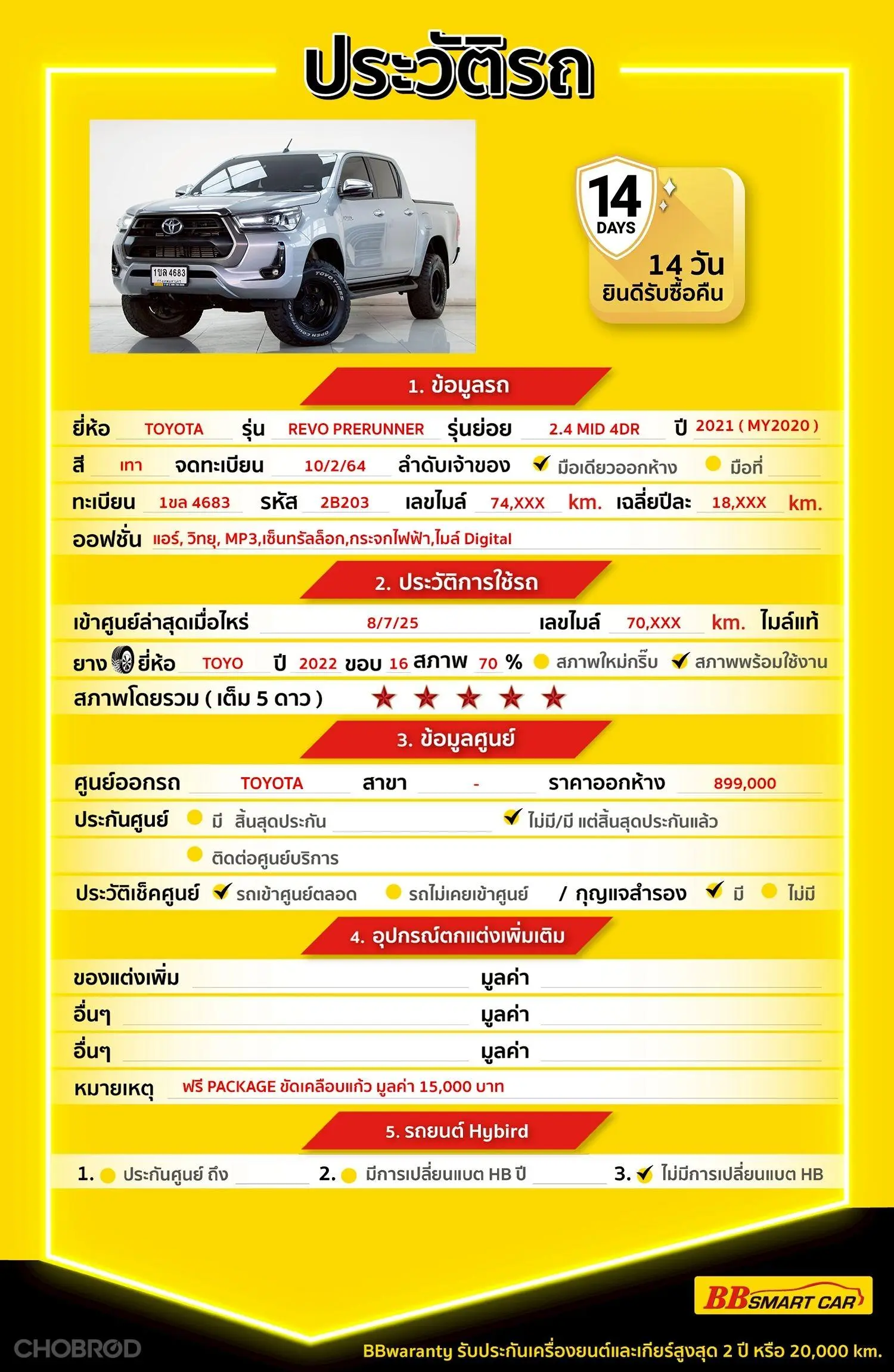 TOYOTA REVO 2.4 MID PRERUNNER DOUBLE CAB MT 2021 ออกรถ 0 บาท จัดได้ 549,000 บ Line : @bbcar02 🔥จอง 199 บาท ส่งบัตรประชาชน รู้ผลอนุมัติภายใน 30 นาที ไม่ผ่านคืนเงินจองทุกกรณี 🔥ซื้อรถกับ BB พร้อมให้คำปรึกษา แก้ทุกปัญหา ให้ทุกเรื่อง บริการ call center 24 ชม. 🔥BB Care Plus รับประกันหลังการขาย สูงสุด 2 ปี หรือ 20,000km. 🔥มีรถให้เลือกมากกว่า 1,800 คัน สาขา2 สี่แยกแครายใกล้เดอะมอลล์งามวงศ์วาน รหัสรถ 2B203 ราคา 529,000 บ. ผ่อนเพียง 9,023 บ. Brand. : TOYOTA Year. : 2021 Model. : REVO Grade. : 2.4 MID PRERUNNER DOUBLE CAB Engine. : 2400 CC Type. : ดีเซล Gearbox. : MT Color. : เทา Mileage. : 74,900 km. (ซื้อสด ราคานี้ยังไม่รวมค่าดำเนินการ 10,000 บ.) 🚩 Price. 529,000 บาท ยอดจัด : 539,000 บาท เงินดาวน์. : 0 บาท ประกันภัย : ฟรีประกันภัย 1 ปี ค่าดำเนินการ : 10,000 บาท รวมออกรถ 0 บาท ผ่อน36 = 17,361 บาท ผ่อน48 = 13,356 บาท ผ่อน 60 = 11,097 บาท ผ่อน 72 = 9,927 บาท ผ่อน 84 = 9,023 บาท **เงื่อนไขเป็นไปตามที่ไฟแนนซ์กำหนด** โปรโมชั่นพิเศษ สำหรับลูกค้าเครดิตดี 🚩รับเรทดอกเบี้ยพิเศษ 📍36 งวด = 1.29 % 📍48 งวด = 1.99 % 📍60 งวด = 2.39 % 📍72 งวด = 3.59 % 🔥 เงื่อนไข โปรโมชั่น ดอกเบี้ยเริ่มต้น 1.29% ตลอดอายุสัญญา - ยอดจัดไฟแนนซ์ 300,000-600,0000 บาท - ผ่อนสูงสุด 72 เดือน - เป็นลูกค้าประวัติดี พนักงานประจำเงินเดือน 20,000 ขึ้นไป - ค่าดำเนินการแคมเปญ 20,000 บาท (รวมในยอดจัดได้) 🎗Car Hightlight รถสวยๆ วันนี้ขอแนะนำ TOYOTA REVO มีพละกำลังเครื่องยนต์ที่ใช้ได้อย่างเหลือเฟือ ลุยได้ทุกสถานการณ์ แถมออปชั่นภายในครบเครื่อง ช่วงล่างนุ่มนวลดูดซับแรงสะเทือนได้ดีมาก ใช้งานได้ง่ายสะดวกสบายสุดๆเลยค่ะ 🎗ภายใน ภายในสะอาดเรียบร้อย มาพร้อมกับ Airbag วิทยุ - CD ไมล์ Digital เบรค ABS พวงมาลัย Multifunction กระจกมองข้างปรับไฟฟ้า Cruise Control เบาะกำมะหยี่ กระจกไฟฟ้า แอร์ อ๊อฟชั่นครบคันเลยค่ะ สภาพใหม่มากค่ะ 🎗ภายนอก TOYOTA REVO คันนี้ ภายนอกเป็นสีเทา พร้อมบรรทุกเต็มพิกัด และมีอัตราเร่งที่น่าประทับใจ ตัวเครื่องเดิมจากศูนย์ มาพร้อม ล้อแม็ก ไฟตัดหมอก ไฟเลี้ยวกระจกมองข้าง กระจังหน้าสีดำเพิ่มความสปอร์ตน่าค้นหา รูปทรงรถดูสมาร์ทมาก 🎗ความคุ้มค่า รถสภาพนี้หายากมากค่ะบอกเลย รถมือเดียวไมล์แท้อีกด้วย คัดเลือกคันนี้มาแล้วค่ะสภาพดีมากๆ เทียบกับราคานี้ถือว่าคุ้มค่ามากๆค่ะ มาดูรถไม่ผิดหวังแน่นนอนค่ะ ⭐️การรับประกันหลังการขาย BB Care Plus สูงสุด 2 ปี หรือ 20,000 km. ด้วยช่างที่ผ่านการอบรมจากศูนย์ชั้นนำของประเทศ 🎉🎉 Special offer เฉพาะ บีบีสมาร์ทคาร์ ที่นี่ที่เดียว ⭐️ดอกเบี้ยเริ่มต้น 1.29% มีไฟแนนซ์รองรับหลายที่ค่ะ ⭐️ฟรี!! แพคเก็จ ขัดเคลือบแก้ว มูลค่า 15,000 บาท ทุกคัน ⭐️อนุมัติไว 30 นาที นำเอกสารมาให้ครบรับรถกลับบ้านทันทีค่ะ ⭐️BB Care Plus รับประกันหลังการขาย สูงสุด 2 ปี หรือ 20,000 km. ⭐️มี 6 สาขา ในกรุงเทพและปริมณฑลใกล้บ้านท่าน ⭐️รถทุกคันผ่านตรวจสอบ Inspection เรียบแล้วค่ะ ผ่าน 5 ดาวทุกคันค่ะ ⭐️