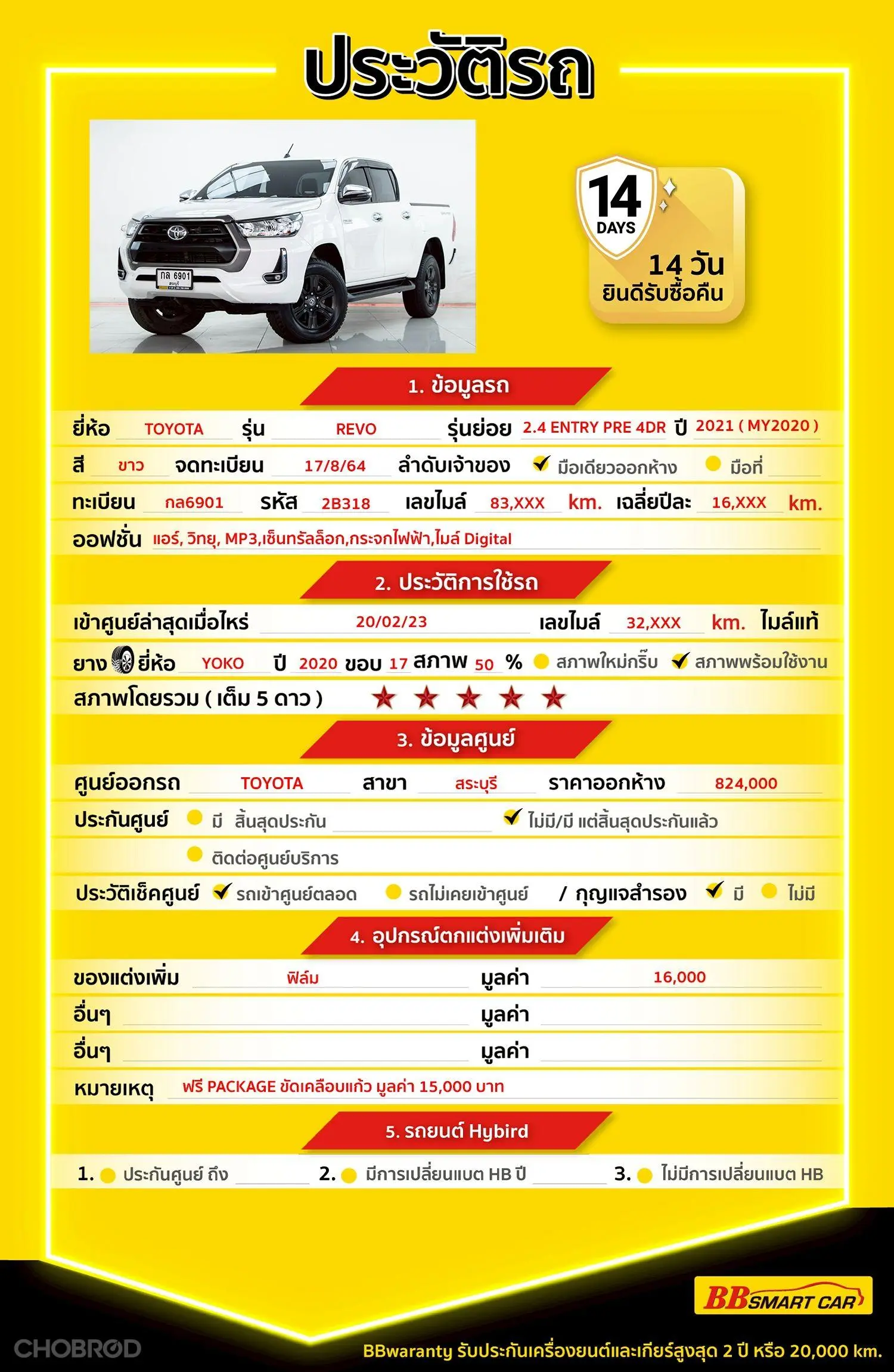 มีการรับประกันจากดีลเลอร์ (6 เดือน) มีบริการช่วยเหลือฉุกเฉินบนท้องถนน 24 ชม. จากดีลเลอร์