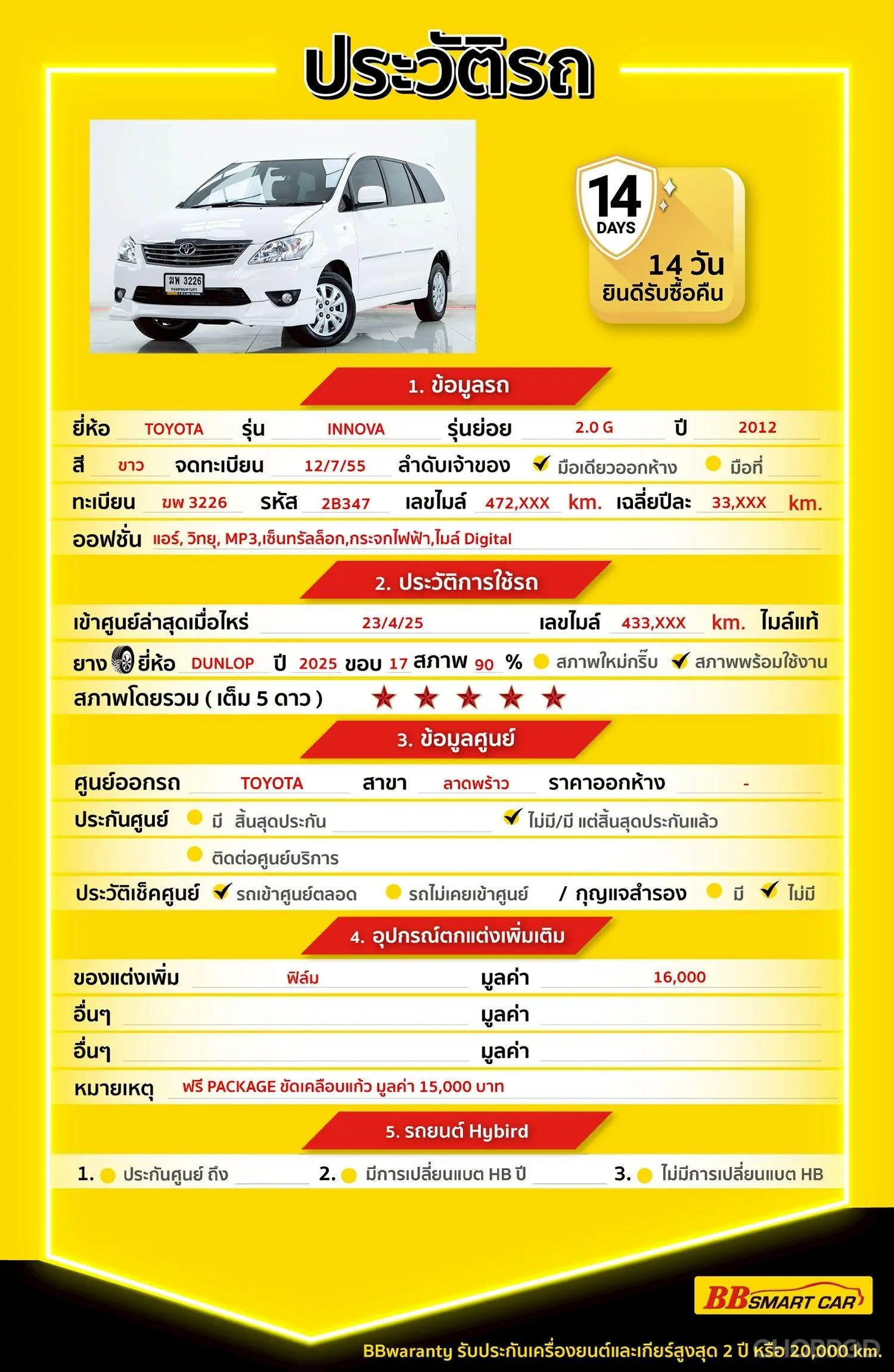 - ผ่านการตรวจสภาพรถทุกจุดสำคัญ