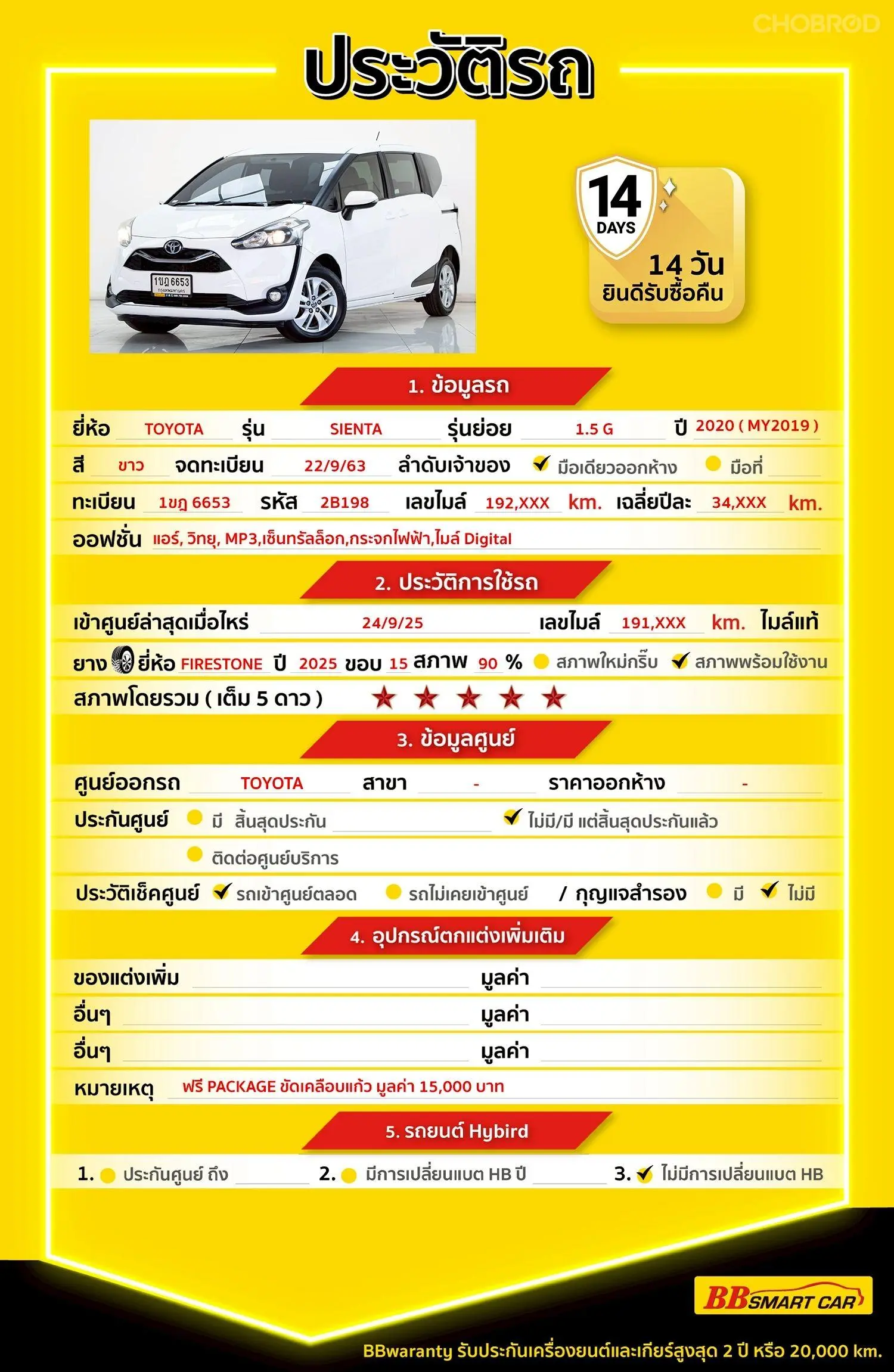 มีการรับประกันจากดีลเลอร์ (6 เดือน) มีบริการช่วยเหลือฉุกเฉินบนท้องถนน 24 ชม. จากดีลเลอร์