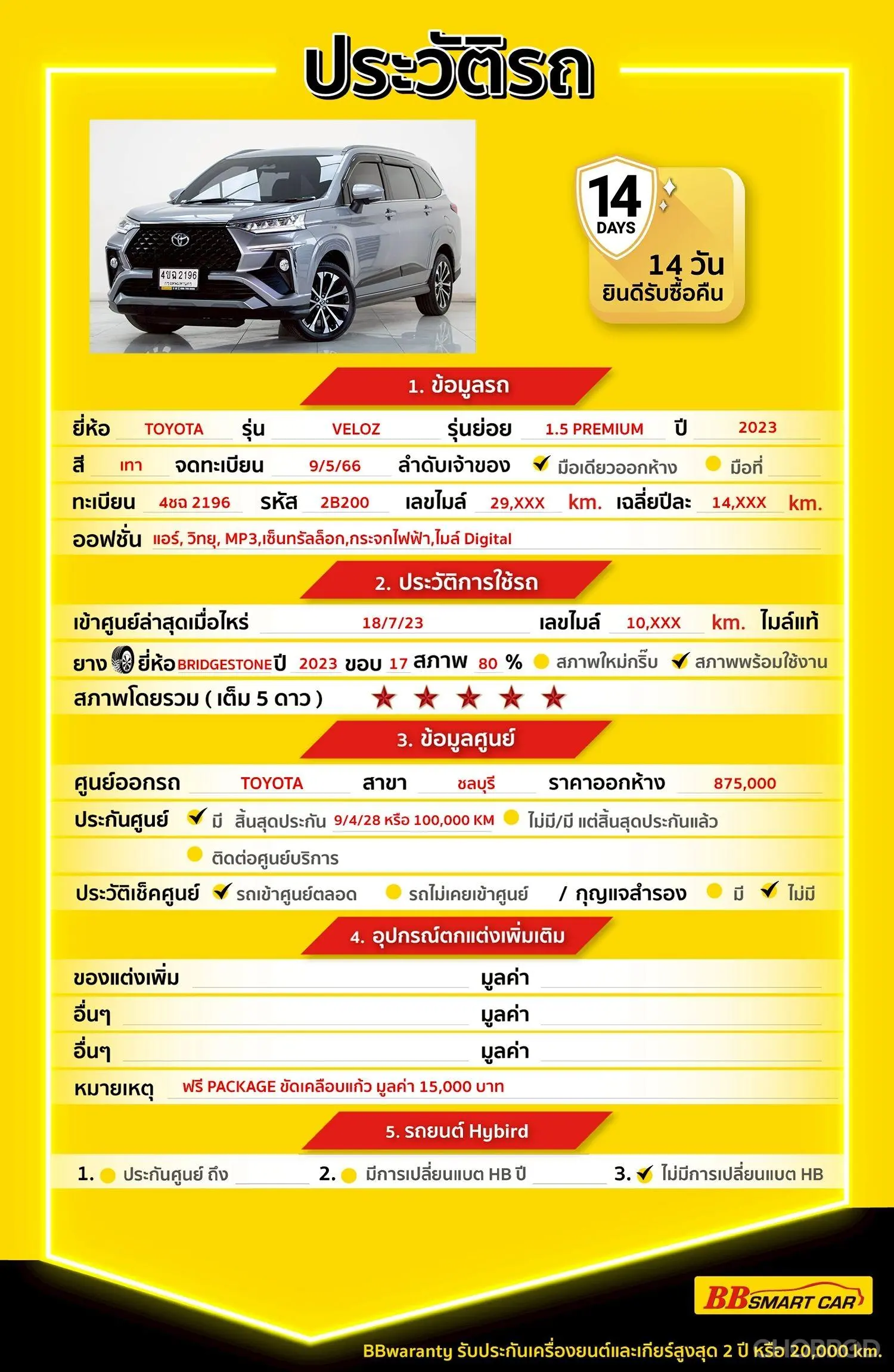 TOYOTA VELOZ 1.5 PREMIUM AT 2023 ออกรถ 0 บาท จัดได้ 629,000 บ. Line:@bbcar02 🔥เรามีรถรุ่นนี้ให้เลือกชมอีก 7 คัน 🔥รถมือเดียวออกห้าง ไมล์น้อยเช็คศูนย์ตลอด 🔥ราคา 609,000 จัดได้ 629,000 บาท (สามารถจัดเต็มวงเงินได้) 🔥รับประกันคุณภาพ ไม่พอใจยินดีคืนเงินภายใน 14วัน ที่เดียวในประเทศ 🔥พิเศษดอกเบี้ยเริ่มต้น 1.29% 🔥จอง 199 บาท ส่งบัตรประชาชน รู้ผลอนุมัติภายใน 30 นาที ไม่ผ่านคืนเงินจองทุกกรณี 🔥ซื้อรถกับ BB พร้อมให้คำปรึกษา แก้ทุกปัญหา ให้ทุกเรื่อง บริการ call center 24 ชม. 🔥BB Care Plus รับประกันหลังการขาย สูงสุด 2 ปี หรือ 20,000km. 🔥มีรถให้เลือกมากกว่า 1,800 คัน บีบีสมาร์ทคาร์ 2 สาขาแคราย รหัสรถ 2B200 ราคา 609,000 บ. ผ่อนเพียง 10,363 บ. Brand : TOYOTA Year : 2023 Model : VELOZ Grade : 1.5 PREMIUM Engine : 1500 CC. Type : เบนซิน Gearbox : AT Color : เทา Mileage : 29,368 km. (ซื้อสด ราคานี้ยังไม่รวมค่าดำเนินการ 10,000 บ.) 🚩 Price. 609,000 บาท ยอดจัด : 619,000 บาท เงินดาวน์. : ฟรีเงินดาวน์ ประกันภัย : ฟรีประกันภัย 1 ปี ค่าดำเนินการ : 10,000 บาท รวมออกรถ 0 บาท ผ่อน36 งวด = 19,938 บาท ผ่อน48 งวด = 15,338 บาท ผ่อน60 งวด = 12,745 บาท ผ่อน72 งวด = 11,401 บาท ผ่อน84 งวด = 10,363 บาท *เงื่อนไขเป็นไปตามที่ไฟแนนซ์กำหนด โปรโมชั่นพิเศษ สำหรับลูกค้าเครดิตดี 🚩เลือกรับเรทดอกเบี้ยพิเศษ 📍36 งวด = 1.29 % 📍48 งวด = 1.99 % 📍60 งวด = 2.39 % 📍72 งวด = 3.59 % 🔥 เงื่อนไข โปรโมชั่น ดอกเบี้ยเริ่มต้น 1.29% ตลอดอายุสัญญา - ยอดจัดไฟแนนซ์ 300,000-600,0000 บาท - ผ่อนสูงสุด 72 เดือน - เป็นลูกค้าประวัติดี พนักงานประจำเงินเดือน 20,000 ขึ้นไป - ค่าดำเนินการแคมเปญ 20,000 บาท (รวมในยอดจัดได้) 🎗Car Hightlight !!!!! รถสวยๆ วันนี้ขอแนะนำ TOYOTA VELOZ 1.5 PREMIUM สำหรับคันนี้ สามารถบรรจุทั้งของและผู้โดยสารได้ดีมากค่ะ ภายในมีออปชั่นเยอะมาก มี ได้มอบความเพลิดเพลินในการเดินทาง และแอร์ที่เย็นฉ่ำ ผู้โดยสารสามารถขึ้นได้อย่างสะดวกสบาย และบันไดข้างที่อำนวยความสะดวกเป็นอย่างมากค่ะ 🎗ภายใน. สำหรับ TOYOTA VELOZ แอร์ กระจกมองข้างปรับไฟฟ้า พวงมาลัยเพาเวอร์ แอร์ AUTO กุญแจรีโมท-สัญญานกันขโมย Airbag เซ็นทรัลล๊อก เบรค ABS กระจกไฟฟ้า พวงมาลัย Multifunction เบาะผ้า จอ LCD เล่น DVD เบรกมือไฟฟ้า วิทยุ - CD 🎗ภายนอก ไฟเลี้ยวกระจกมองข้าง กระจกมองข้างพับไฟฟ้า ไฟตัดหมอก คิ้วกันสาด กล้องส่องหลัง 🎗ความคุ้มค่า สำหรับคันนี้หากเปรียบเทียบราคากับคุณภาพ ถือว่าคุ้มค่ามากค่ะ ผ่อนสบายๆก็มีรถขับได้ รถดีมีคุณภาพแบบนี้รีบตัดสินใจซื้อได้เลยค่ะ ราคานี้มาไวไปไวนะครับ ⭐️การรับประกันหลังการขาย BB Care Plus สูงสุด 2 ปี หรือ 20,000 km. ด้วยช่างที่ผ่านการอบรมจากศูนย์ชั้นนำของประเทศ 🎉🎉 Special offer เฉพาะ บีบีสมาร์ทคาร์ ที่นี่ที่เดียว ⭐️ดอกเบี้ยเริ่มต้น 1.29% มีไฟแนนซ์รองรับหลายที่ค่ะ ⭐️ฟรี!! แพคเก็จ ขัดเคลือบแก้ว มูลค่า 15,000 บาท ทุกคัน ⭐️อนุมัติไว 30 นาที นำเอกสารมาให้ครบรับรถกลับบ้านทันทีค่