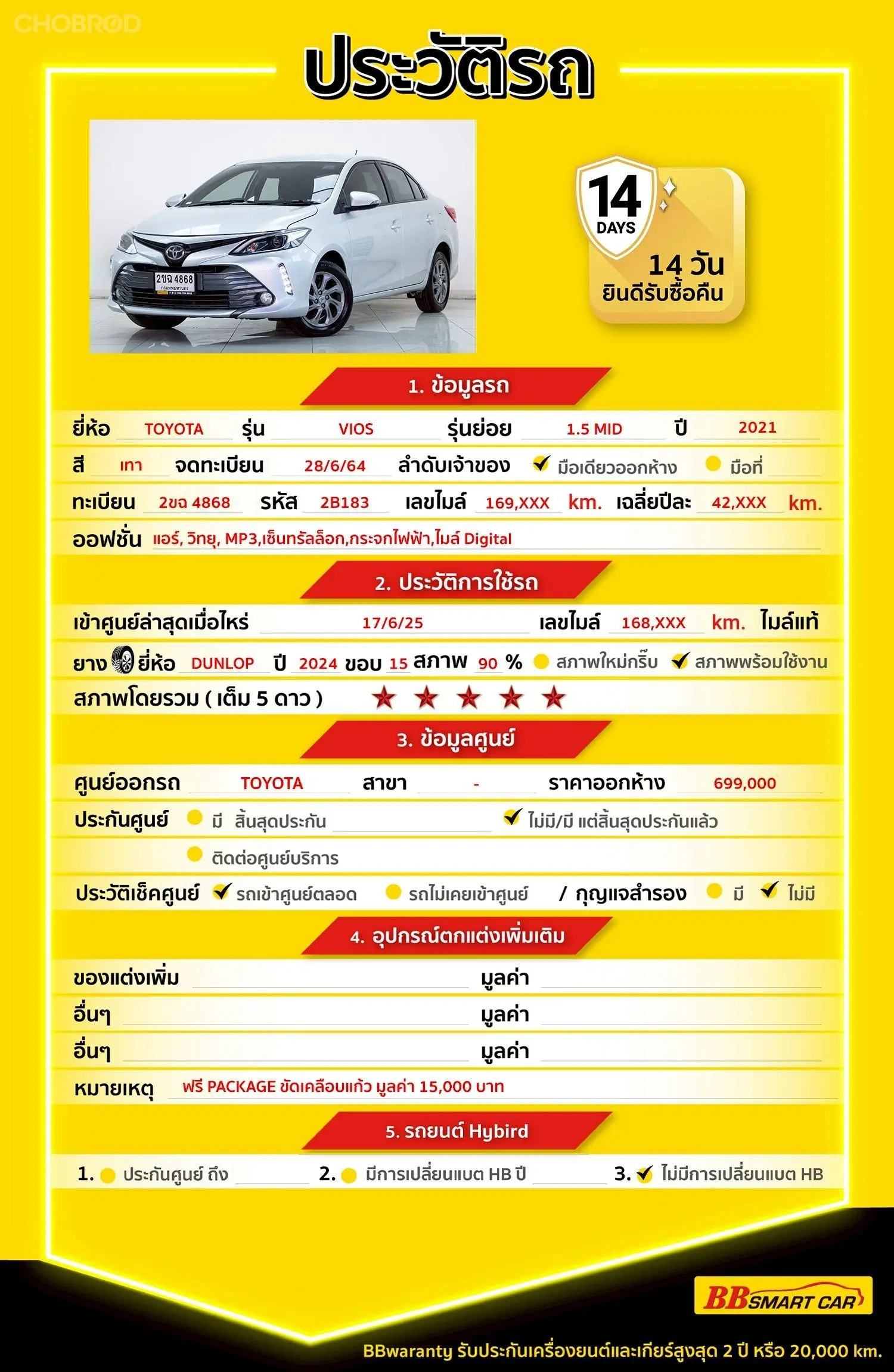 TOYOTA VIOS 1.5 MID AT 2021 ออกรถ 0 บาท จัดได้ 364,000 บ. Line:@bbcar02 🔥จอง 199 บาท ส่งบัตรประชาชน รู้ผลอนุมัติภายใน 30 นาที ไม่ผ่านคืนเงินจองทุกกรณี 🔥ซื้อรถกับ BB พร้อมให้คำปรึกษา แก้ทุกปัญหา ให้ทุกเรื่อง บริการ call center 24 ชม. 🔥BB Care Plus รับประกันหลังการขาย สูงสุด 2 ปี หรือ 20,000 km. 🔥มีรถให้เลือกมากกว่า 1,800 คัน สาขา2 สี่แยกแครายใกล้เดอะมอลล์งามวงศ์วาน รหัสรถ 2B183 ราคา 344,000 บาท ผ่อนเพียง 6,010 บาท Brand. : TOYOTA Year. : 2021 Model. : VIOS Grade. : 1.5 MID Engine. : 1,500 CC Type. : เบนซิน Gearbox : AT Color. : เทา Mileage. : 169,500 KM. (ซื้อสด ราคานี้ยังไม่รวมค่าดำเนินการ 10,000 บ.) 🚩 Price. 344,000 บาท ยอดจัด : 354,000 บาท เงินดาวน์ : 0 บาท ประกันภัย : ฟรีประกันภัย 1 ปี ค่าดำเนินการ : 10,000 บาท รวมออกรถ : 0 บาท ผ่อน36 = 11,563 บาท ผ่อน48 = 8,896 บาท ผ่อน60 = 7,392 บาท ผ่อน72 = 6,613 บาท ผ่อน84 = 6,010 บาท **เงื่อนไขเป็นไปตามที่ไฟแนนซ์กำหนด** โปรโมชั่นพิเศษ สำหรับลูกค้าเครดิตดี 🚩เลือกรับเรทดอกเบี้ยพิเศษ 📍36 งวด = 1.29 % 📍48 งวด = 1.99 % 📍60 งวด = 2.39 % 📍72 งวด = 3.59 % 🔥 เงื่อนไข โปรโมชั่น ดอกเบี้ยเริ่มต้น 1.29% ตลอดอายุสัญญา - ยอดจัดไฟแนนซ์ 300,000-600,0000 บาท - ผ่อนสูงสุด 72 เดือน - เป็นลูกค้าประวัติดี พนักงานประจำเงินเดือน 20,000 ขึ้นไป - ค่าดำเนินการแคมเปญ 20,000 บาท (รวมในยอดจัดได้) 🎗Car Hightlight รถสวยๆ วันนี้ขอแนะนำ TOYOTA VIOS 1.5 MID รถยนต์นั่งขนาดเล็กยอดนิยมของคนไทย ภายใต้แนวคิด "New Vios Super Spec" โดยเพิ่มสเปคใหม่เพื่อเน้นความสะดวกสบายและปลอดภัยในการขับขี่ เหมาะสำหรับการขับขี่ระยะใกล้ และไกล คงไว้ซึ่งรูปลักษณ์ดีไซน์ภายนอก และภายในที่สวยสะดุดตา พร้อมสมารรถนะการขับขี่ที่ยอดเยี่ยม และระบบความปลอดภัยมาตรฐานแบบครบครัน มาพร้อมเครื่องยนต์ 2NR-FBE แบบ 4 สูบแถวเรียง DOHC 16 วาล์ว Dual VVT-i ให้แรงม้าสูงสุด 108 แรงม้า ที่ 6,000 รอบ/นาที แรงบิดสูงสุด 140 นิวตัน-เมตร ที่ 4,200 รอบ/นาที และระบบส่งกำลังแบบอัตโนมัติ CVT 7 สปีดพร้อม Sequential Shift ตอบสนองต่อการใช้งานอย่างดี และทำให้การขับขี่นุ่ม 🎗ภายใน เบรค ABS วิทยุ - CD พวงมาลัย Multifunction ไมล์ Digital เบาะหนังแท้ เซ็นทรัลล๊อก แอร์ Airbag กระจกมองข้างปรับไฟฟ้า พวงมาลัยเพาเวอร์ กระจกไฟฟ้า 🎗ภายนอก กระจกมองข้างพับไฟฟ้า ล้อแม็ก ไฟเลี้ยวกระจกมองข้าง ไฟตัดหมอก กระจังหน้าสีดำดีไซน์ทันสมัย 🎗ความคุ้มค่า สำหรับคันนี้หากเปรียบเทียบราคากับคุณภาพ คันนี้ถือว่าคุ้มค่ามากค่ะ ผ่อนสบายๆก็มีรถขับได้ รถดีมีคุณภาพแบบนี้รีบตัดสินใจซื้อได้เลราคานี้มาไวไปไวนะคะ ⭐️การรับประกันหลังการขาย BB Care Plus สูงสุด 2 ปี หรือ 20,000 km. ด้วยช่างที่ผ่านการอบรมจากศูนย์ชั้นนำของประเทศ 🎉🎉 Special offer เฉพาะ บีบีสมาร์ทคาร์ ที่นี่ที่เดียว ⭐️ดอกเบี้ยเริ่มต้น 1.29% มีไฟแนนซ์รองรับหลายที่ค่ะ ⭐️ฟรี!! แพคเก็จ ขัดเคลือบแก้ว มูลค่า 15,000 บาท ทุกคัน ⭐️อนุมัติไว 30 นาที นำเอกสารมาให้ครบ