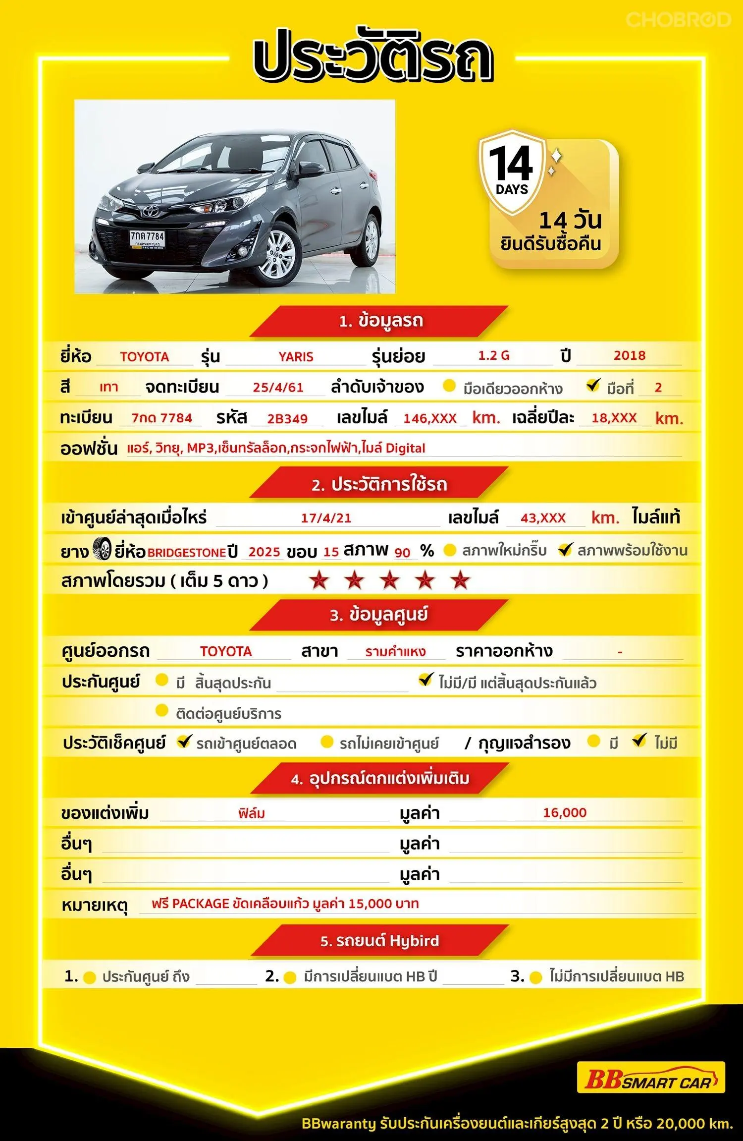 TOYOTA YARIS ECO 1.2 G 5DR AT 2018 ออกรถ 0 บาท รหัสรถ 2B349 Line :@bbcar02 🔥มีรถให้เลือกมากกว่า 1,800 คัน 🔥รถทุกคันผ่านตรวจสอบ Inspection เรียบแล้วค่ะ ผ่าน 5 ดาวทุกคันค่ะ 🔥ซื้อรถกับ BB พร้อมให้คำปรึกษา แก้ทุกปัญหา ให้ทุกเรื่อง บริการ call center 24 ชม. 🔥BB Care Plus รับประกันหลังการขาย สูงสุด 2 ปี หรือ 20,000 km. 🔥ฟรี!! แพคเก็จ ขัดเคลือบแก้ว มูลค่า 15,000 บาท ทุกคัน 🔥มี 6 สาขา ในกรุงเทพและปริมณฑลใกล้บ้านท่าน สาขา2 สี่แยกแครายใกล้เดอะมอลล์งามวงศ์วาน รหัสรถ 2B349 ราคา 319,000 บาท ผ่อนเพียง 5,508 บาท Brand. : TOYOTA Year. : 2018 Model. : YARIS Grade. : 1.2 G Engine. : 1200 CC Type. : เบนซิน Gearbox : AT Color. : เทา Mileage. : 146,500 KM. (ซื้อสด ราคานี้ยังไม่รวมค่าดำเนินการ 10,000 บ.) 🚩 Price. 319,000 บาท ยอดจัด : 329,000 บาท เงินดาวน์ : 0 บาท ประกันภัย : ฟรีประกันภัย 1 ปี ค่าดำเนินการ : 10,000 บาท รวมออกรถ : 0 บาท ผ่อน 36 งวด = 10,597 บาท ผ่อน 48 งวด = 8,152 บาท ผ่อน 60 งวด = 6,774 บาท ผ่อน 72 งวด = 6,059 บาท ผ่อน 84 งวด = 5,508 บาท ***เงื่อนไขเป็นไปตามที่ไฟแนนซ์กำหนด** โปรโมชั่นพิเศษ สำหรับลูกค้าเครดิตดีลือกรับเรทดอกเบี้ยพิเศษ 📍36 งวด = 1.29 % 📍48 งวด = 1.99 % 📍60 งวด = 2.39 % 📍72 งวด = 3.59 % 🔥 เงื่อนไข โปรโมชั่น ดอกเบี้ยเริ่มต้น 1.29% ตลอดอายุสัญญา - ยอดจัดไฟแนนซ์ 300,000-600,000 บาท - ผ่อนสูงสุด 72 เดือน - เป็นลูกค้าประวัติดี พนักงานประจำเงินเดือน 20,000 ขึ้นไป - ค่าดำเนินการแคมเปญ 20,000 บาท (รวมในยอดจัดได้) 🎗Car Hightlight รถสวยๆ วันนี้ขอแนะนำ TOYOTA YARIS ECO 1.2 G AT 2020 มาพร้อมรูปลักษณ์ที่ทันสมัย มีความโมเดิร์นเป็นเอกลักษณ์สะดุดตาทั้งภายนอกและภายใน พร้อมอุปกรณ์อำนวยความสะดวกครบครัน ช่วงล่างที่แน่น ทำให้เกาะถนน และมีการทรงตัวที่ดี ทำให้ขับขี่ได้อย่างมั่นใจและรู้สึกปลอดภัย สภาพป้ายแดงค่ะ ราคาไม่แพง ไมล์แท้ รถดูแลศูนย์ตลอดค่ะ 🎗ภายใน พวงมาลัย Multifunction แอร์ กระจกไฟฟ้า กระจกมองข้างปรับไฟฟ้า Airbag เบรค ABS แอร์ AUTO เซ็นทรัลล๊อก พวงมาลัยเพาเวอร์ Cruise Control ไมล์ Digital 🎗ภายนอก บอดี้รถสีเทาดำ เท่มากๆ มาพร้อม กระจกมองข้างพับไฟฟ้า ไฟตัดหมอก ล้อแม็ก ไฟเลี้ยวกระจกมองข้าง 🎗ความคุ้มค่า สำหรับคันนี้หากเปรียบเทียบราคากับคุณภาพ คันนี้ถือว่าคุ้มค่ามากค่ะ ผ่อนสบายๆก็มีรถขับได้ รถดีมีคุณภาพแบบนี้รีบตัดสินใจซื้อได้เลราคานี้มาไวไปไวนะคะ