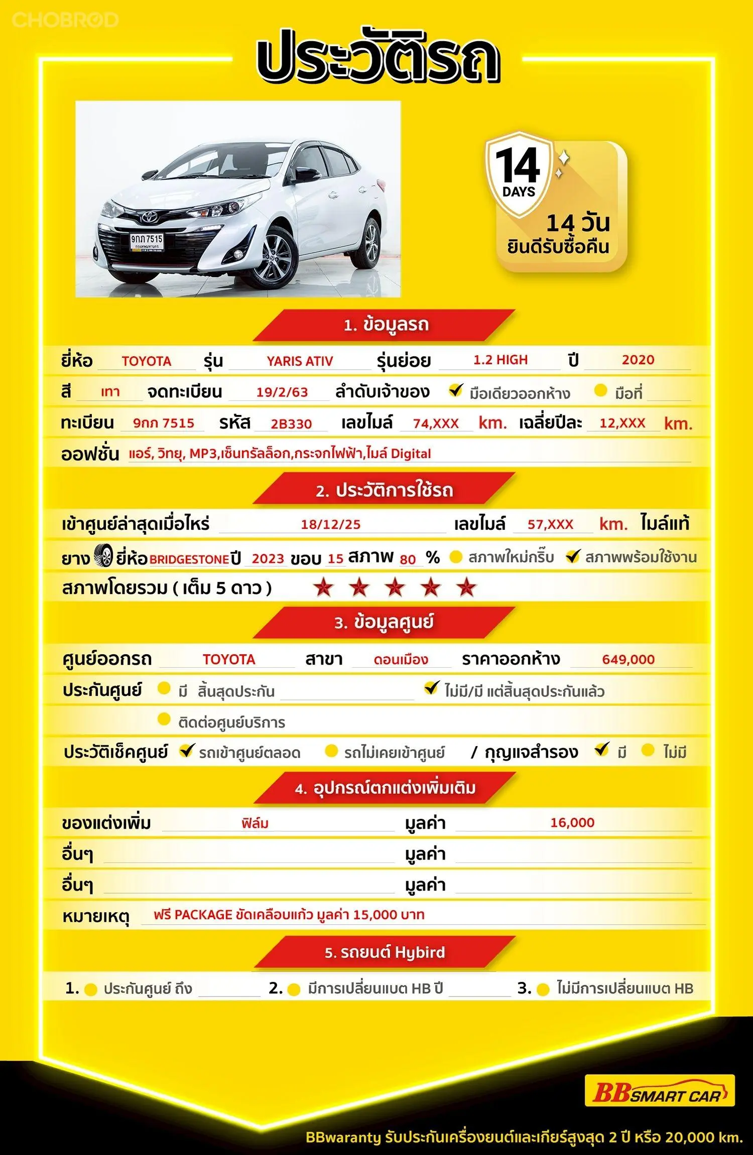 มีการรับประกันจากดีลเลอร์ (6 เดือน) มีบริการช่วยเหลือฉุกเฉินบนท้องถนน 24 ชม. จากดีลเลอร์