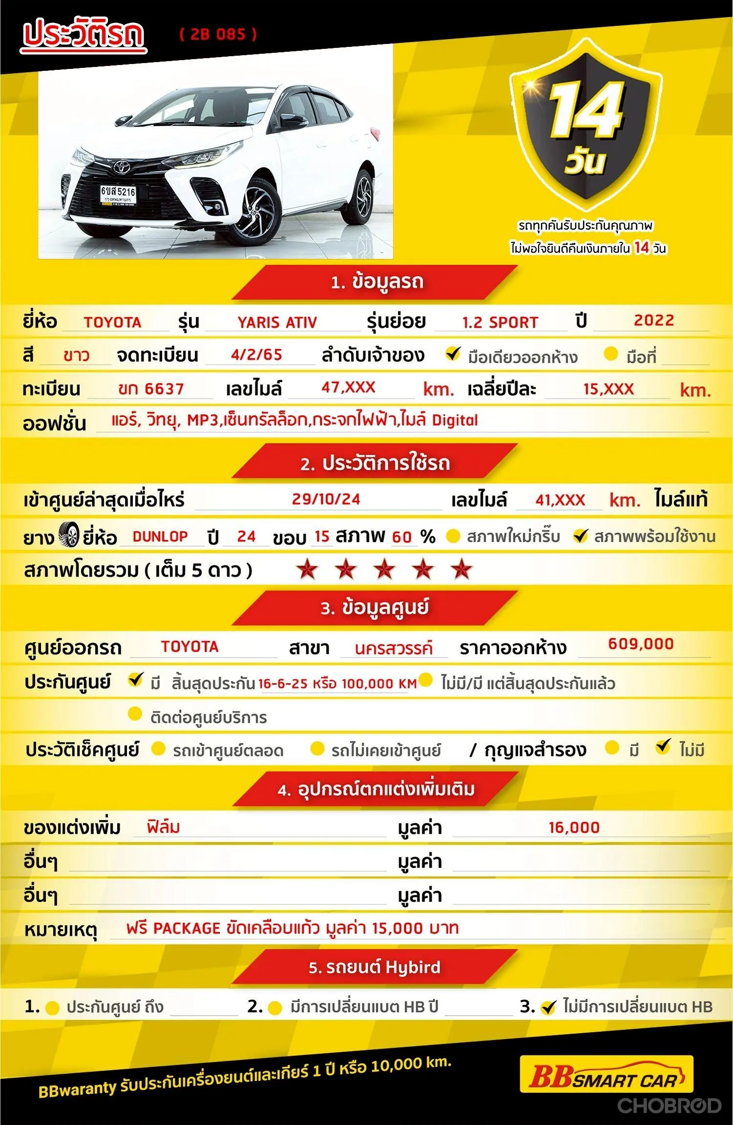 TOYOTA YARIS ATIV 1.2 SPORT AT 2022 ออกรถ 0 บาท จัดได้ 379,000 บ. Line : @*******แสดงข้อมูล 🔥เรามีรถรุ่นนี้ให้เลือกชมอีก 56 คัน 🔥รถมือเดียวออกห้าง ไมล์น้อยเช็คศูนย์ตลอด 🔥ราคา 369,000 จัดได้ 379,000 บาท (สามารถจัดเต็มวงเงินได้) 🔥รับประกันคุณภาพ ไม่พอใจยินดีคืนเงินภายใน 14วัน ที่เดียวในประเทศ 🔥พิเศษดอกเบี้ยเริ่มต้น 1.29% 🔥จอง 199 บาท ส่งบัตรประชาชน รู้ผลอนุมัติภายใน 30 นาที ไม่ผ่านคืนเงินจองทุกกรณี 🔥ซื้อรถกับ BB พร้อมให้คำปรึกษา แก้ทุกปัญหา ให้ทุกเรื่อง บริการ call center 24 ชม. 🔥BB Care Plus รับประกันหลังการขาย สูงสุด 2 ปี หรือ 20,000km. 🔥มีรถให้เลือกมากกว่า 1,600 คัน บีบีสมาร์ทคาร์ 2 สาขาแคราย รหัสรถ 2B085 ราคา 369,000 บาท ผ่อนเพียง 6,178 บาท Brand. : TOYOTA Year. : 2022 Model. : YARIS ATIV Grade. :1.2 SPORT Engine. : 1200 CC Type. : เบนซิน Gearbox : AT Color. : ขาว Mileage. : 47,400 KM. (ซื้อสด ราคานี้ยังไม่รวมค่าดำเนินการ 10,000 บ.) 🚩 Price. 369,000 บาท ยอดจัด : 379,000 บาท เงินดาวน์ : 0 บาท ประกันภัย : ฟรีประกันภัย 1 ปี ค่าดำเนินการ : 10,000 บาท รวมออกรถ : 0 บาท ผ่อน36 = 11,886 บาท ผ่อน48 = 9,143 บาท ผ่อน60 = 7,597 บาท ผ่อน72 = 6,797 บาท ผ่อน84 = 6,178 บาท **เงื่อนไขเป็นไปตามที่ไฟแนนซ์กำหนด** โปรโมชั่นพิเศษ สำหรับลูกค้าเครดิตดี 🚩เลือกรับเรทดอกเบี้ยพิเศษ 📍36 งวด = 1.29 % 📍48 งวด = 1.99 % 📍60 งวด = 2.39 % 📍72 งวด = 3.59 % 🔥 เงื่อนไข โปรโมชั่น ดอกเบี้ยเริ่มต้น 1.29% ตลอดอายุสัญญา - ยอดจัดไฟแนนซ์ 300,000-600,0000 บาท - ผ่อนสูงสุด 72 เดือน - เป็นลูกค้าประวัติดี พนักงานประจำเงินเดือน 20,000 ขึ้นไป - ค่าดำเนินการแคมเปญ 20,000 บาท (รวมในยอดจัดได้) 🎗Car Hightlight รถสวยๆ วันนี้ขอแนะนำ TOYOTA YARIS ATIV 1.2 SPORT AT เบนซิน จุดเด่นออฟชั่น 12.2.2 : หน้าจอแสดงข้อมูลการขับขี่แบบสี TFT ขนาด 7 นิ้ว 12.2.3 : หน้าจอชุดเครื่องเสียงแบบสัมผัส ขนาด 9 นิ้ว 🎗ภายใน ไมล์ Digital กระจกมองข้างปรับไฟฟ้า แอร์ AUTO แอร์ เซ็นทรัลล๊อก เบรค ABS กระจกไฟฟ้า พวงมาลัย Multifunction Cruise Control Airbag 🎗ภายนอก ตัวรถสีขาว ล้อแม็ก ไฟตัดหมอก กระจกมองข้างพับไฟฟ้า ไฟเลี้ยวกระจกมองข้าง 🎗ความคุ้มค่า สำหรับคันนี้หากเปรียบเทียบราคากับคุณภาพ คันนี้ถือว่าคุ้มค่ามากค่ะ ผ่อนสบายๆก็มีรถขับได้ รถดีมีคุณภาพแบบนี้รีบตัดสินใจซื้อได้เลราคานี้มาไวไปไวนะคะ ⭐️การรับประกันหลังการขาย BB Care Plus สูงสุด 2 ปี หรือ 20,000 km. ด้วยช่างที่ผ่านการอบรมจากศูนย์ชั้นนำของประเทศ 🎉🎉 Special offer เฉพาะ บีบีสมาร์ทคาร์ ที่นี่ที่เดียว ⭐️ดอกเบี้ยเริ่มต้น 1.29% มีไฟแนนซ์รองรับหลายที่ค่ะ ⭐️ฟรี!! แพคเก็จ ขัดเคลือบแก้ว มูลค่า 15,000 บาท ทุกคัน ⭐️อนุมัติไว 30 นาที นำเอกสารมาให้ครบรับรถกลับบ้านทันทีค่ะ ⭐️BB Care Plus รับประกันหลังการขาย สูงสุด 2 ปี หรือ 20,000 km. ⭐️มี 6 สาขา ในกรุงเทพและปริมณฑลใกล้บ้านท่าน ⭐️รถทุกคันผ่านตรวจสอบ Inspection เรียบแล้วค่ะ ผ่าน 5 ดาวทุกคันค่ะ ⭐️เซลล์ทุกท่านเป็นมืออาชีพพร้อมให้บริการทุกท่านแน