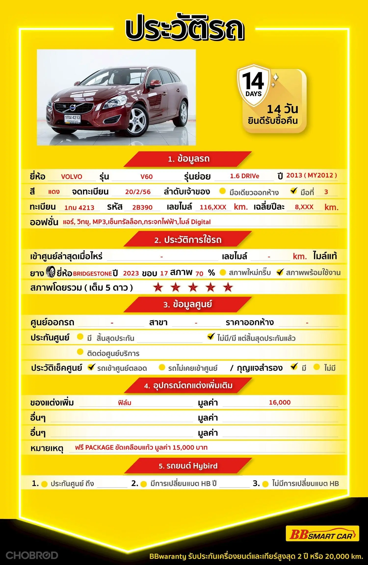 📍BBsmartcar สาขา 2 สี่แยกแครายนนทบุรี VOLVO V60 1.6 DRIVE AT 2013 💸price 259,000 บาท *** Highlight *** VOLVO V60 1.6 DRIVe สี Passion Red ปี 2013 รถสปอร์ตแวกอน (Sport Wagon) ที่ออกแบบมาเพื่อไลฟ์สไตล์คนรุ่นใหม่ ด้วยเครื่องยนต์เบนซินเทอร์โบ 1.6 ลิตร ให้กำลังสูงสุดถึง 180 แรงม้า ตอบสนองได้ทันใจทั้งในช่วงความเร็วต่ำและสูง ช่วงล่างเซตมาแบบ "นุ่มหนึบ" ให้ความมั่นใจในการเข้าโค้ง คันนี้ เลขไมล์เพียง116,700กม. ถือว่าน้อยมากๆ รถศูนย์แท้ ประวัติดี ไร้อุบัติเหตุ สภาพป้ายแดงคุ้มมาก 💎รับประกันโครงสร้างรถ ไม่เคยประสบอุบัติเหตุหนัก พลิกคว่ำ น้ำท่วม หรือไฟไหม้ โครงสร้างและแชสซีอยู่ในสภาพสมบูรณ์ 💎BB Care Plus รับประกันหลังการขายสูงสุด 2 ปี หรือ 20,000 km. 💎ไม่พอใจ ยินดีคืนเงินภายใน 14 วัน 🔥คลิ๊กที่ลิงก์เพื่อดู วิดีโอคันนี้,ประวัติรถ,รูปภาพภายนอกและรูปภายใน https://www.bbsmartcar.com/web-php/index.php/site/cardetail/202603219EBC4299B392 🔥เรามีรถรุ่นนี้ให้เลือกชมอีก 6 คัน https://www.bbsmartcar.com/web-php/index.php/site/car?name_brand=VOLVO&search=one 🔥มีรถให้เลือกมากกว่า 1,800 คัน https://www.bbsmartcar.com/web-php/index.php/site/home NO. 2B390 Brand : VOLVO Year : 2013 Model : V60 Grade : 1.6 DRIVE Engine : 1600 CC. Type : เบนซิน Gearbox : AT Color : แดง Mileage : 116,700 km. (ซื้อสด ราคานี้ยังไม่รวมค่าดำเนินการ 10,000 บ.) เงินดาวน์ : ฟรีเงินดาวน์ ประกันภัย : ฟรีประกันภัย 1 ปี ค่าดำเนินการ : 10,000 บาท รวมออกรถ : 0 บาท ผ่อน72 งวด = 5,557 บาท ผ่อน84 งวด = 5,226 บาท **เงื่อนไขเป็นไปตามที่ไฟแนนซ์กำหนด** โปรโมชั่นพิเศษ สำหรับลูกค้าเครดิตดี 🚩เลือกรับเรทดอกเบี้ยพิเศษ 📍36 งวด = 1.29 % 📍48 งวด = 1.99 % 📍60 งวด = 2.39 % 📍72 งวด = 3.59 % 🔥 เงื่อนไข โปรโมชั่น ดอกเบี้ยเริ่มต้น 1.29% ตลอดอายุสัญญา - ยอดจัดไฟแนนซ์ 300,000-600,0000 บาท - ผ่อนสูงสุด 72 เดือน - เป็นลูกค้าประวัติดี พนักงานประจำเงินเดือน 20,000 ขึ้นไป - ค่าดำเนินการแคมเปญ 20,000 บาท (รวมในยอดจัดได้) 🎗Car Hightlight VOLVO V60 1.6 สีแดงสุดหรู ลำตัวหนา ดูแข็งแกร่งสไตล์สแกนดิเนเวียน โคมไฟหน้าลดต่ำลงมากกว่าเดิม และโค้งมนรับกับเส้นสายด้านข้าง โดยเน้นกระจัง หน้าลายแนวตั้งขนาดใหญ่ ไฟท้ายใหม่ เว้าเข้ารูปยิ่งขึ้น 🎗ภายใน. ภายในออกแบบใหม่หมด คอนโซลหน้าแบบยกให้พื้นที่วางขา มาตรวัดทรงกลม พร้อมจอ แสดงข้อมูล ระบบควบคุม และระบบกรองอากาศ พวงมาลัย multifunction เป็นรถสวยแห่งสวีเดน ช่องแอร์ขนาดใหญ่ กระจายลมได้เร็ว 🎗ภายนอก. รถกว้าง โครงสร้างแข็งแกร่งสไตล์สแกนดิเนเวียน โคมไฟหน้าลดต่ำลงมากกว่าเดิม และโค้งมนรับกับเส้นสายด้านข้าง โดยเน้นกระจัง หน้าลายแนวตั้ง ขนาดใหญ่ ไฟท้ายใหม่ เว้าเข้ารูปยิ่งขึ้น 🎗ความคุ้มค่า รถสภาพนี้หายากมากค่ะบอกเลย รถมือเดียววิ่งน้อยอีกด้วย คัดเลือกคันนี้มาแล้วค่ะสภาพดีมากๆ เทียบกับราคานี้ถือว่าคุ้มค่ามากๆค่ะ ⭐️การรับประกันหลังการขาย BB Care Plus สูงสุด 2 ปี หรือ 20,000 km. ด้วยช่างที่ผ่านการอบรมจากศูนย์ช